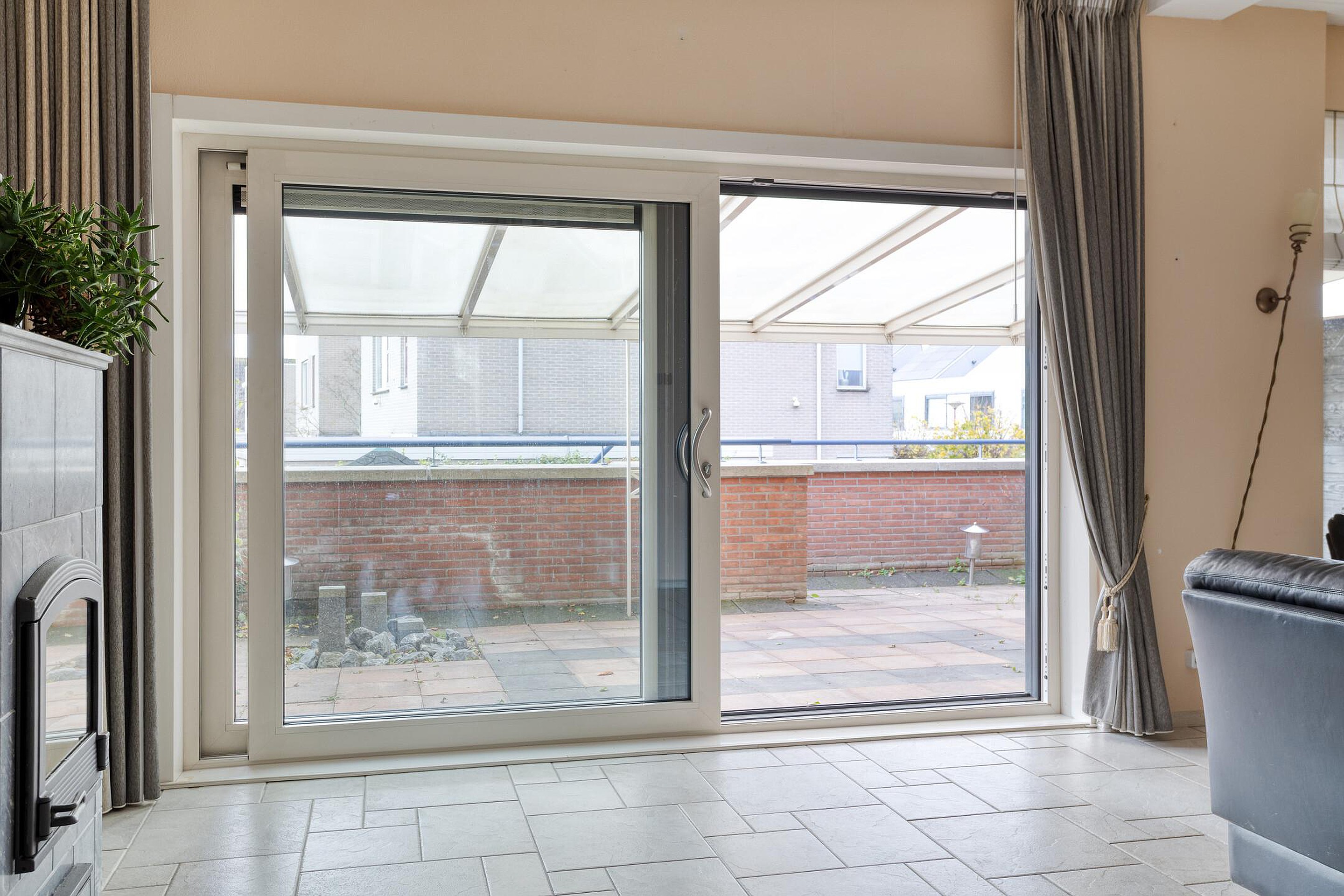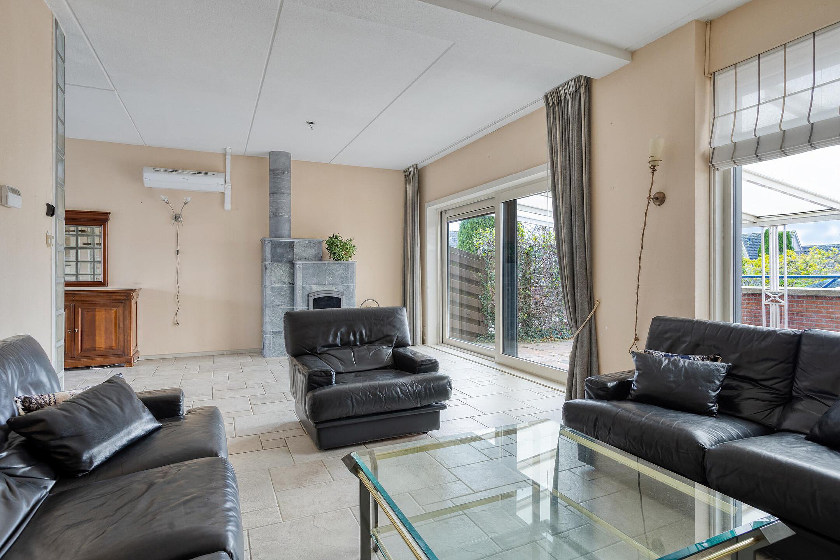 De eerste verdieping vormt het hart van de woning en is ingericht als comfortabele leefruimte. De woonkamer is heerlijk licht dankzij de grote raampartijen en biedt meer dan voldoende ruimte voor een royale zithoek. De prachtige Tulikivi houtkachel uit Finland vormt een sfeervolle blikvanger en zorgt voor aangename warmte op koudere dagen. Ook bevinden zich hier twee airco-units. Via de grote schuifpui komen we uit op het royale dakterras, een trap naar beneden brengt ons naar de tuin met tuinhuis. U kunt eventueel ook via deze tuin, via de poort, achterom de woning verlaten. Al met al een compleet buitenleven waar u heerlijk kunt genieten van een etentje of een gezellige borrel.
