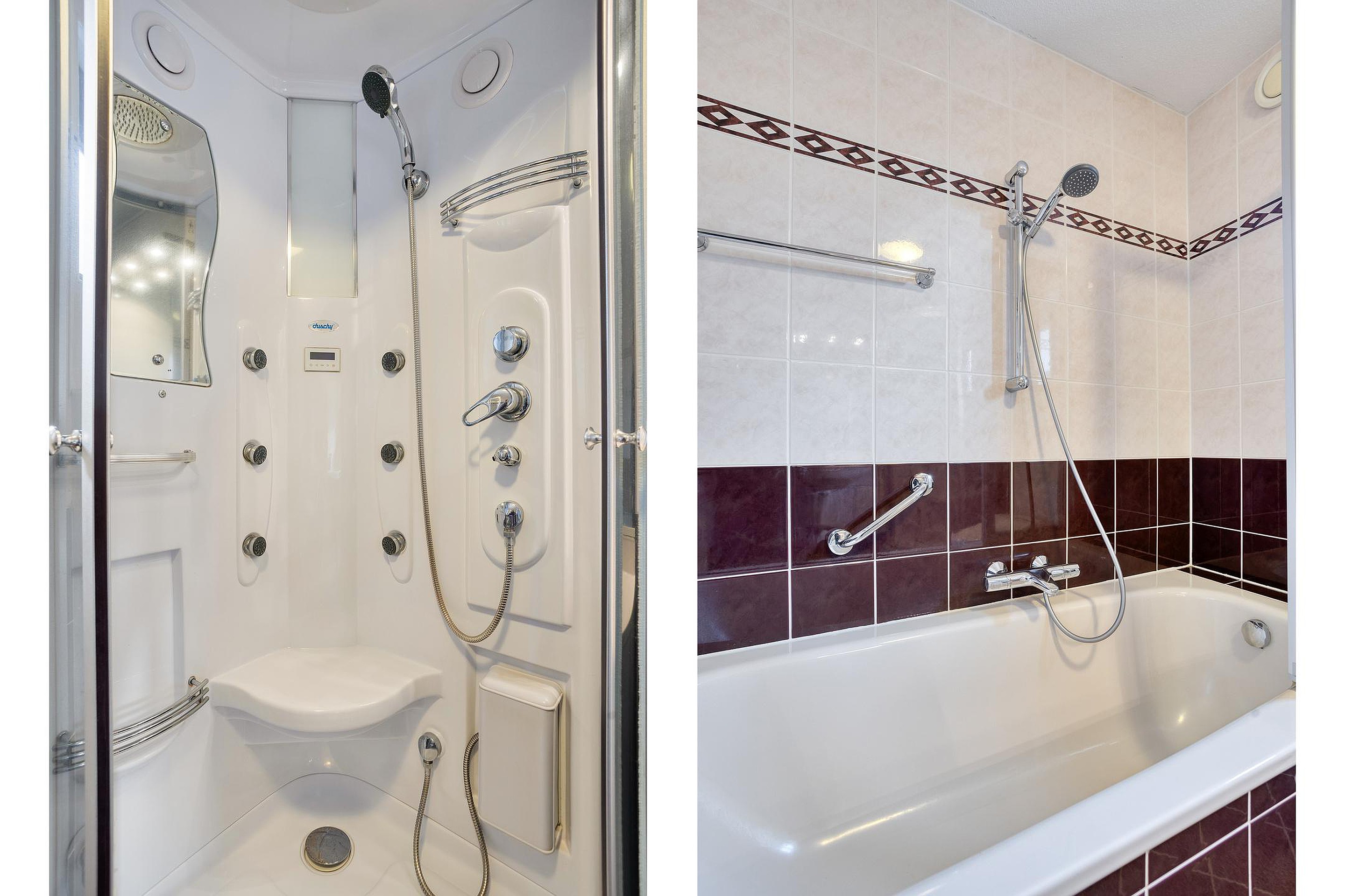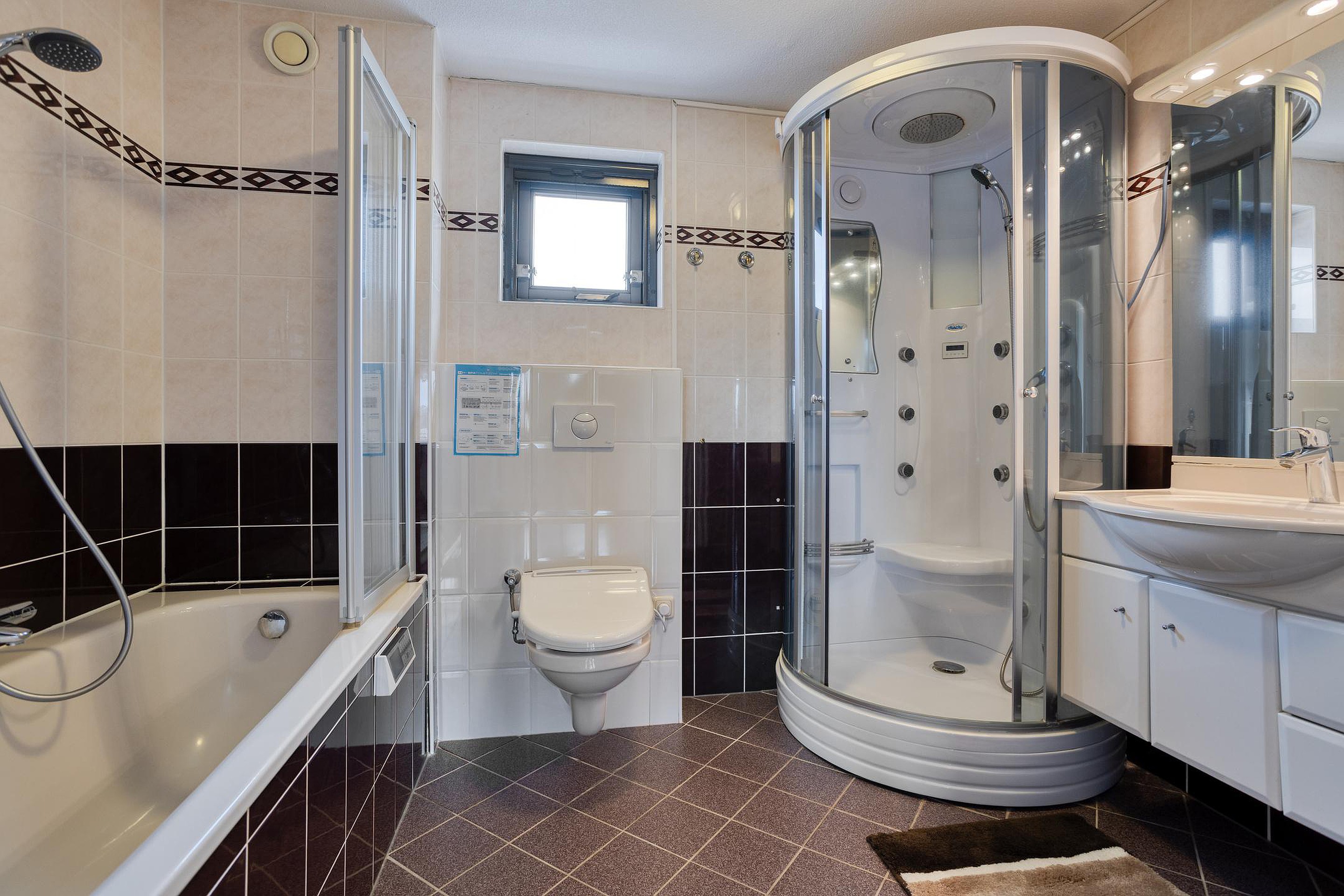 - Badkamer met regendouche, massagestralen, spa-toilet en ligbad