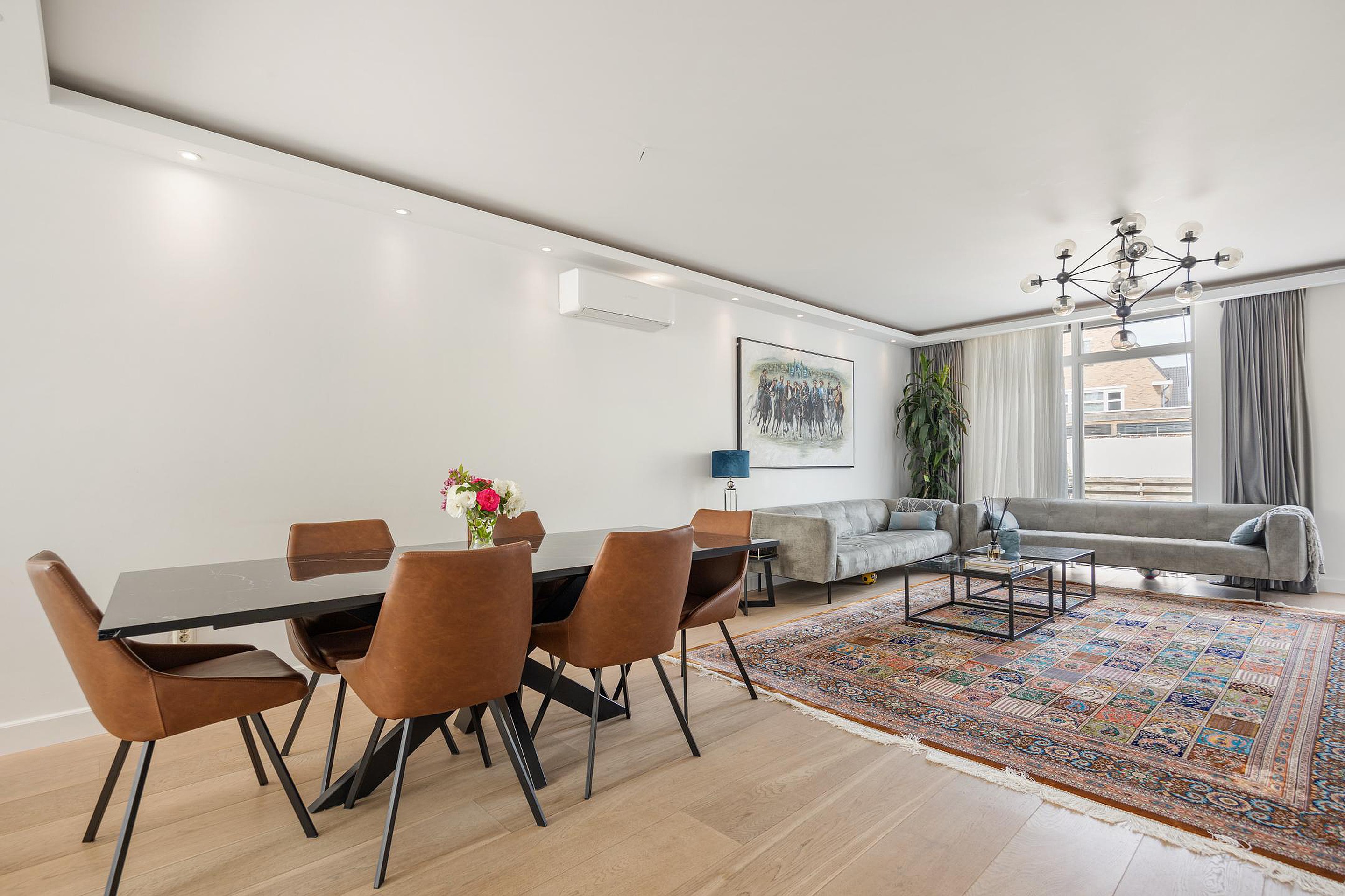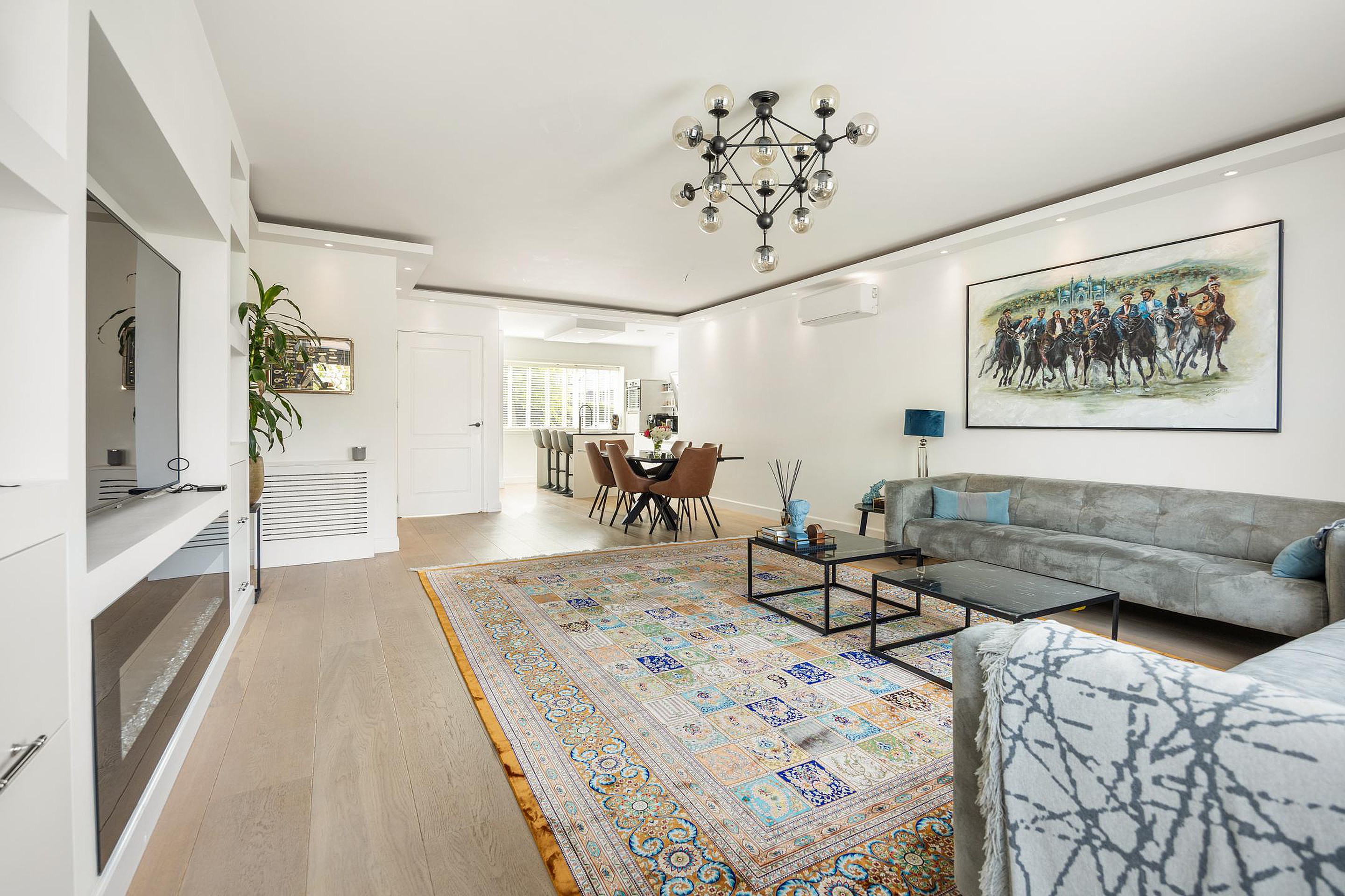 De tuingerichte woonkamer is voorzien van een cinema wall met geïntegreerde sierhaard, sierlijsten met indirecte verlichting, en airconditioning.
