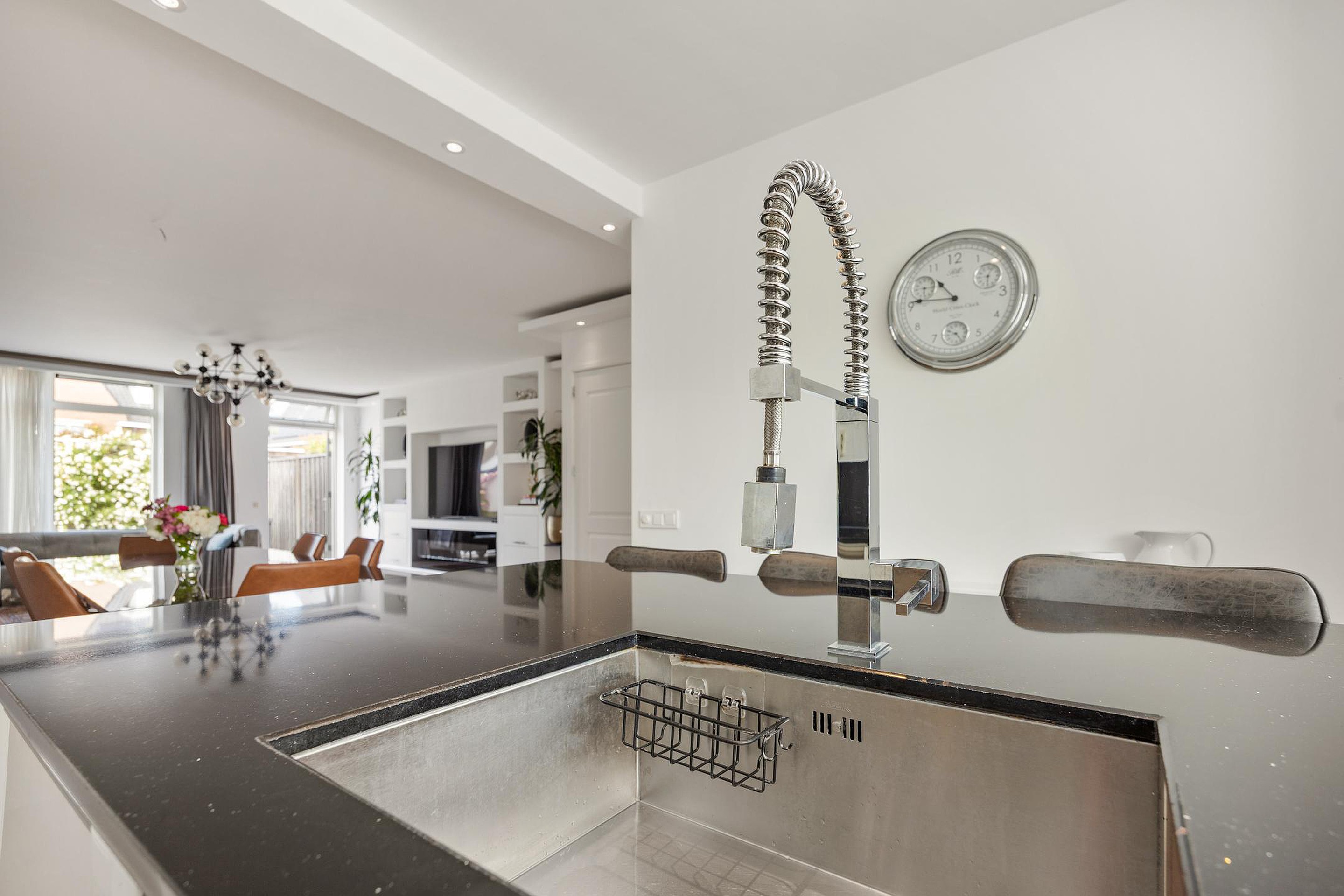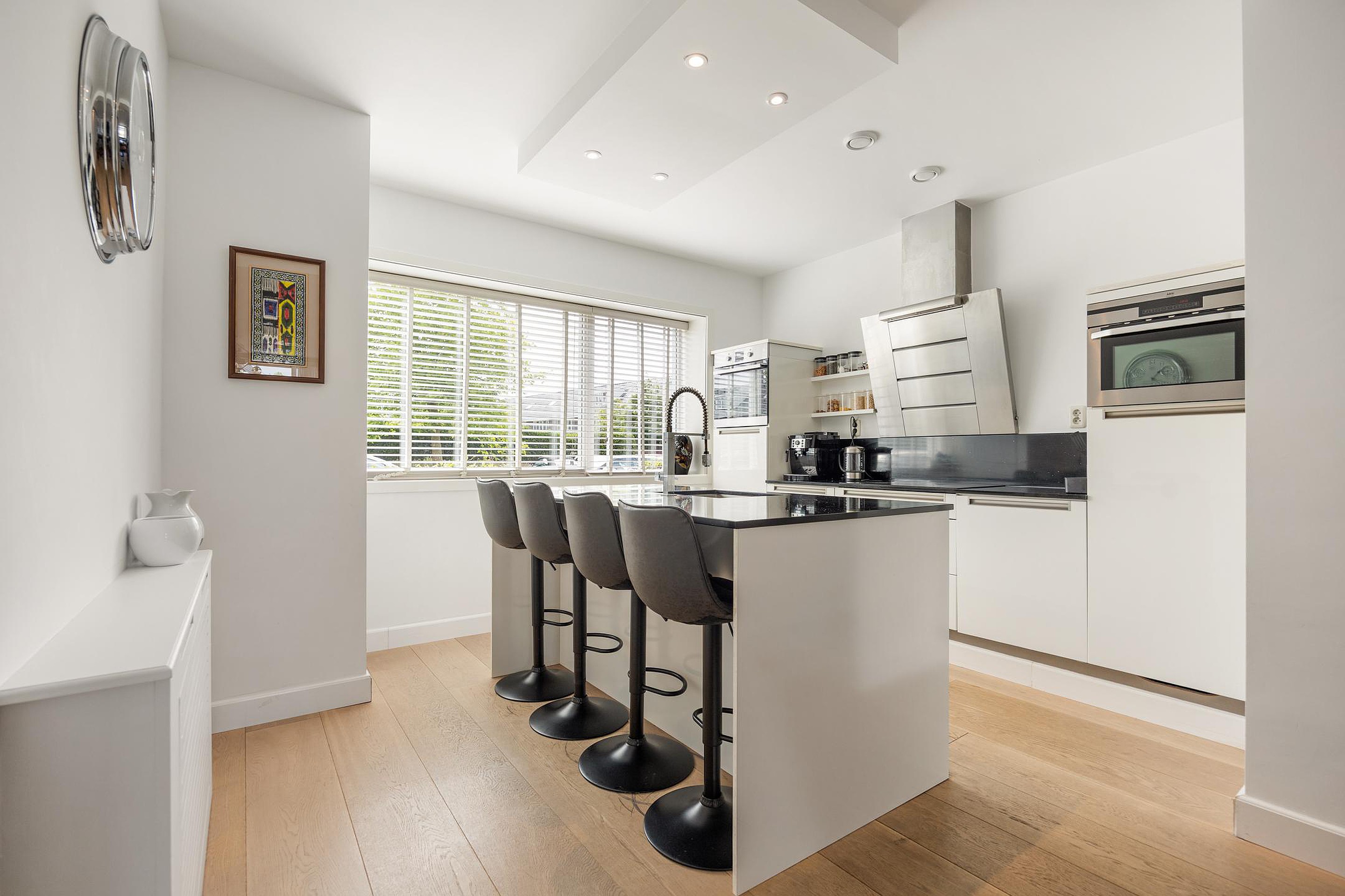 Aan de voorzijde bevindt zich de luxe keuken met spoeleiland, uitgerust met hoogwaardige inbouwapparatuur: combi-oven, kookplaat, afzuiging, koelkast, vriezer en vaatwasser.