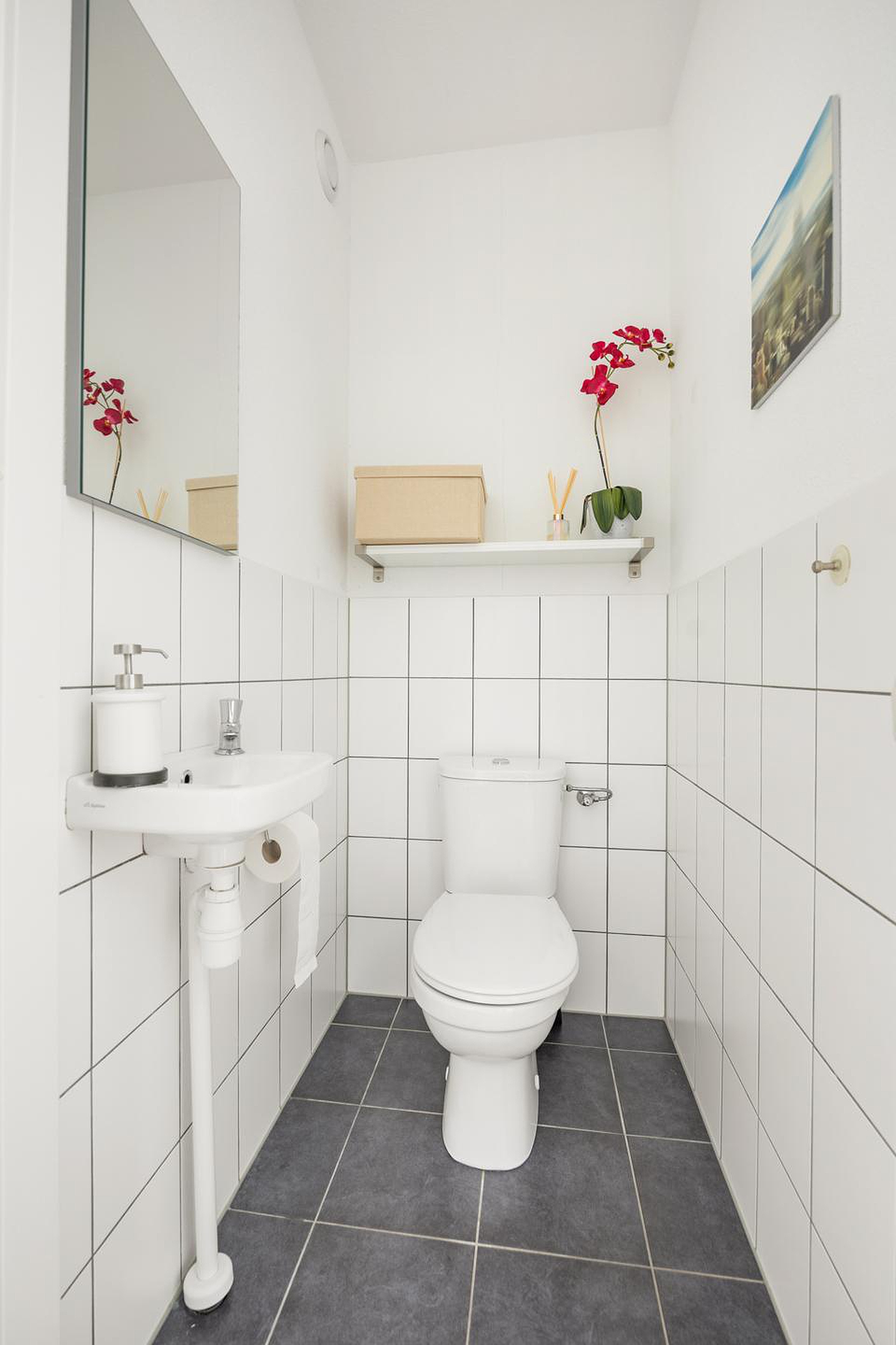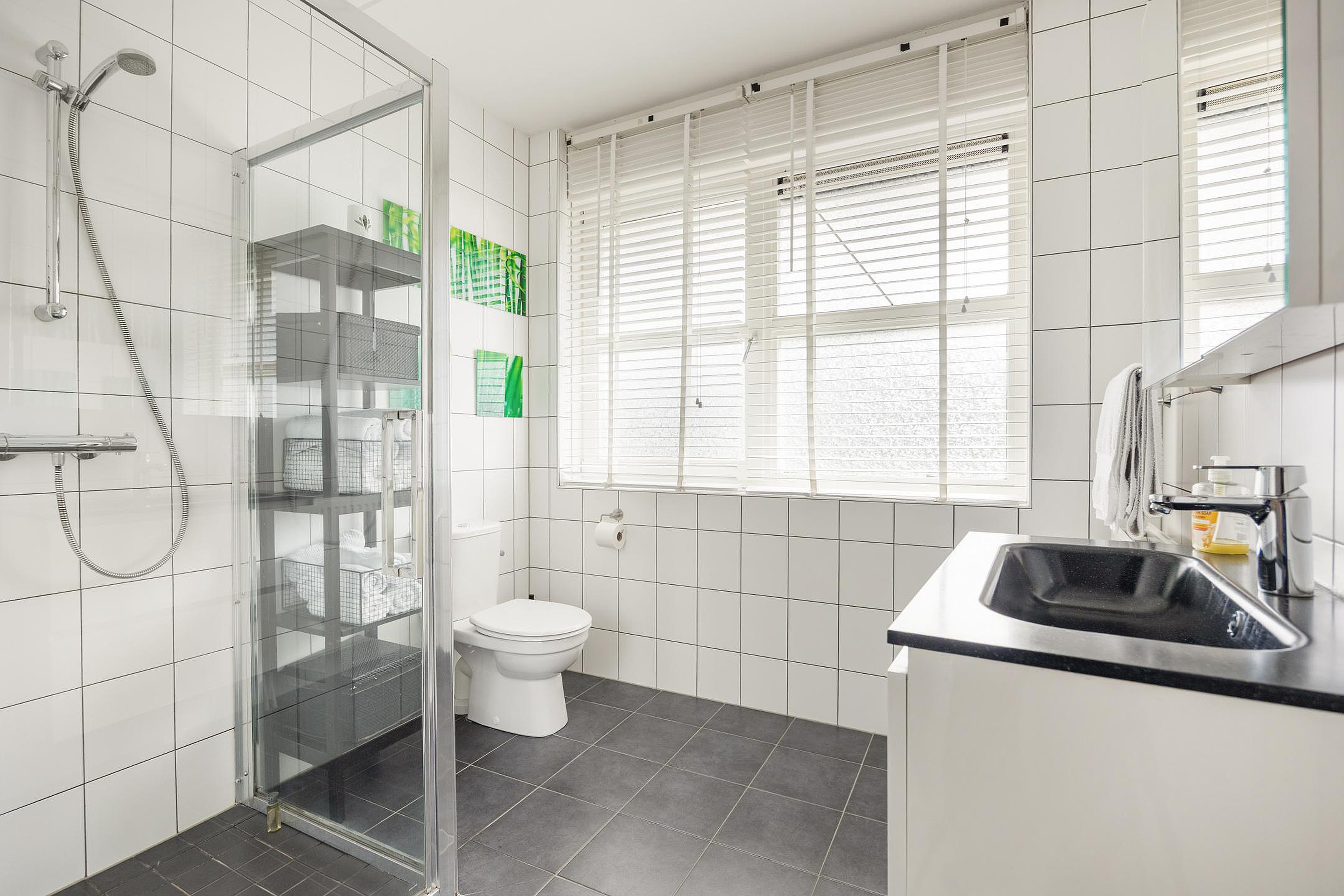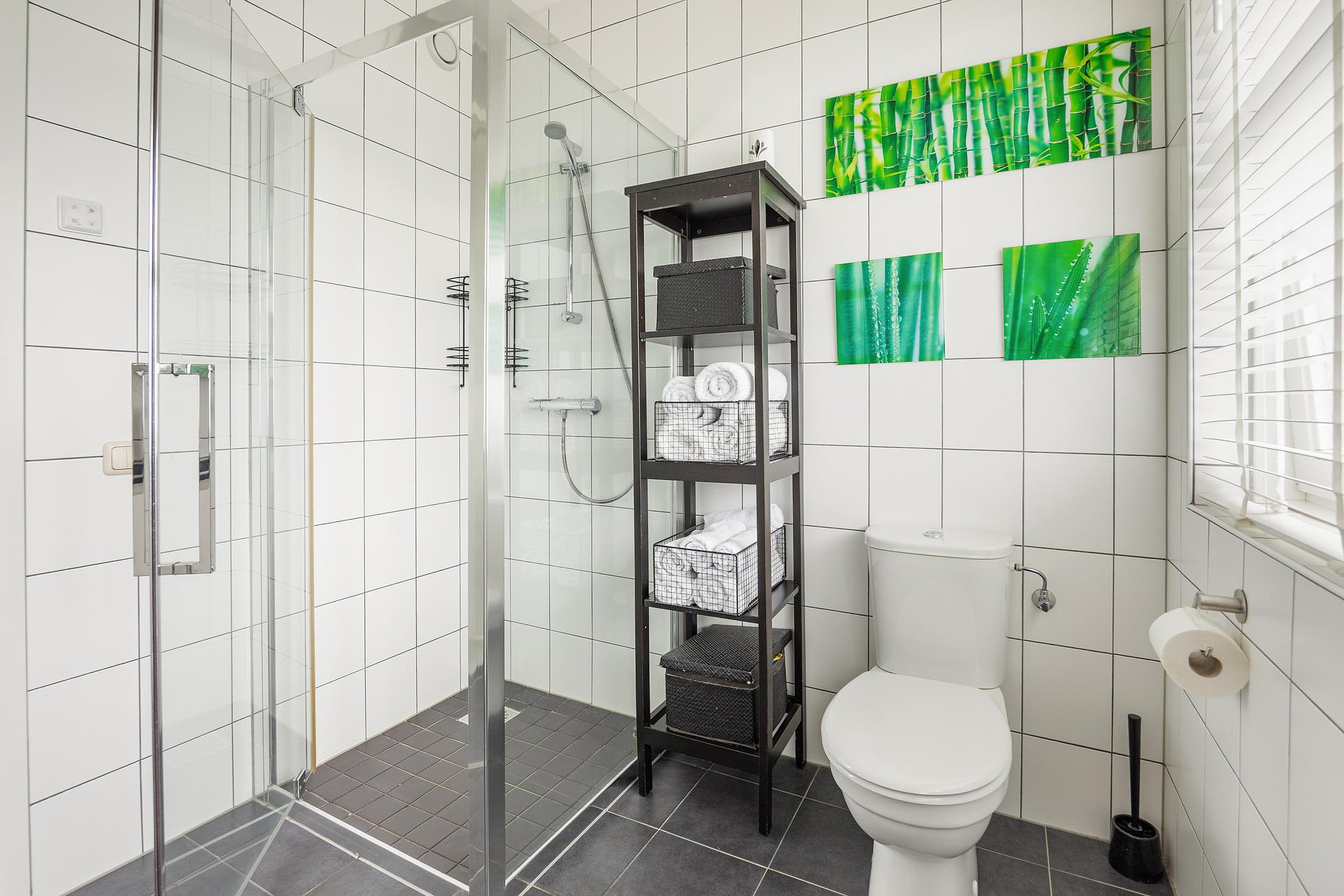 De royale badkamer is uitgevoerd in een lichte kleurstelling en beschikt over een douche, wastafelmeubel en tweede toilet.