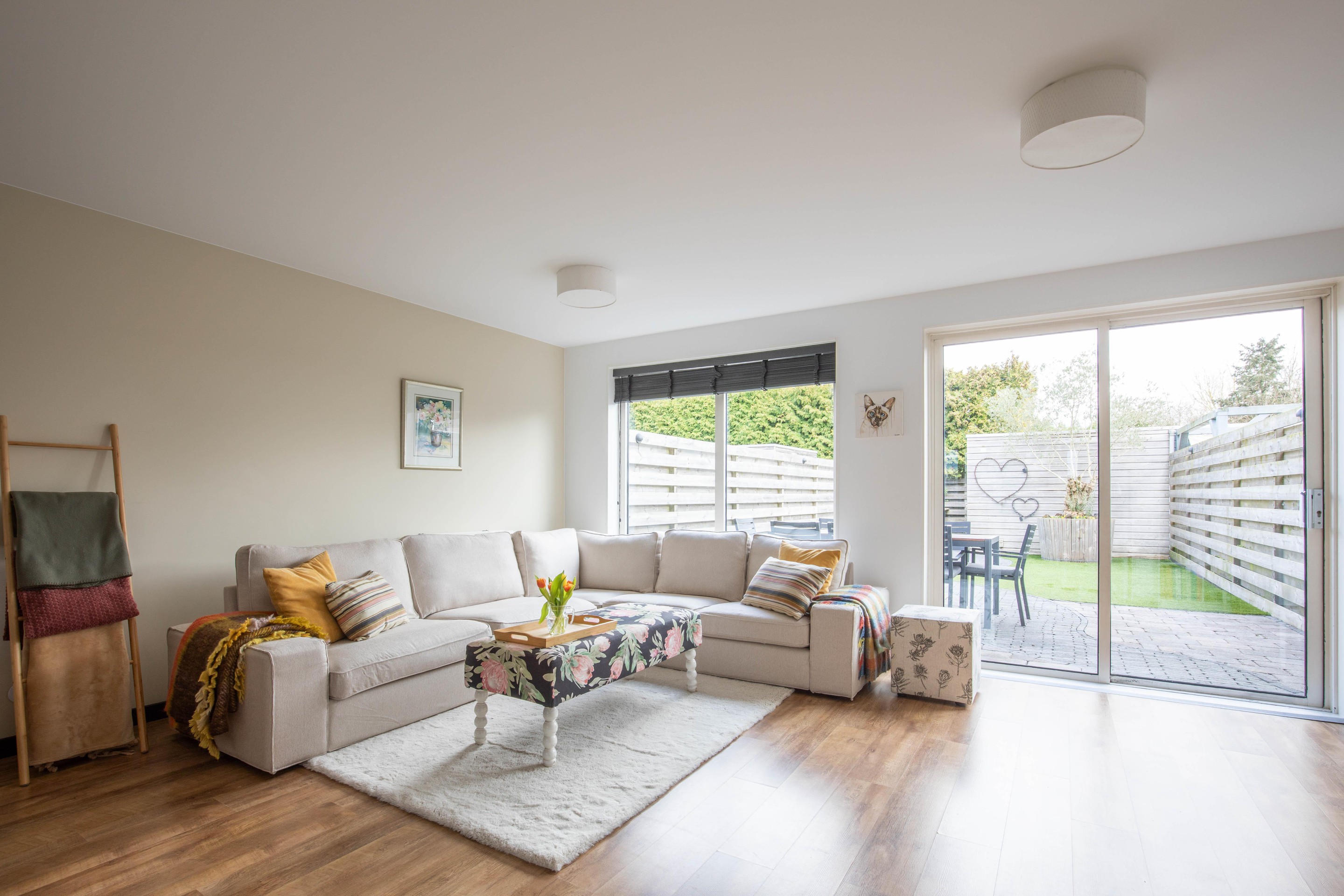 The garden-facing living room is bright and spacious, with large windows and a sliding door providing direct access to the private rear garden. The layout offers ample room for both a comfortable seating area and a dining space.