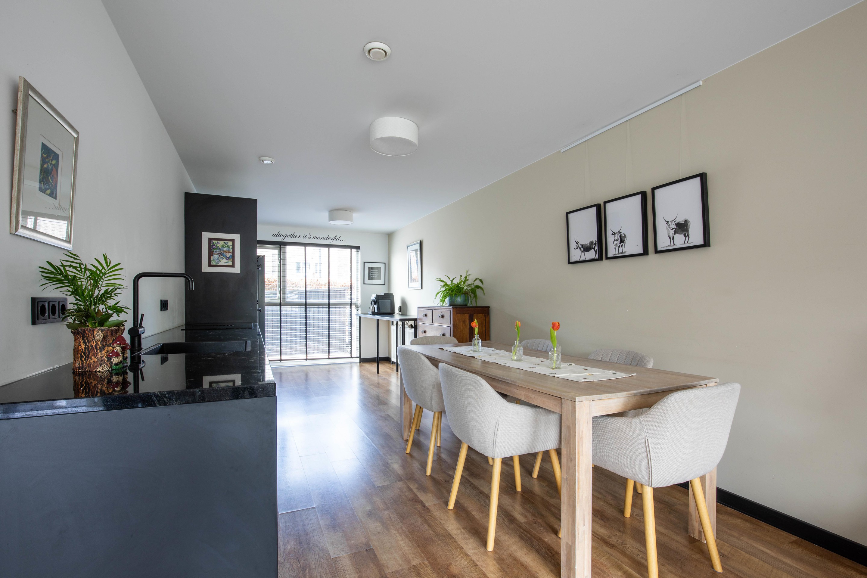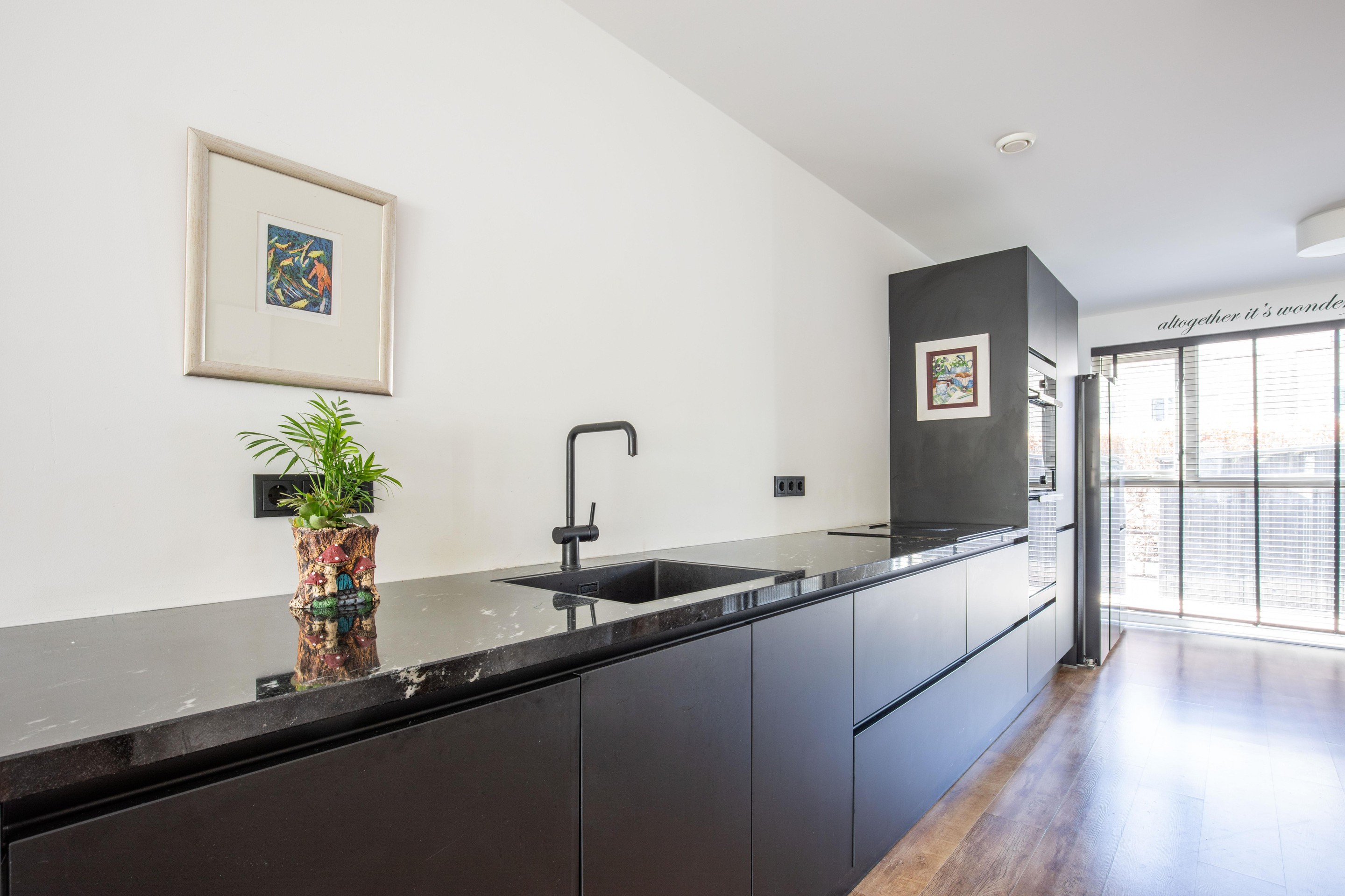 At the front of the property, the open-plan kitchen (2021) is finished in a sleek black design and equipped with various built-in appliances. There is also space for a cosy dining setup.