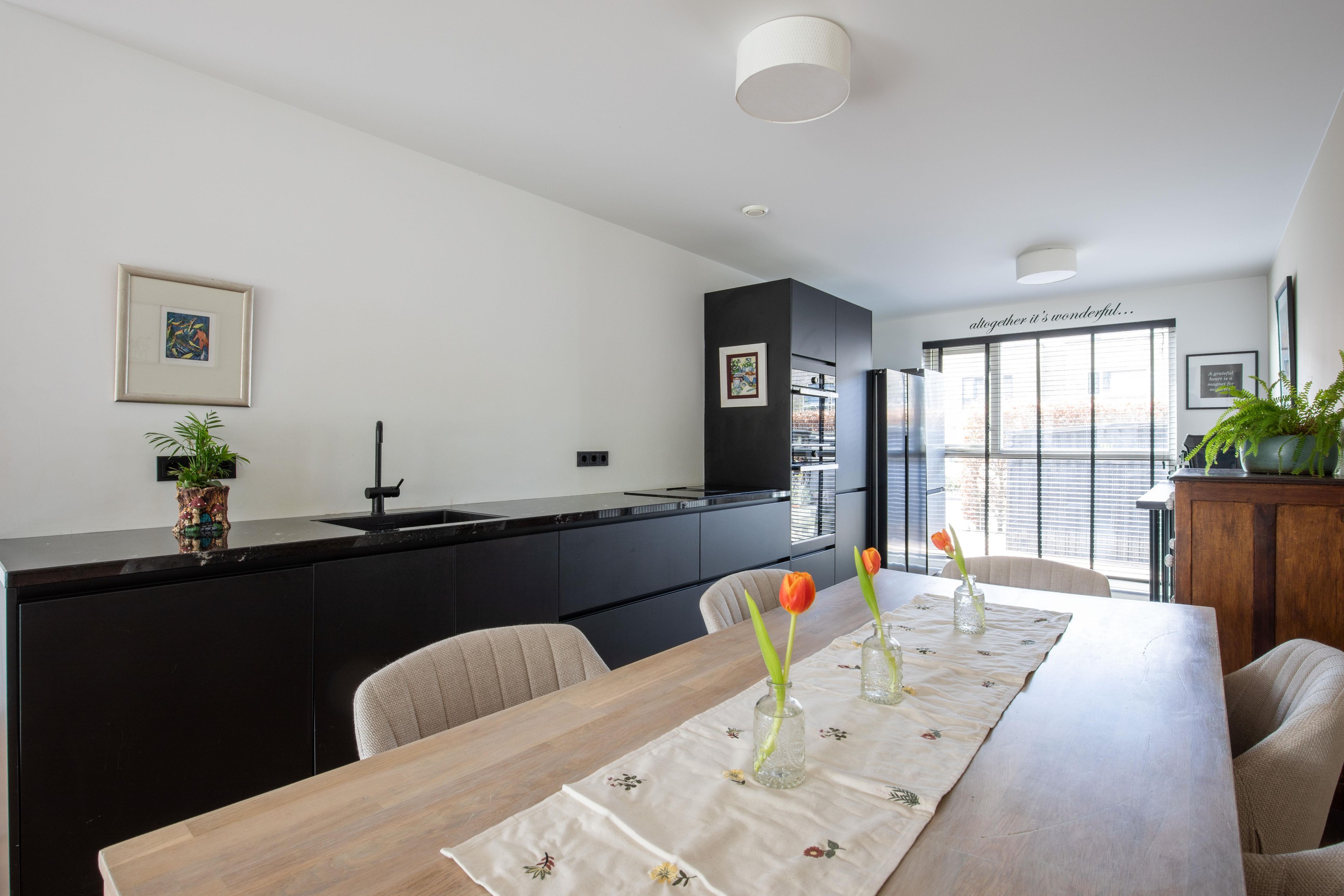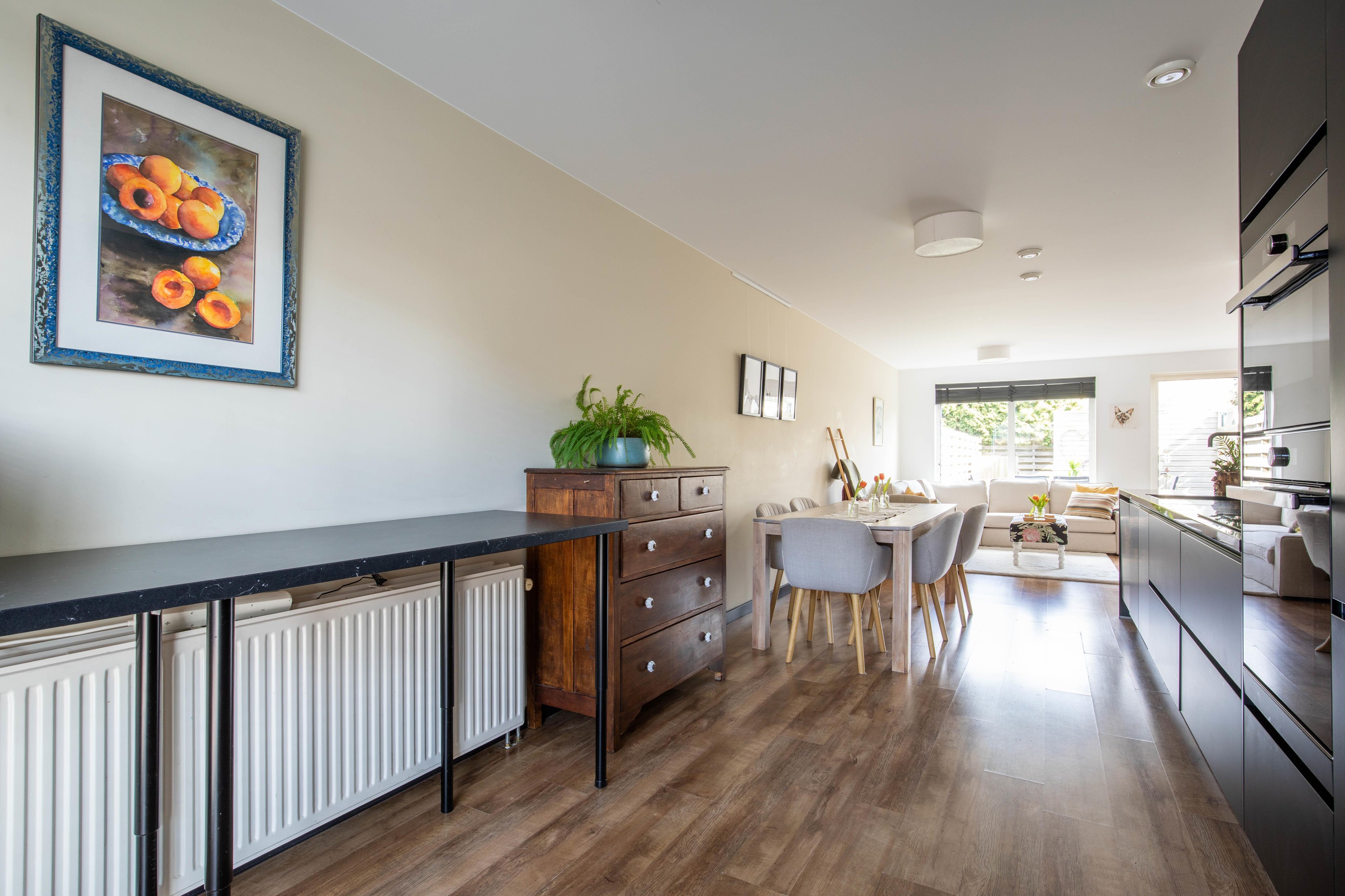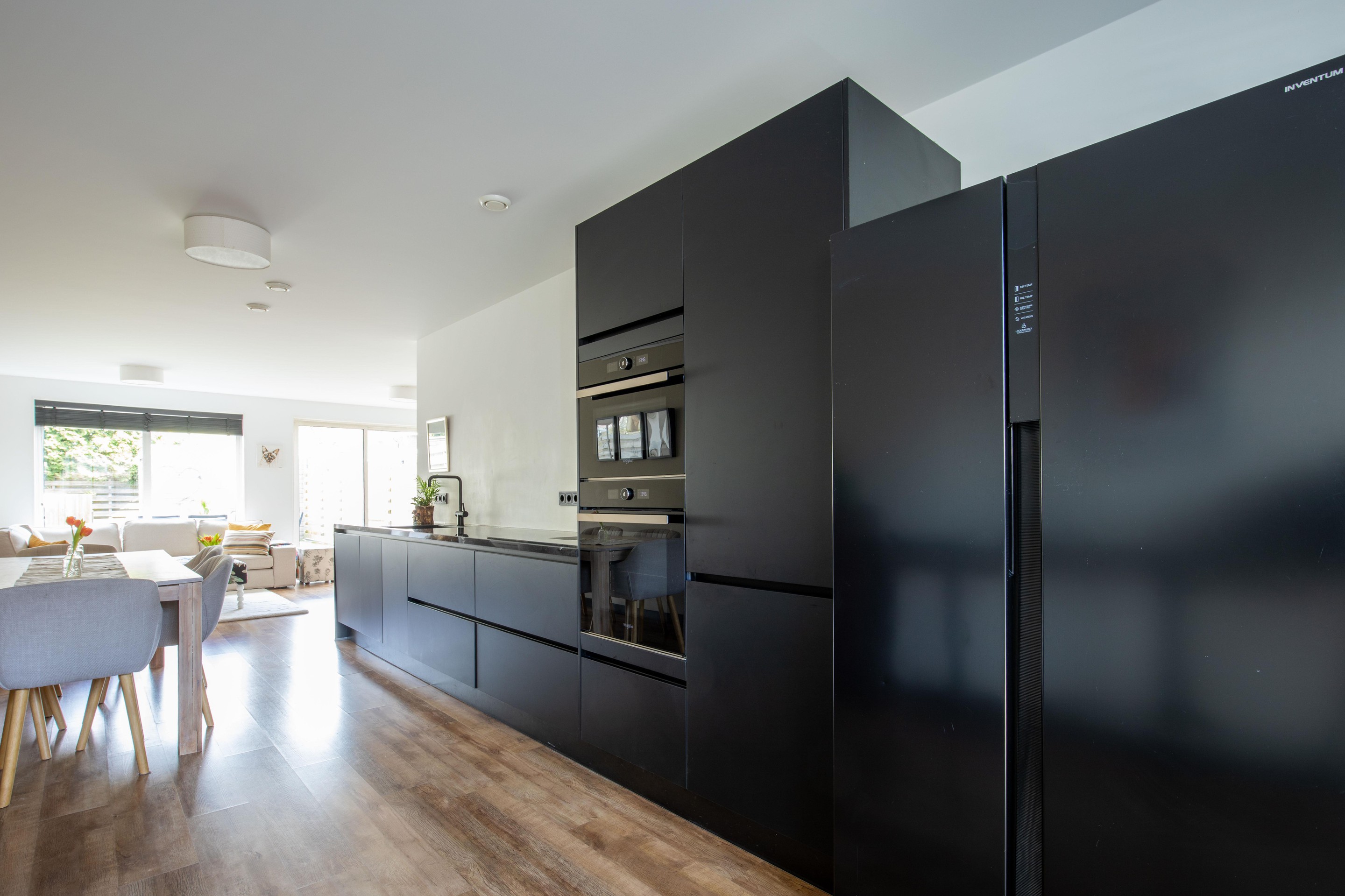 Aan de voorzijde bevindt zich de open keuken (2021), uitgevoerd in een strakke zwarte opstelling en voorzien van diverse inbouwapparatuur. Er is tevens ruimte voor een gezellige eethoek.