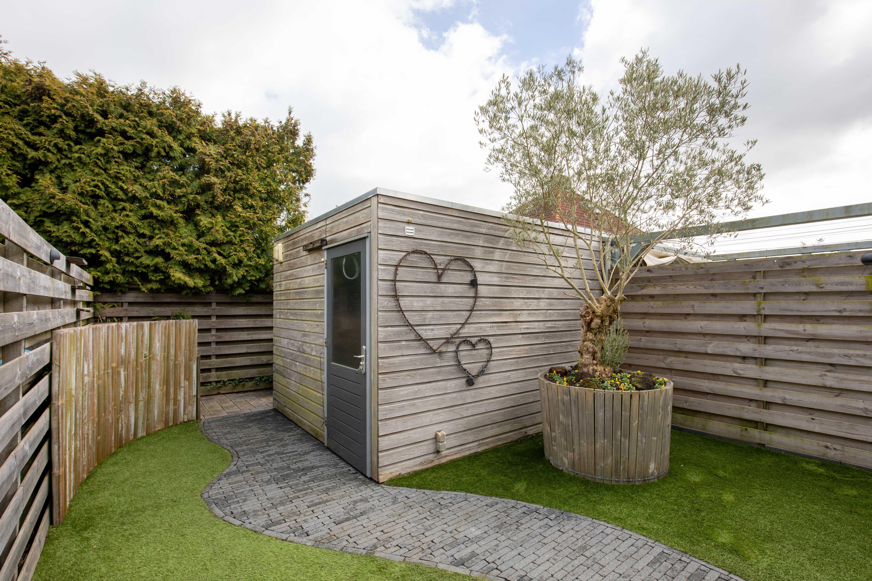 In addition, the property features a practical bicycle storage at the front with space for up to four bicycles, as well as a detached wooden storage unit at the rear. The rear shed is equipped with lighting, electricity, and a laminate floor over a concrete base, making it suitable for multiple uses.