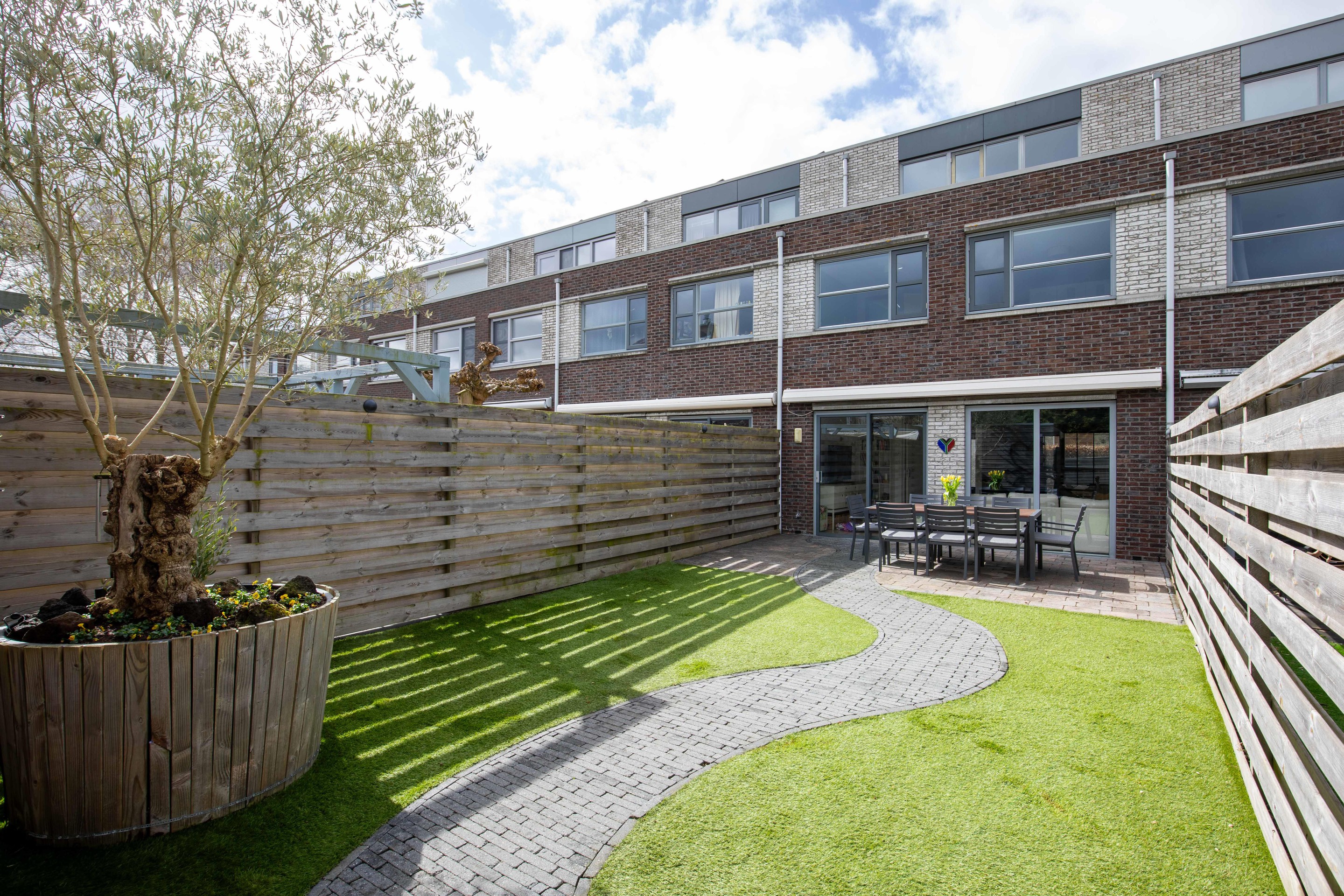 Een elektrisch bedienbaar zonnescherm zorgt voor extra comfort en de olijfboom geeft de tuin een sfeervolle uitstraling.