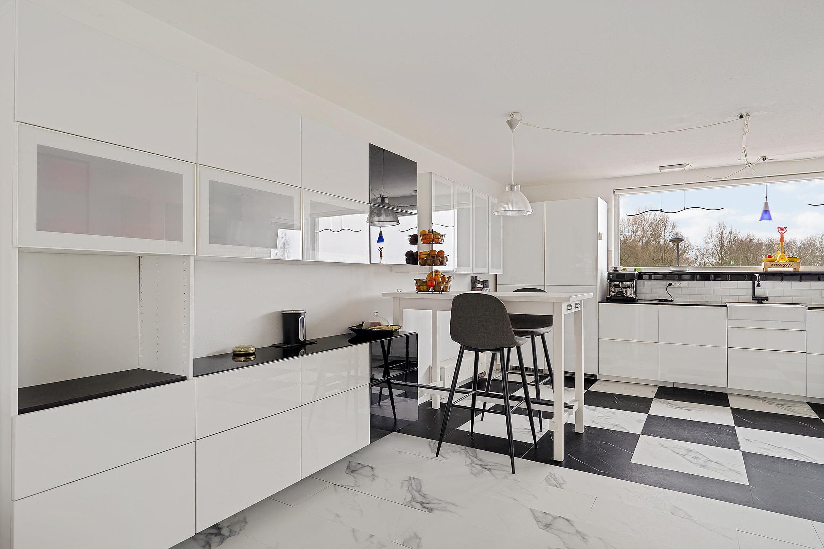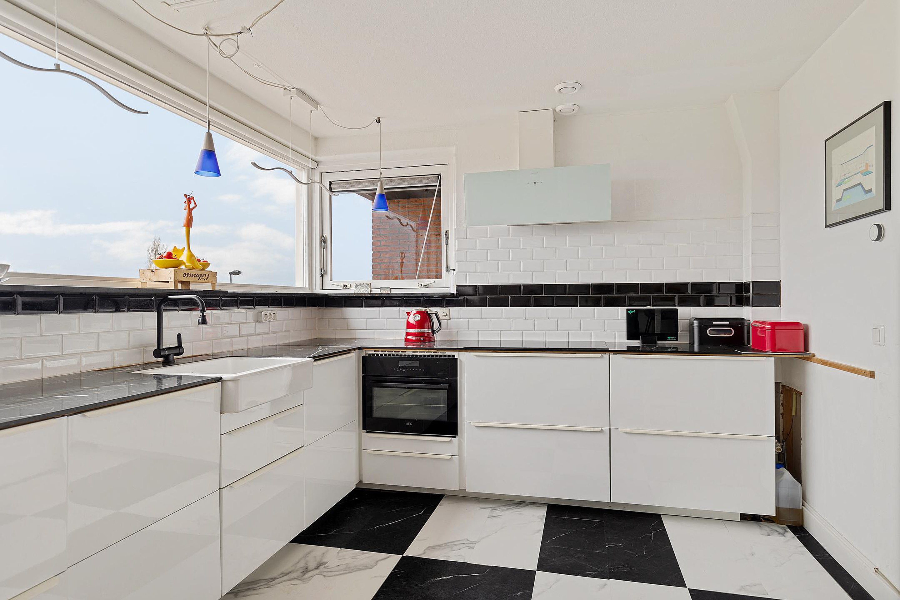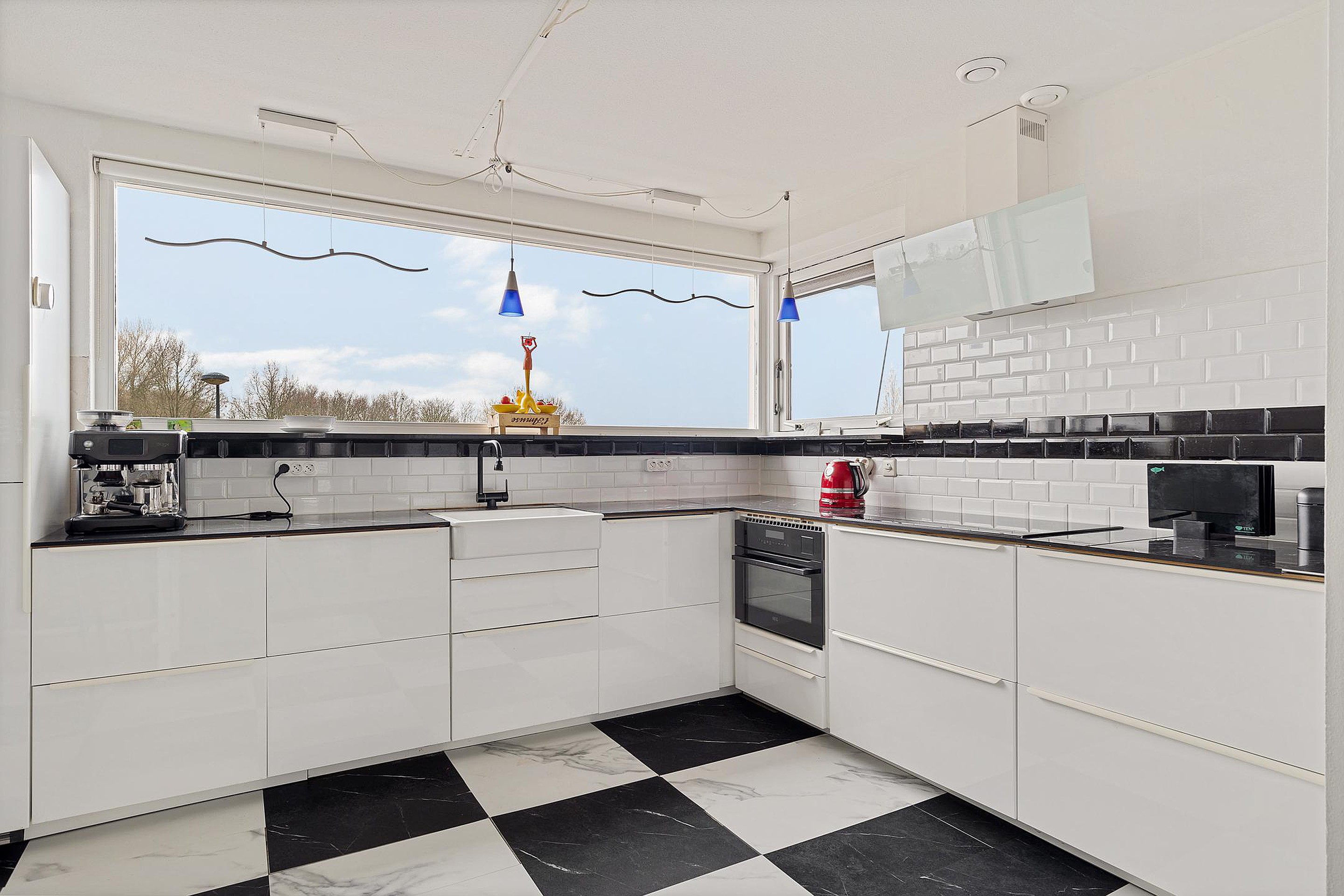 Aan de voorzijde bevindt zich de open keuken, uitgevoerd in een stijlvolle opstelling en voorzien van diverse inbouwapparatuur en een fraai aanrechtblad. Vanuit hier geniet u van een vrij en groen uitzicht over de straat en het park, wat zorgt voor een aangename lichtinval en een ruimtelijk gevoel.