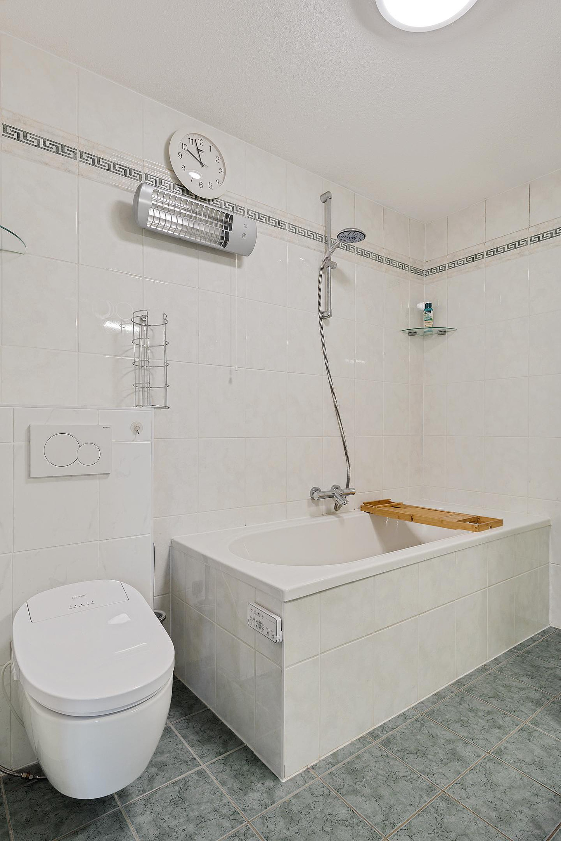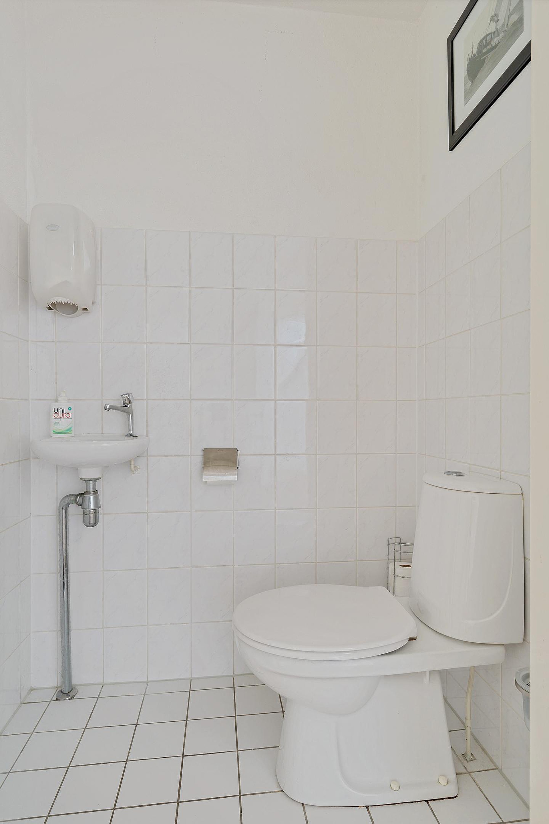 De modern en licht betegelde toiletruimte is voorzien van een fonteintje en afgewerkt in een frisse, tijdloze kleurstelling.