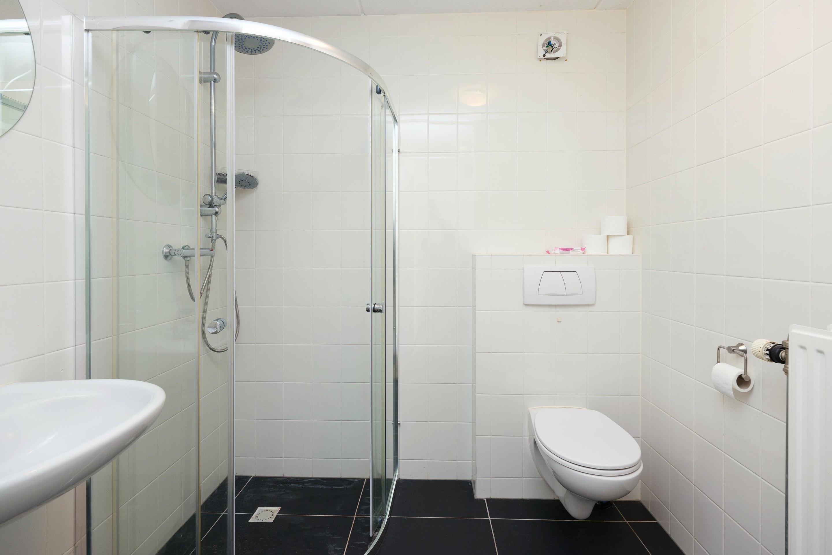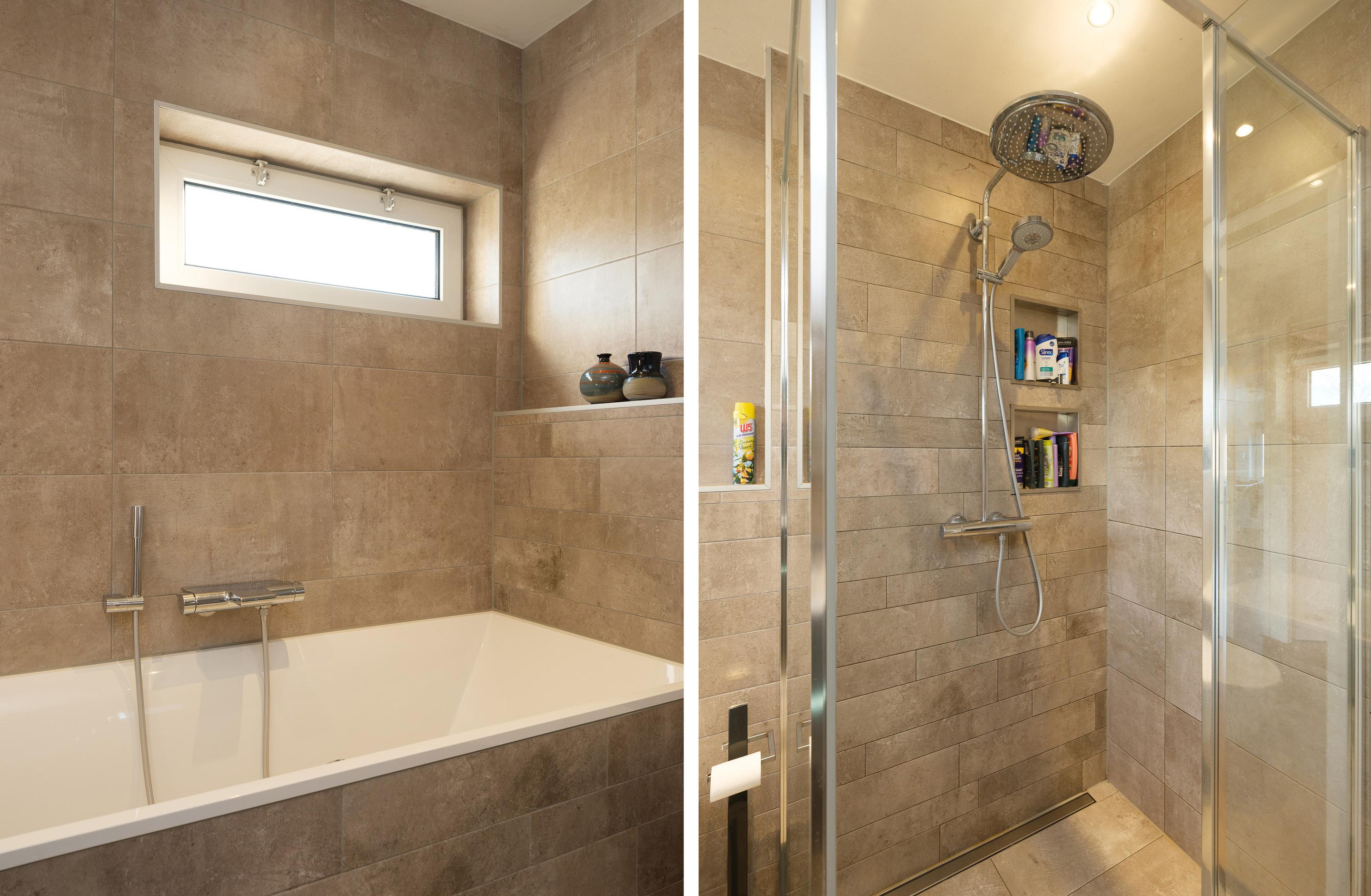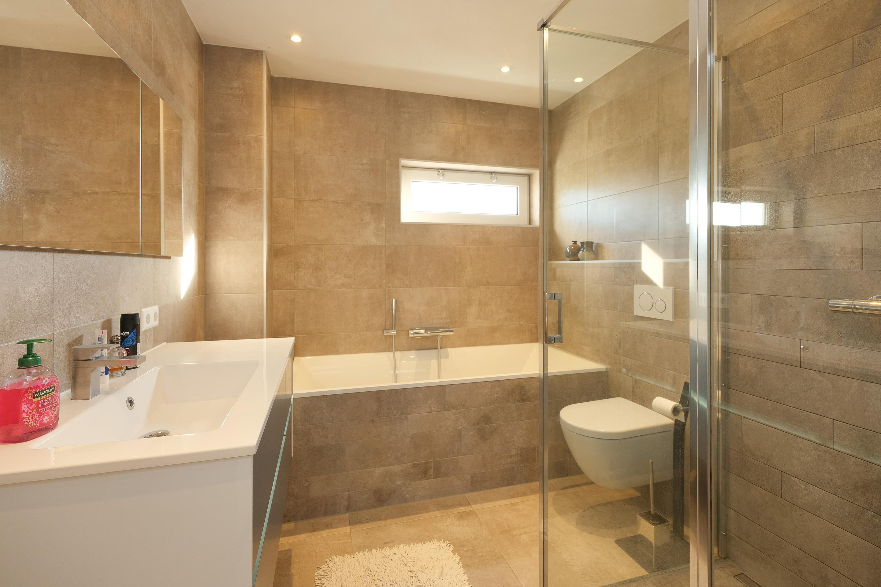De ruime overloop geeft, naast de hoofdslaapkamer, toegang tot twee slaapkamers van goed formaat en een heerlijk ruime, moderne badkamer met inloopdouche, een ligbad, wastafelmeubel en 2e vrij hangend toilet. De badkamer is volledig betegeld in neutrale kleurstelling. Er is een aparte ruimte voor de wasmachine-/droger opstelling waar ook de CV-ketel en mechanische ventilatie unit zijn geïnstalleerd. Alle kozijnen zijn in kunststof uitgevoerd en voorzien van draai-/kiepramen, de vloer is van laminaat.