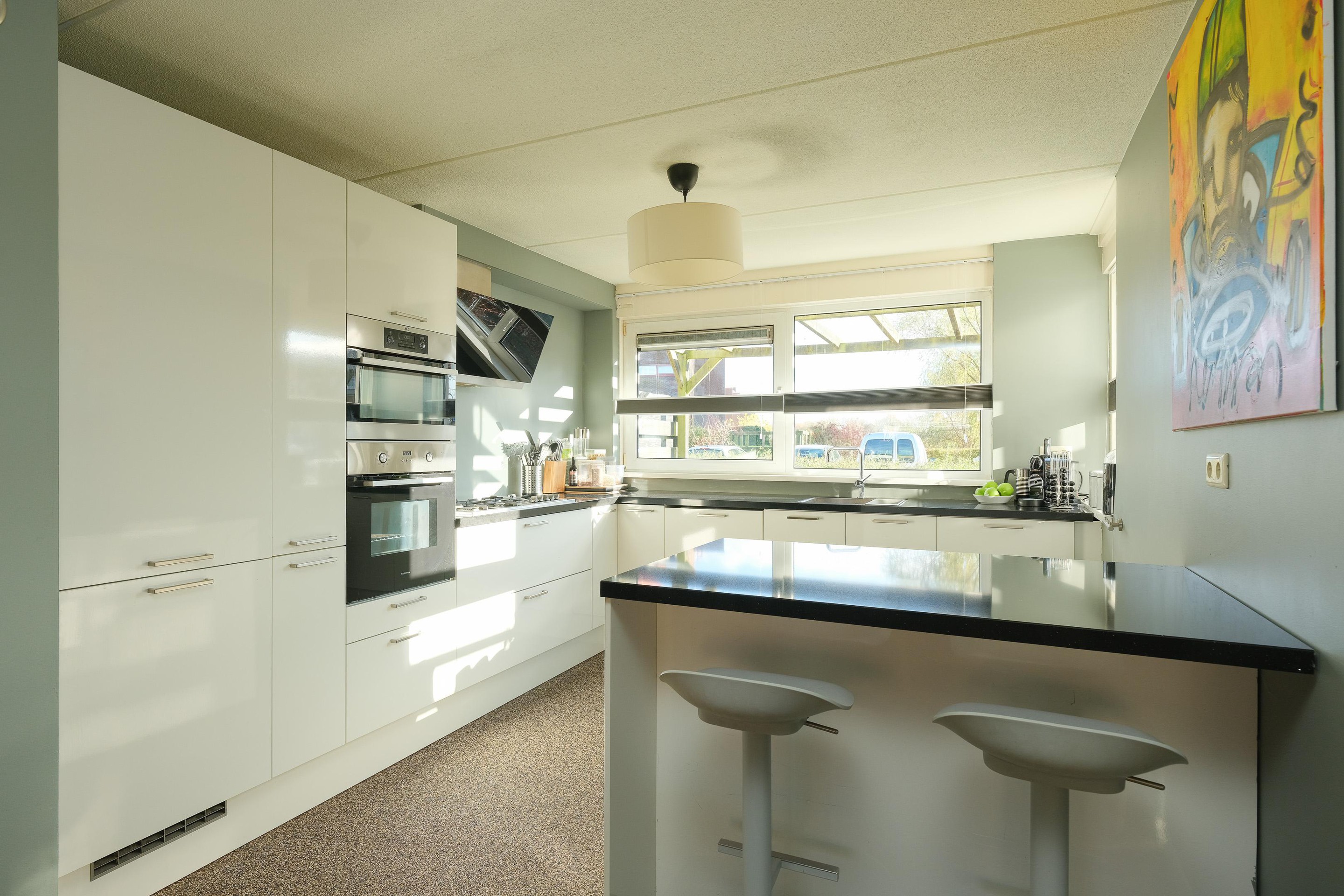 Begane grond Entree; een brede hal met meterkast, garderobe en toegang tot de tuingerichte woonkamer, met een houthaard (met warmtedistributie) en kunststof schuifpui naar de achtertuin. De open keuken ligt aan de voorzijde in hoekopstelling met een eiland/eetbar met extra bergruimte.