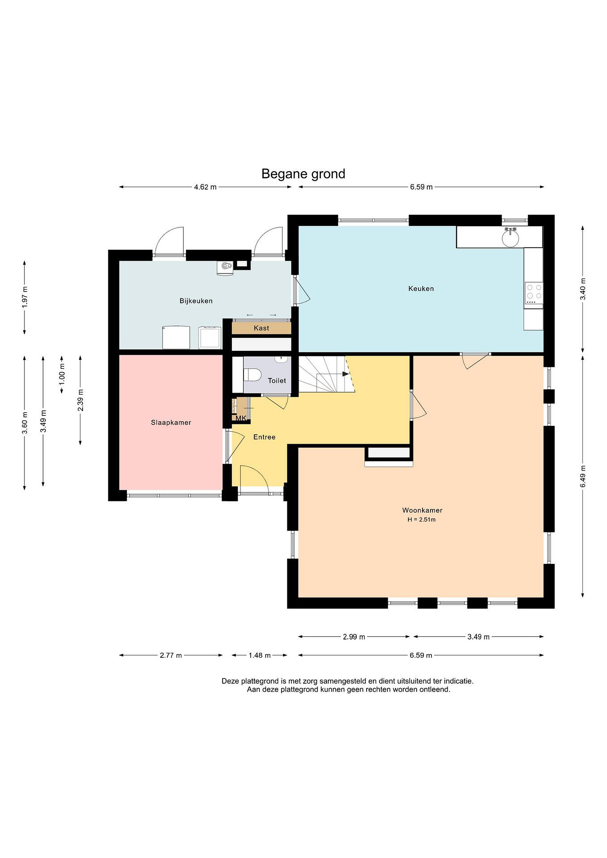 Begane grond entree/ruime hal, meterkast, toilet, trapopgang, ruime woonkamer, leefkeuken met diverse inbouwapparatuur, bijkeuken met witgoedaansluitingen en een inbouwkast. Via de hal is de slaap/werkkamer te bereiken.