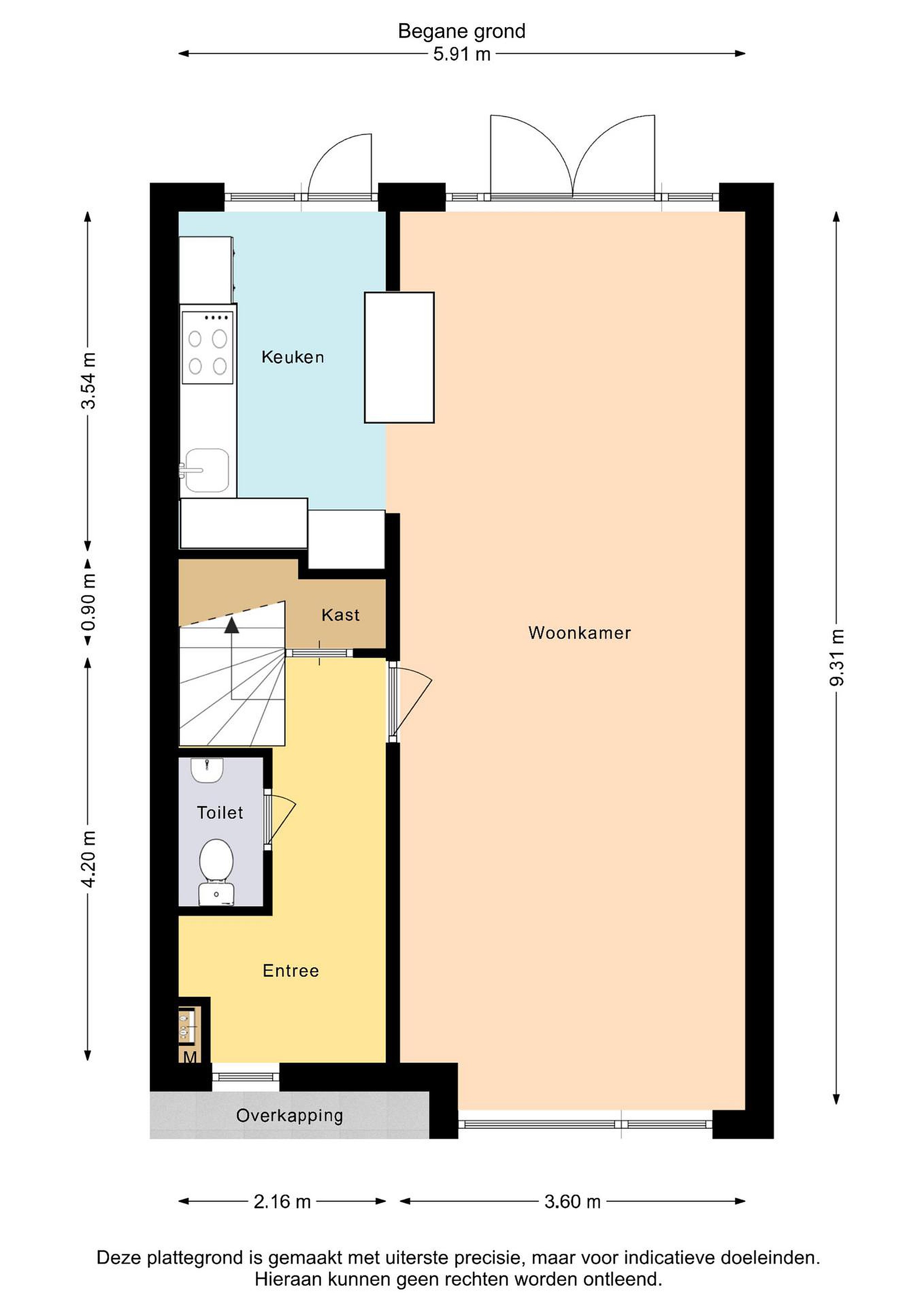 Begane grond entree/hal, meterkast, toilet met fontein, trapopgang, bergkast, doorzon woonkamer met openslaande deuren naar de tuin, moderne keuken met eiland en diverse inbouwapparatuur zoals: oven, magnetron, inductiekookplaat, afzuigkap, vaatwasser en koel-vriescombinatie. In de keuken is nog een deur naar de tuin.