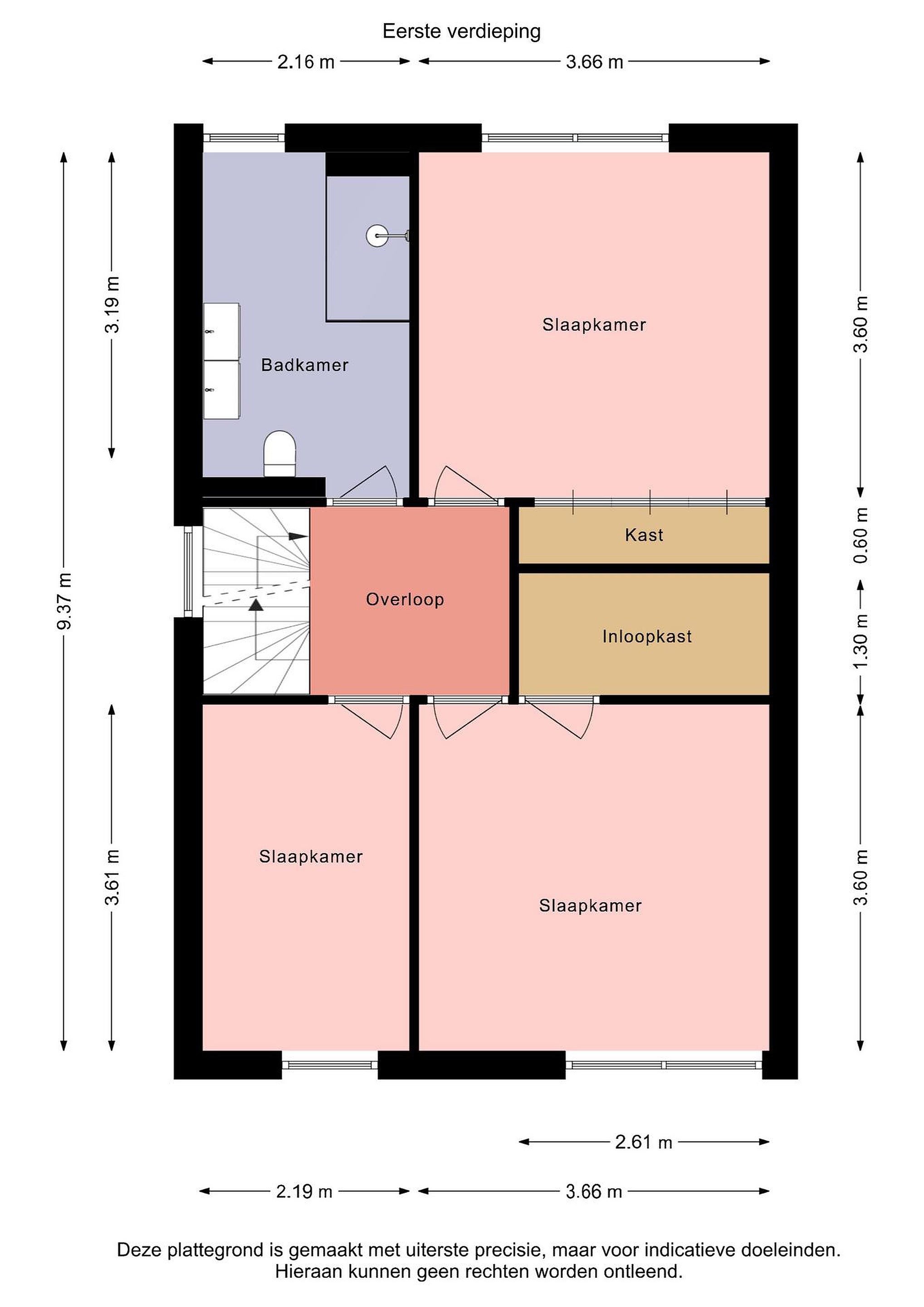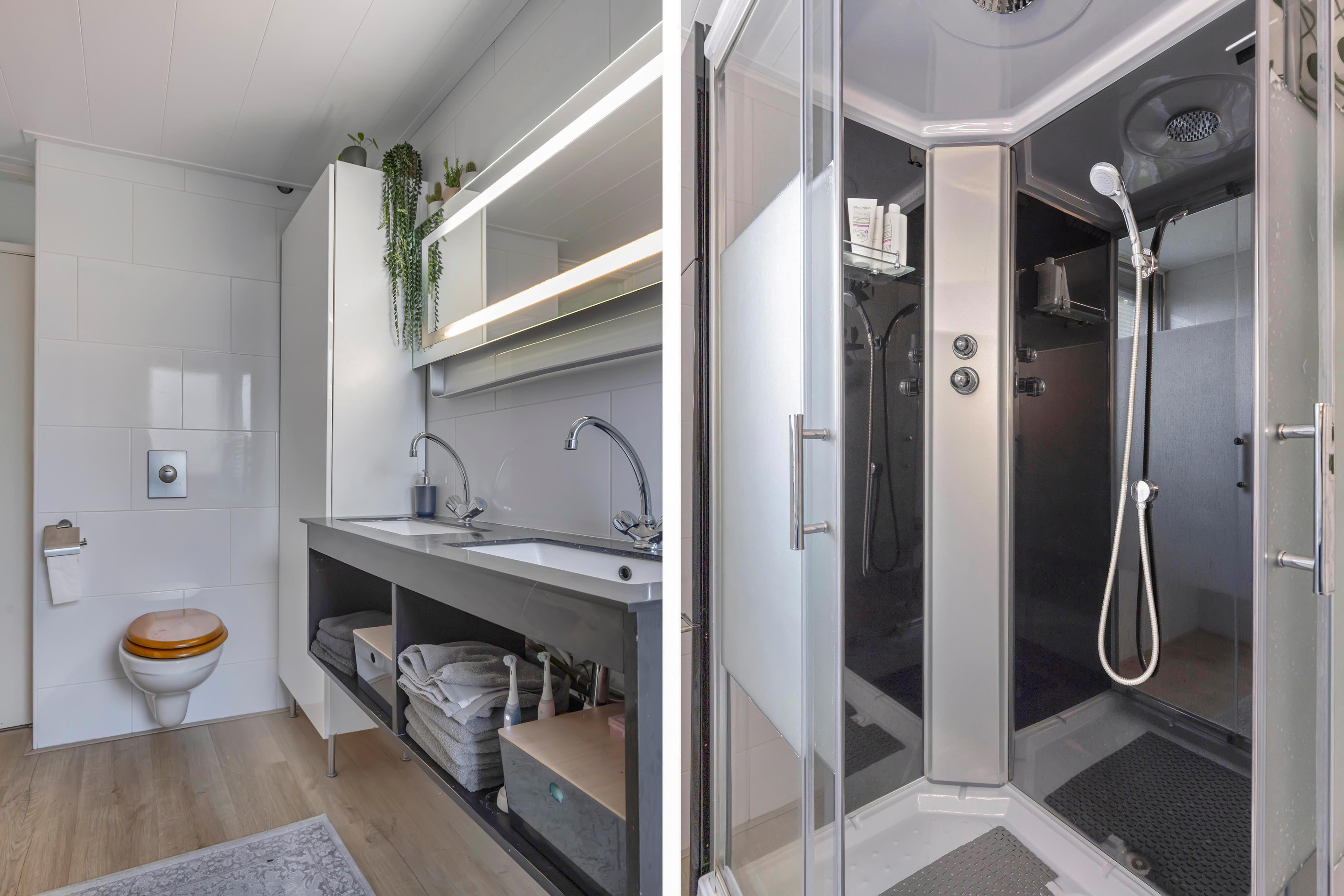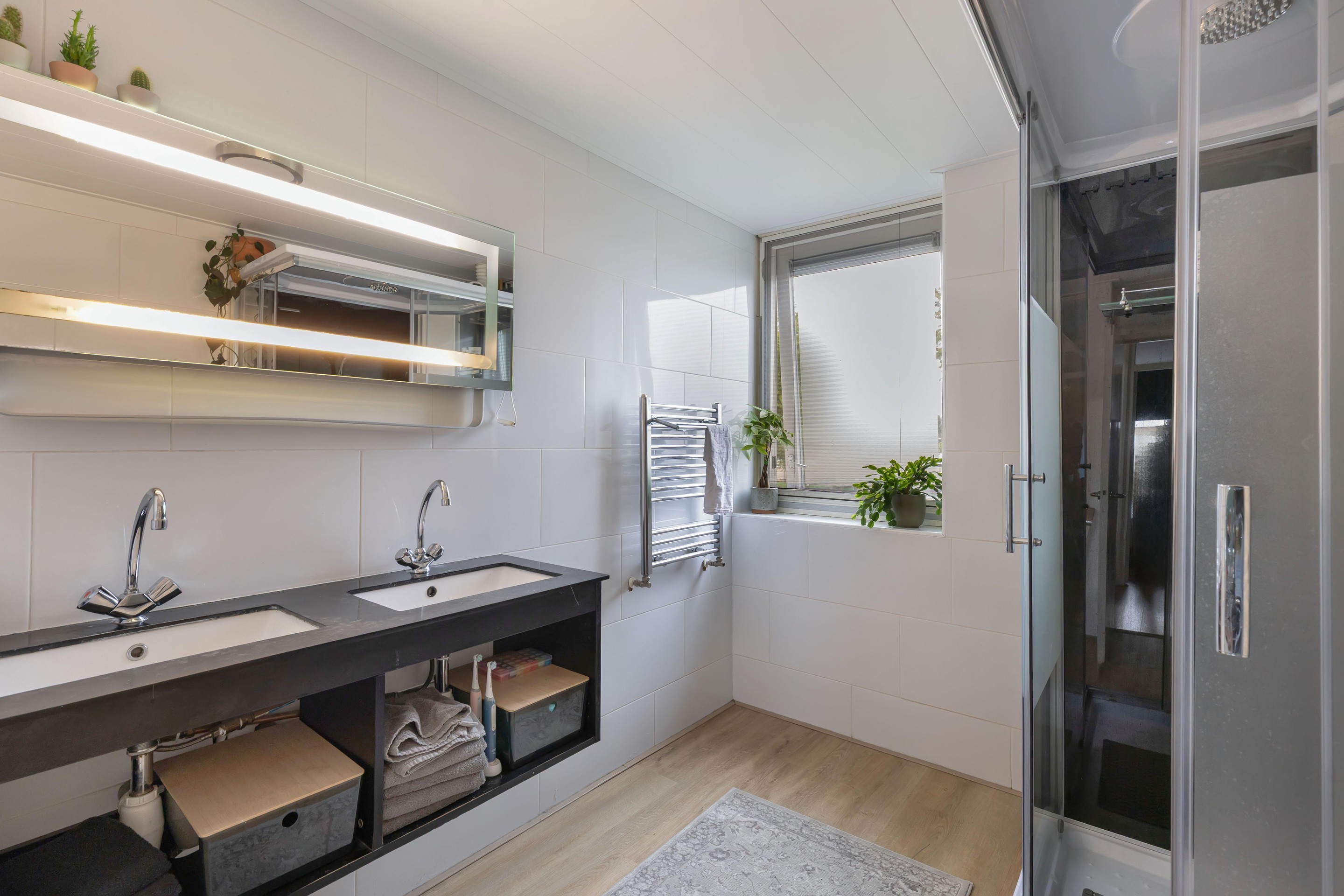 Eerste verdieping overloop, 3 slaapkamer waarvan 1 met inloopkast en 1 met inbouwkast, badkamer voorzien van dubbele wastafel, toilet en inloopdouche.
