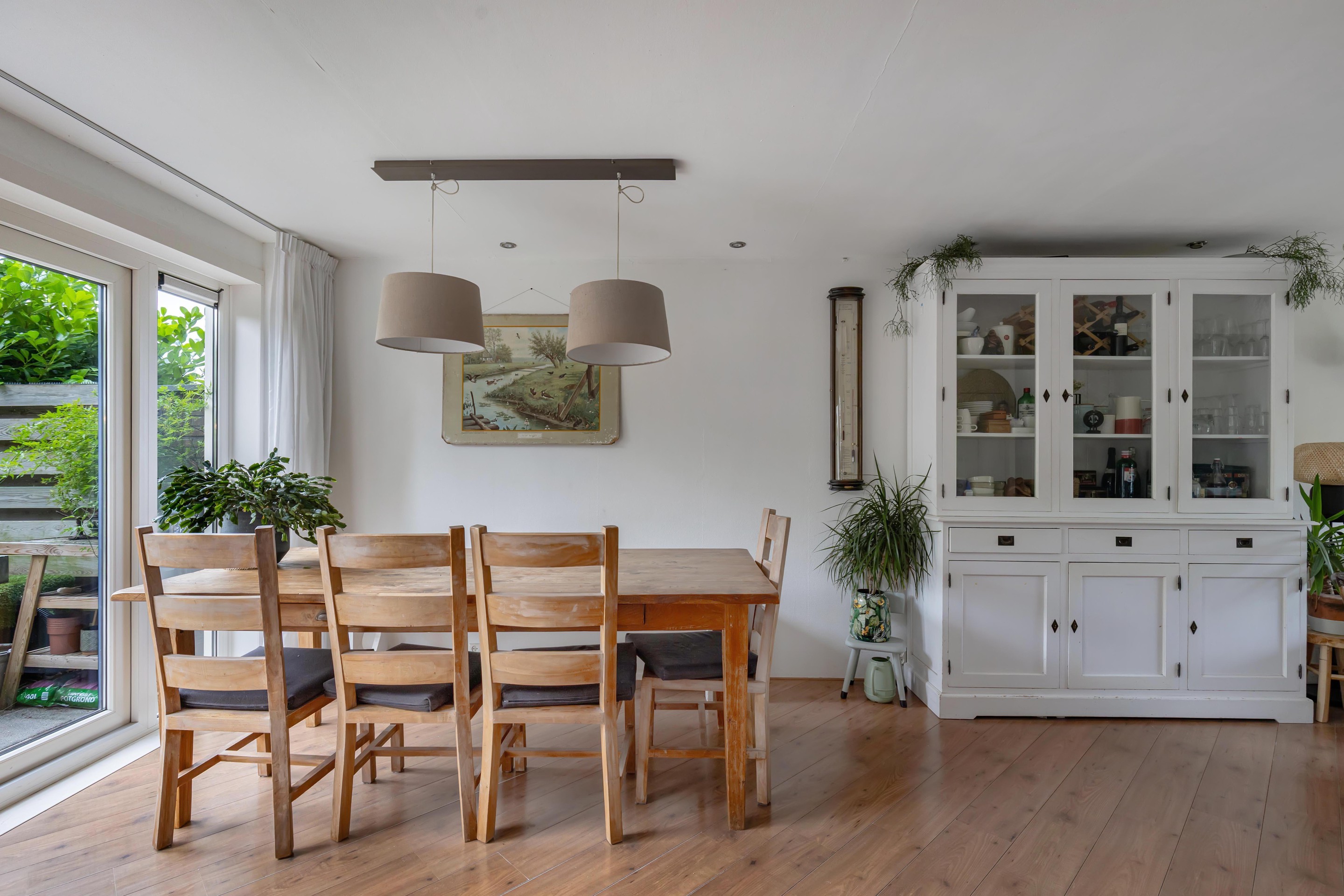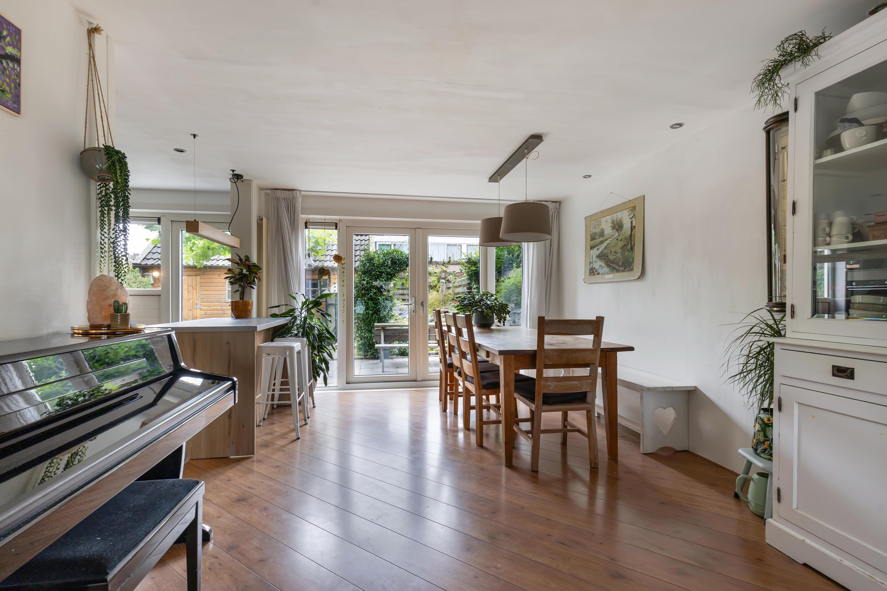 De doorzonwoonkamer is een fijne plek om samen te komen, waarbij de openslaande deuren de verbinding met de zonnige achtertuin op het zuiden versterken. De moderne keuken is ingericht met een centraal eiland, voorzien van praktische lades aan de ene kant en een barfunctie met ruimte voor krukken aan de andere kant, ideaal om te koken én gezellig samen te zijn.