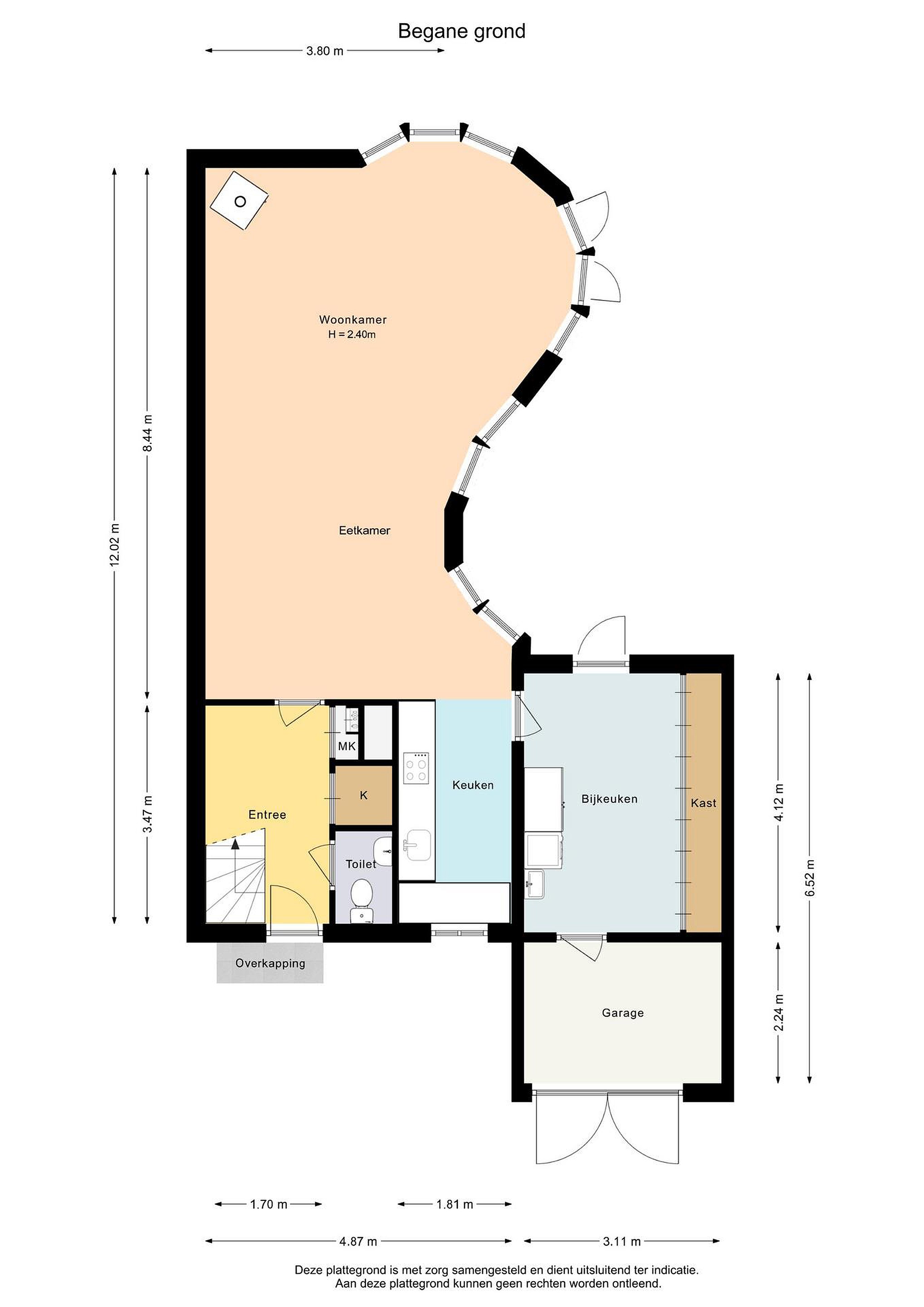 Begane grond entree/hal, toilet met fontein, trapopgang, bergkast, meterkast, lichte woonkamer met rondvormige pui met openslaande deuren en houtkachel, moderne keuken voorzien van inbouwapparatuur zoals: inductie kookplaat, oven en vaatwasser. Via de keuken kun je naar de ruime bijkeuken en naar de garage.