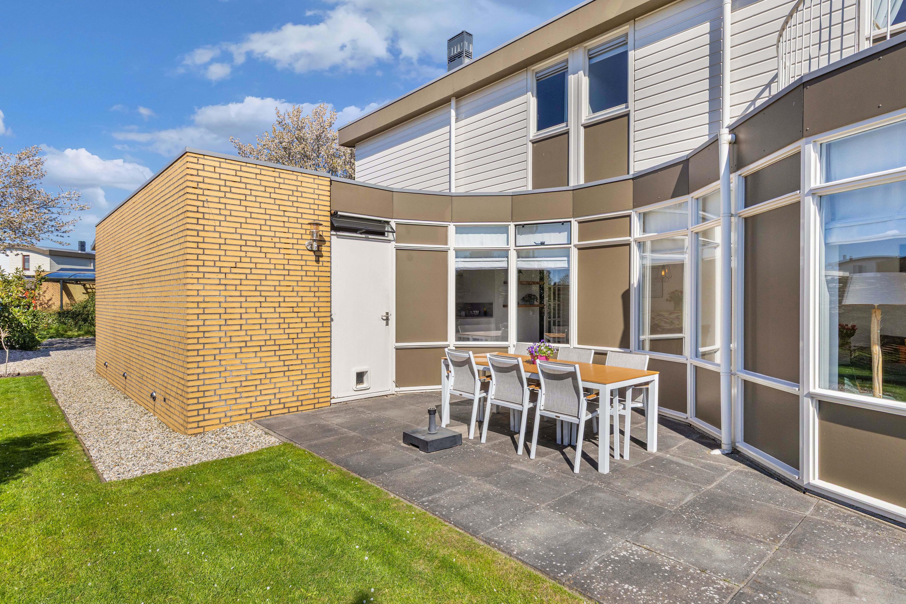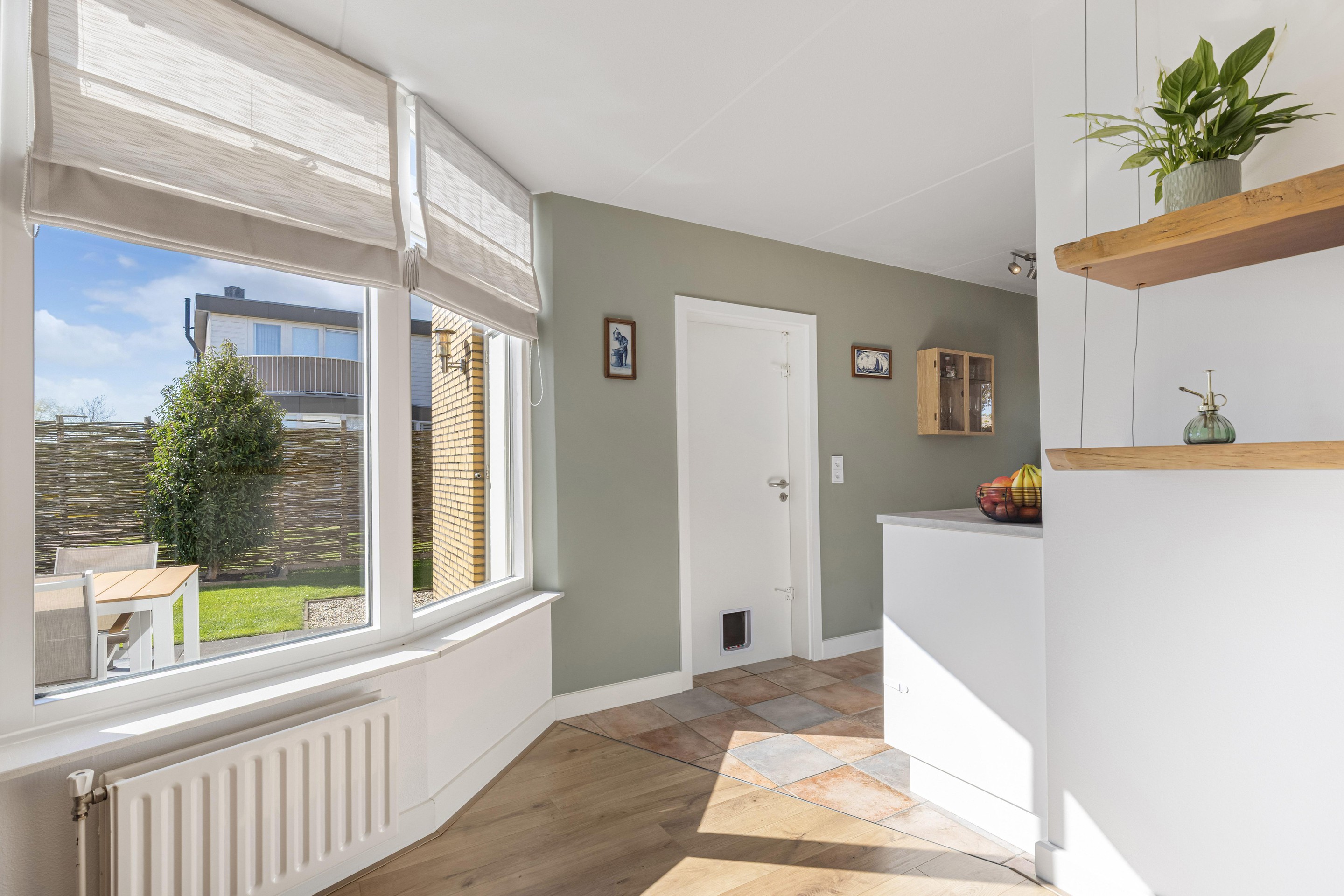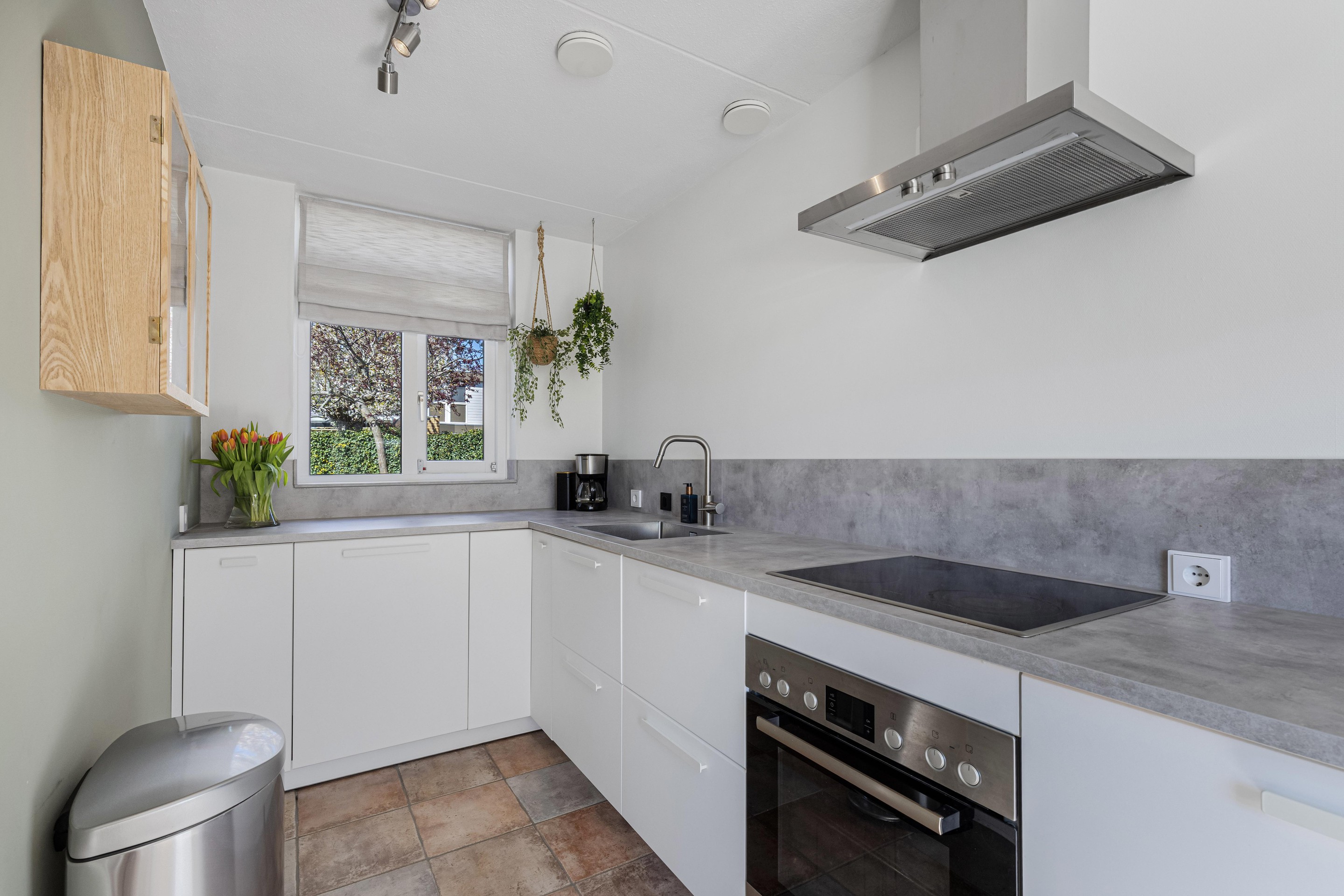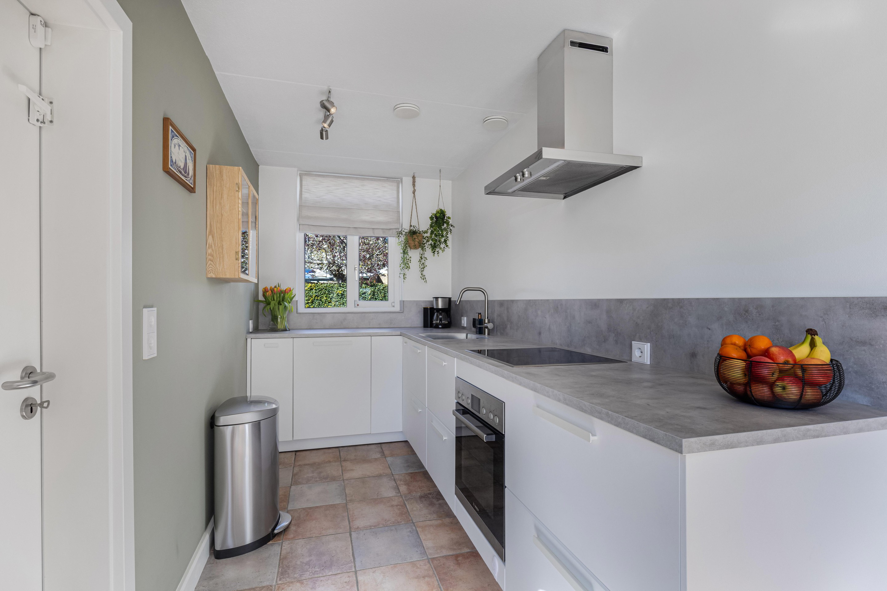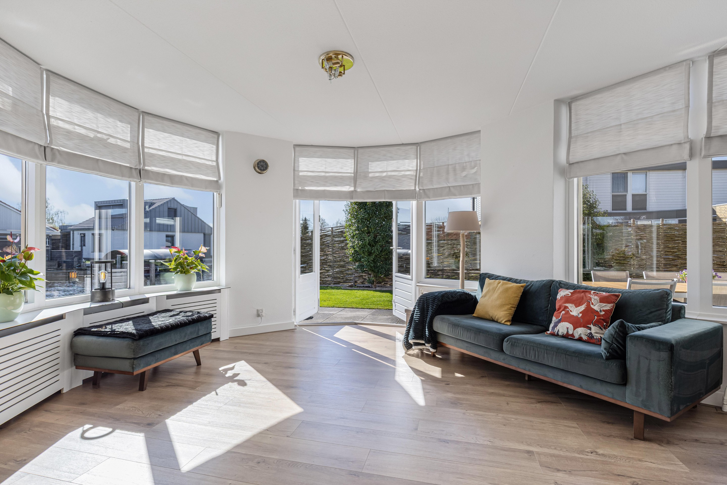 De woning zelf heeft een verrassend lichte en speelse uitstraling. De woonkamer valt direct op door de organisch vormgegeven pui met openslaande deuren naar de tuin, waardoor binnen en buiten op een natuurlijke manier in elkaar overlopen. De moderne keuken is van alle gemakken voorzien en sluit mooi aan op de leefruimte. Daarnaast zijn er een ruime bijkeuken en een berging, wat zorgt voor extra comfort en praktische mogelijkheden.