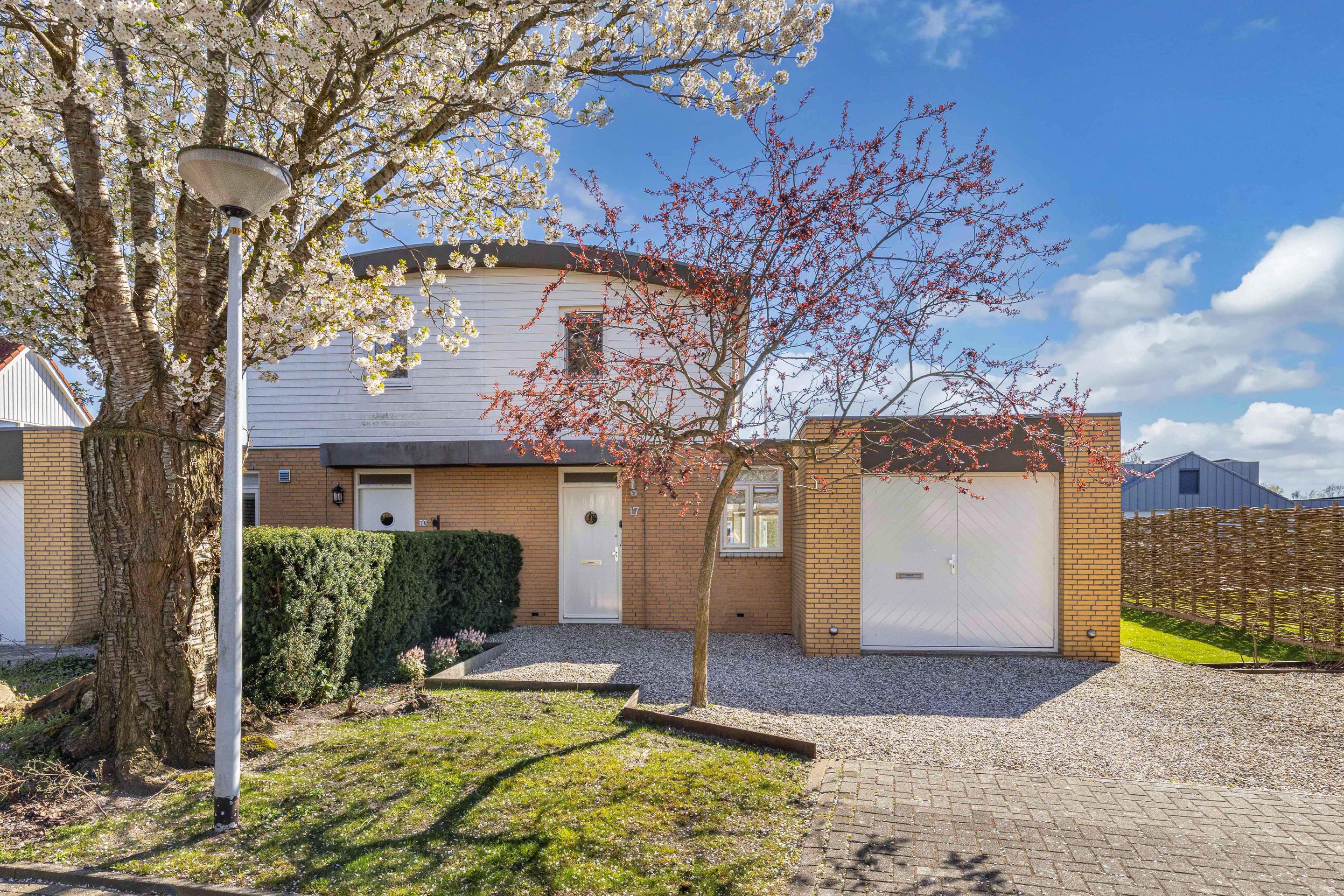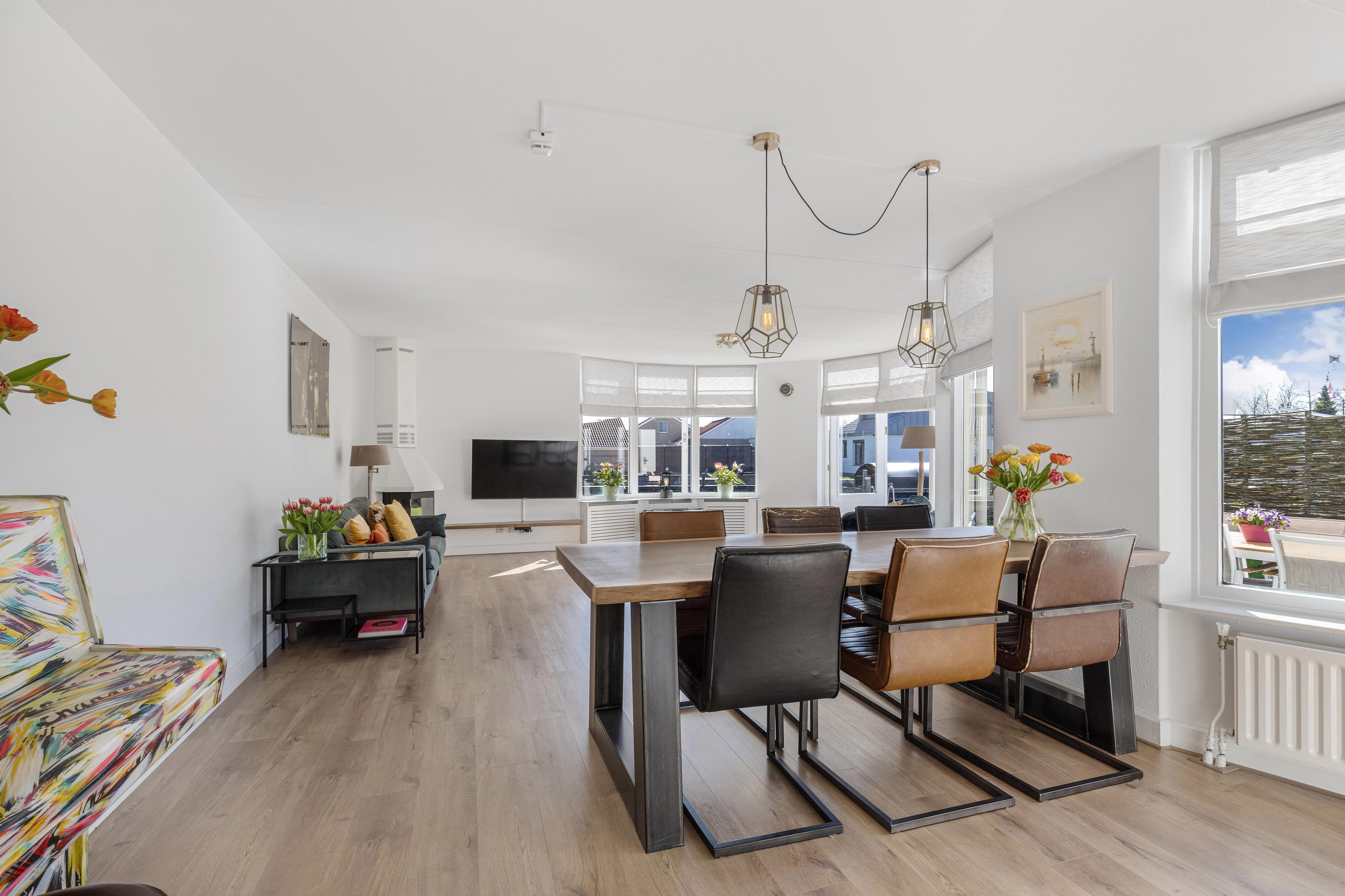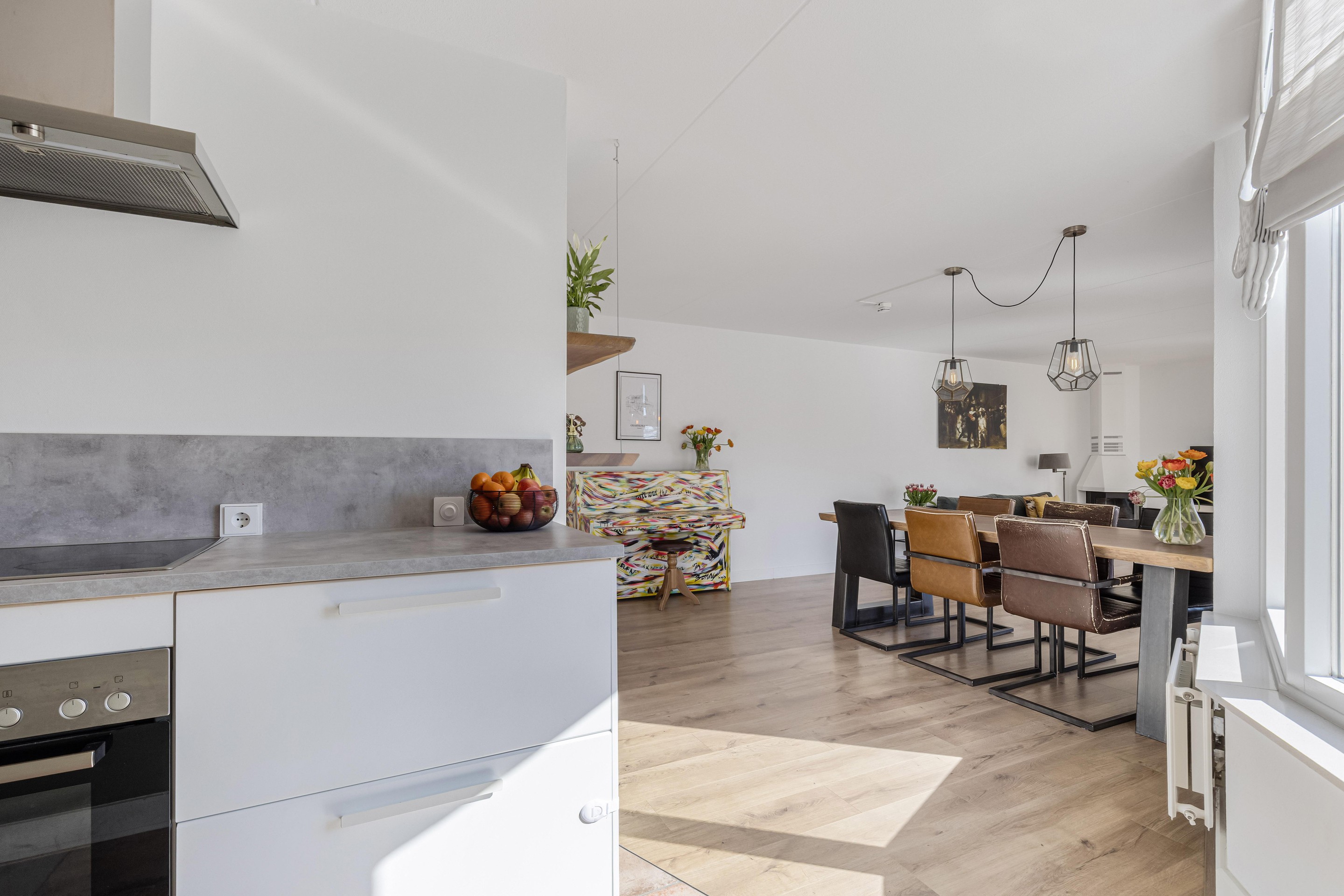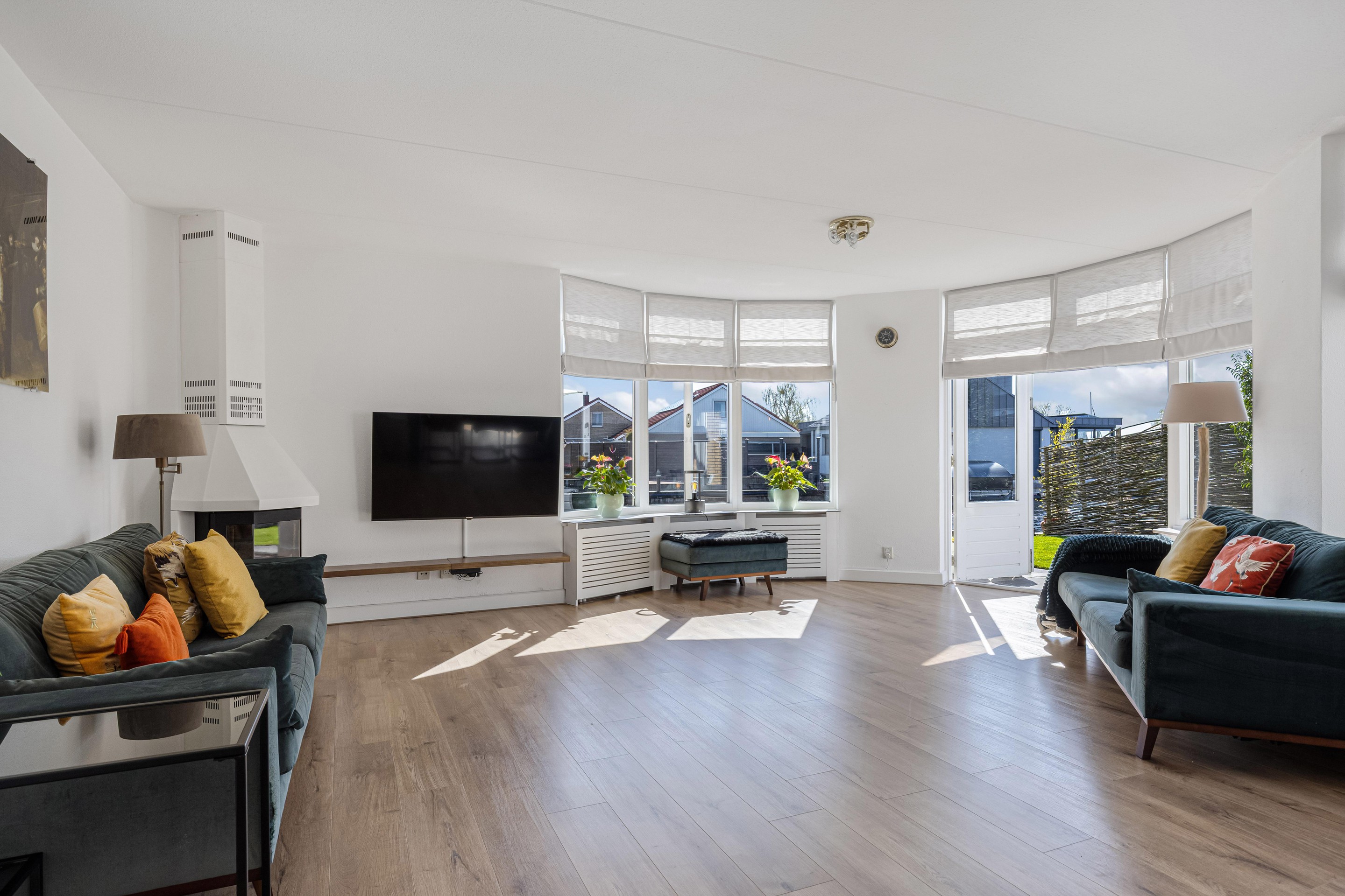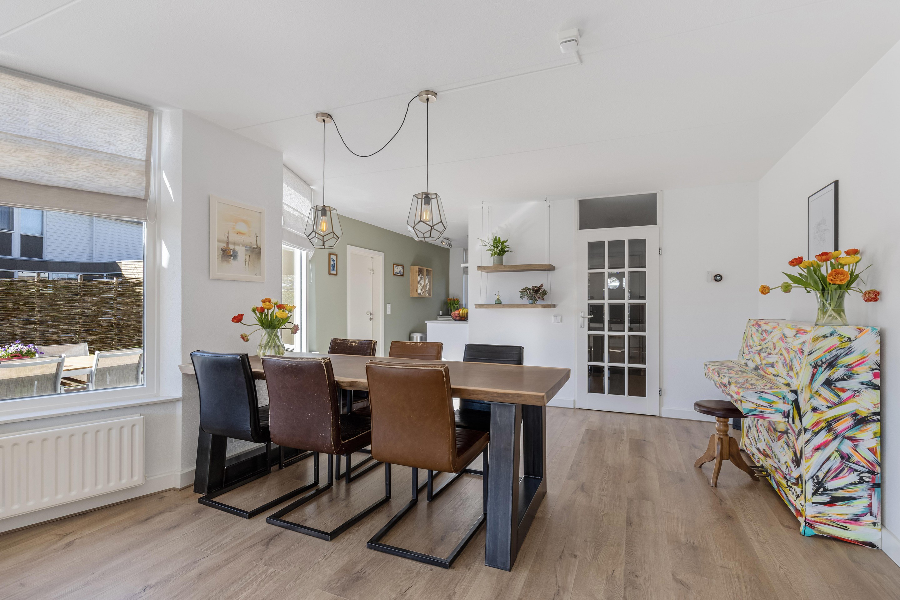 De woning zelf heeft een verrassend lichte en speelse uitstraling. De woonkamer valt direct op door de organisch vormgegeven pui met openslaande deuren naar de tuin, waardoor binnen en buiten op een natuurlijke manier in elkaar overlopen. De moderne keuken is van alle gemakken voorzien en sluit mooi aan op de leefruimte. Daarnaast zijn er een ruime bijkeuken en een berging, wat zorgt voor extra comfort en praktische mogelijkheden.