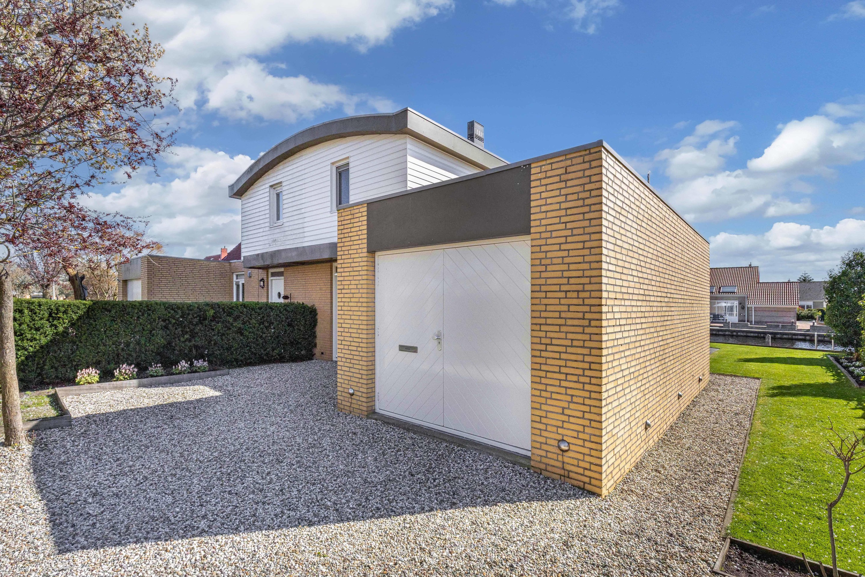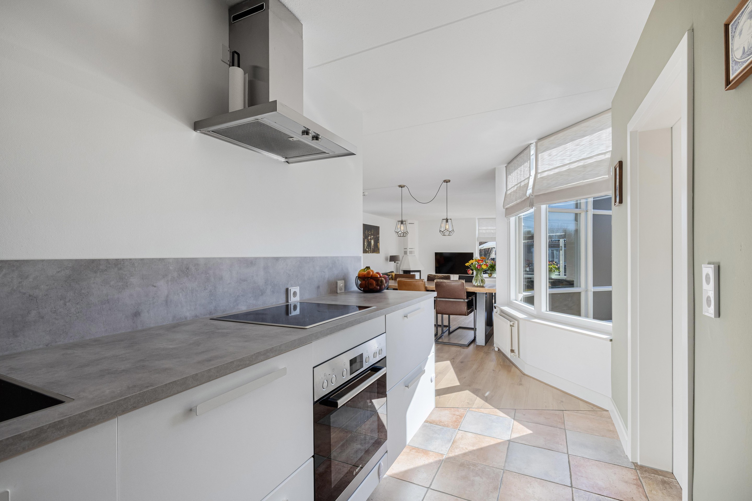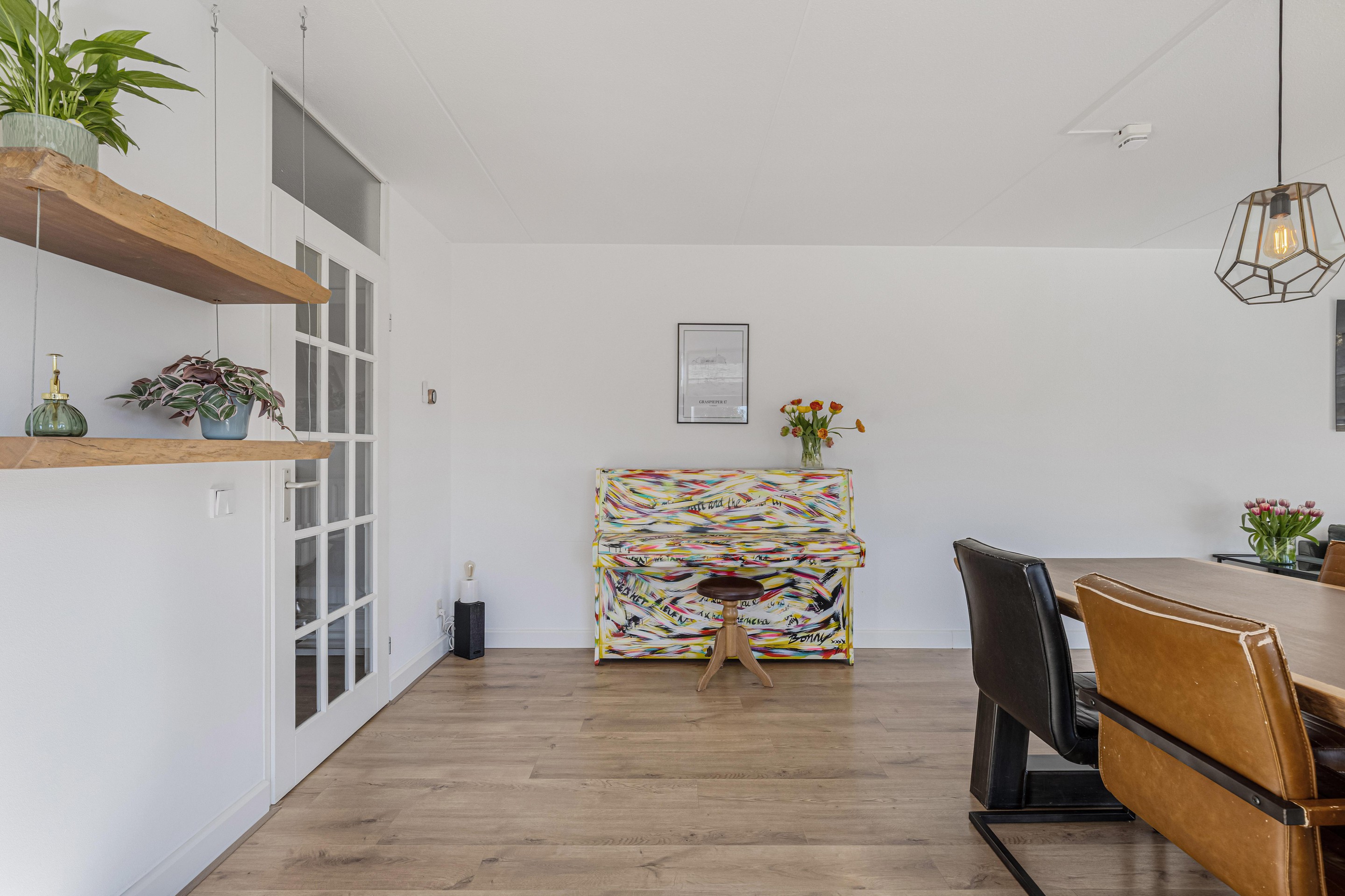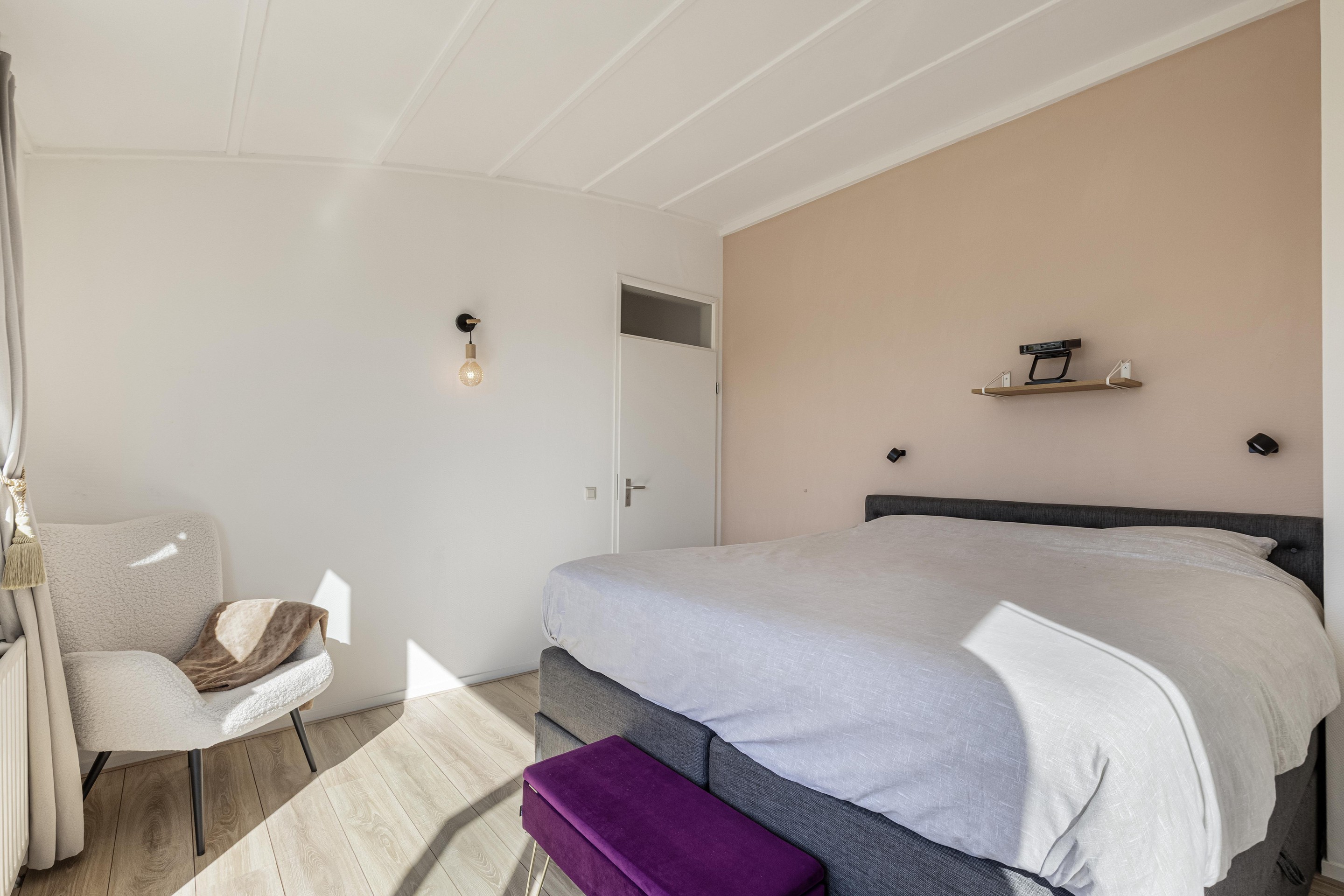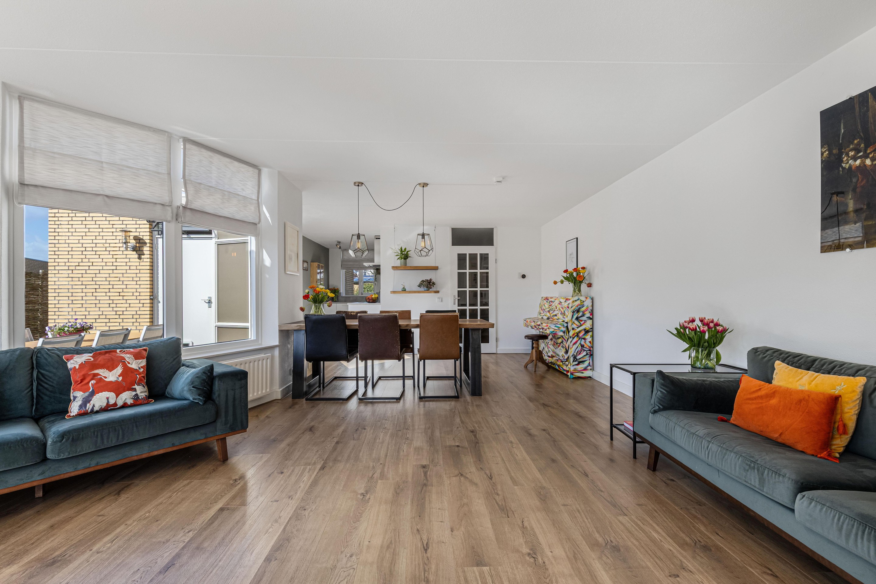 De woning zelf heeft een verrassend lichte en speelse uitstraling. De woonkamer valt direct op door de organisch vormgegeven pui met openslaande deuren naar de tuin, waardoor binnen en buiten op een natuurlijke manier in elkaar overlopen. De moderne keuken is van alle gemakken voorzien en sluit mooi aan op de leefruimte. Daarnaast zijn er een ruime bijkeuken en een berging, wat zorgt voor extra comfort en praktische mogelijkheden.