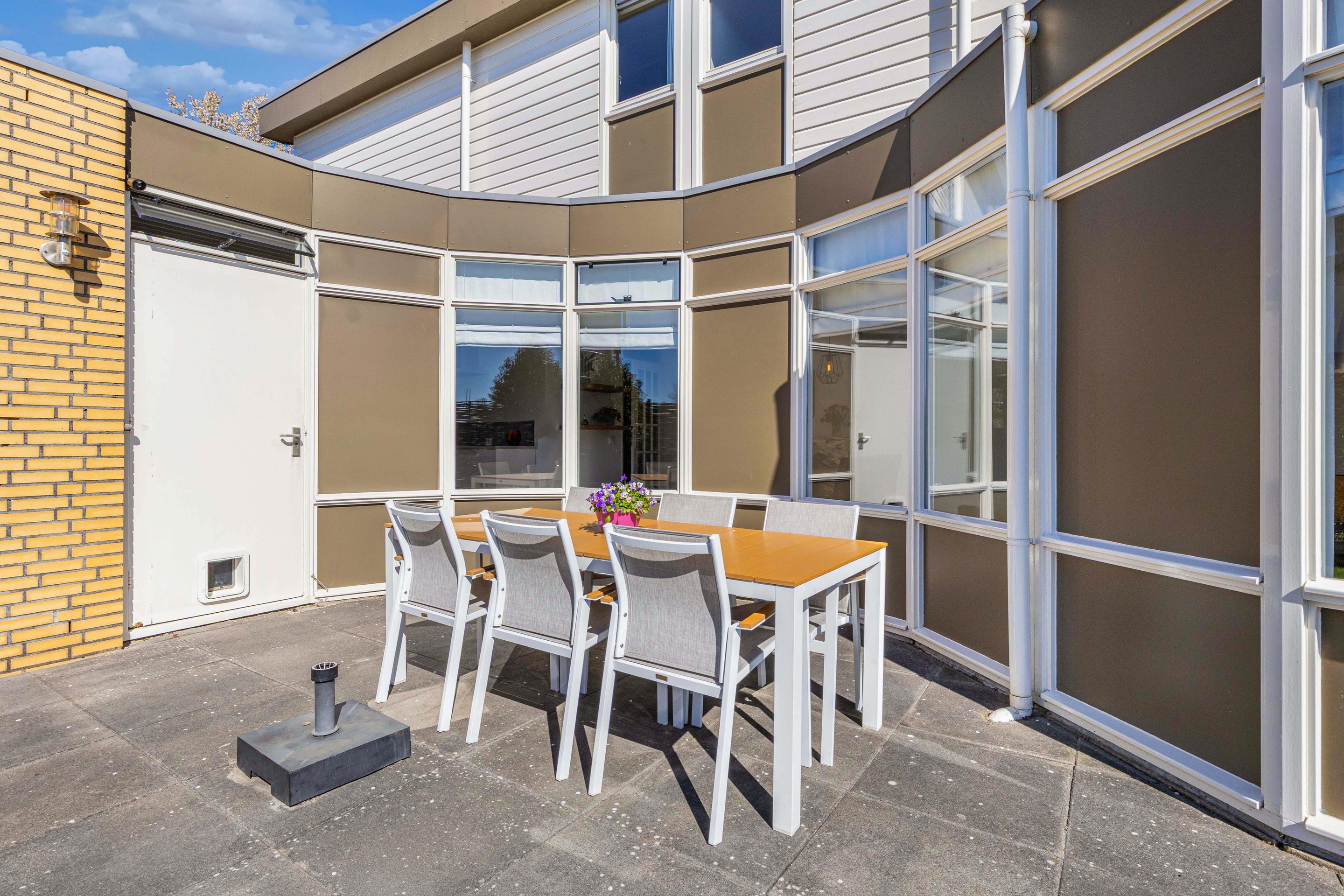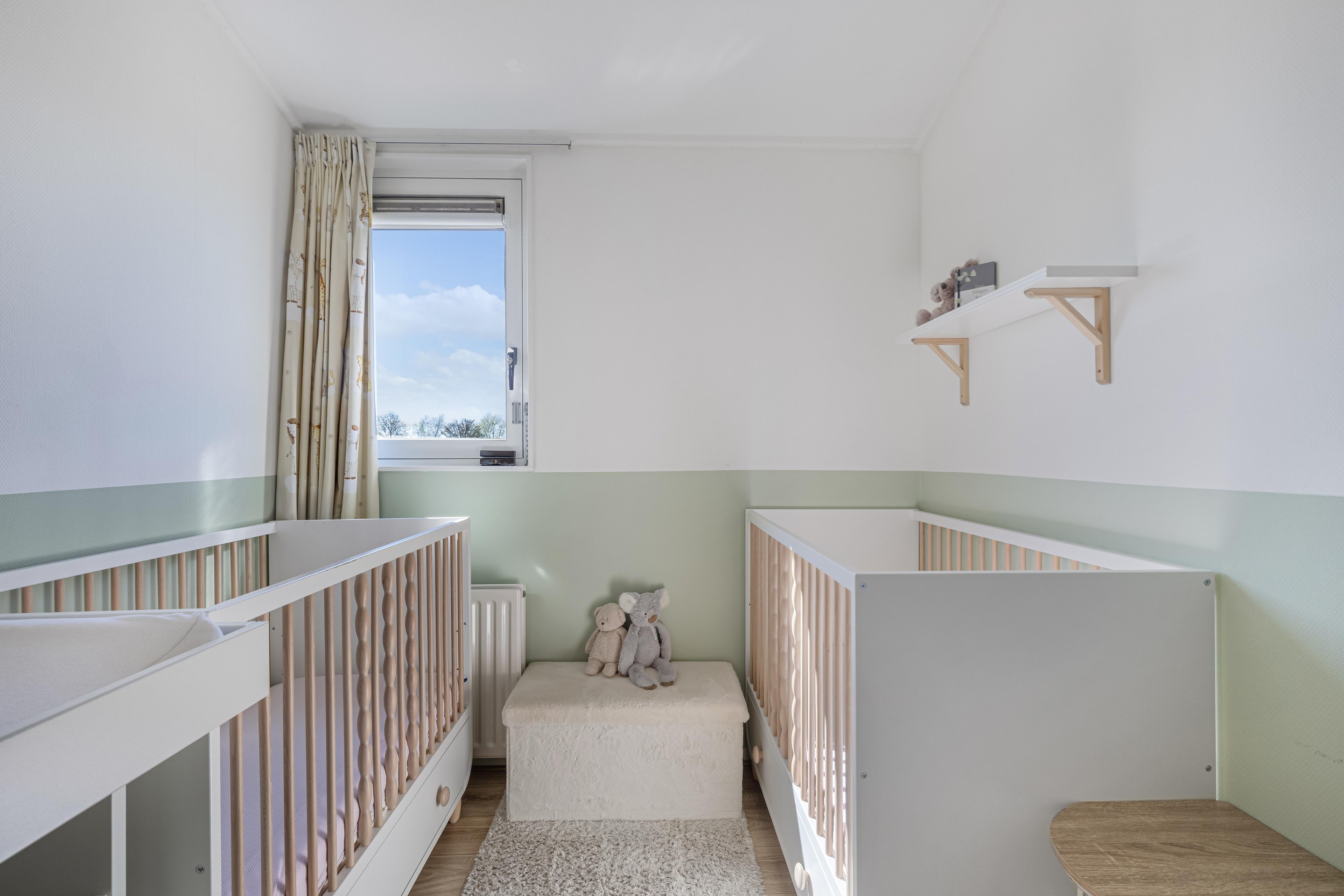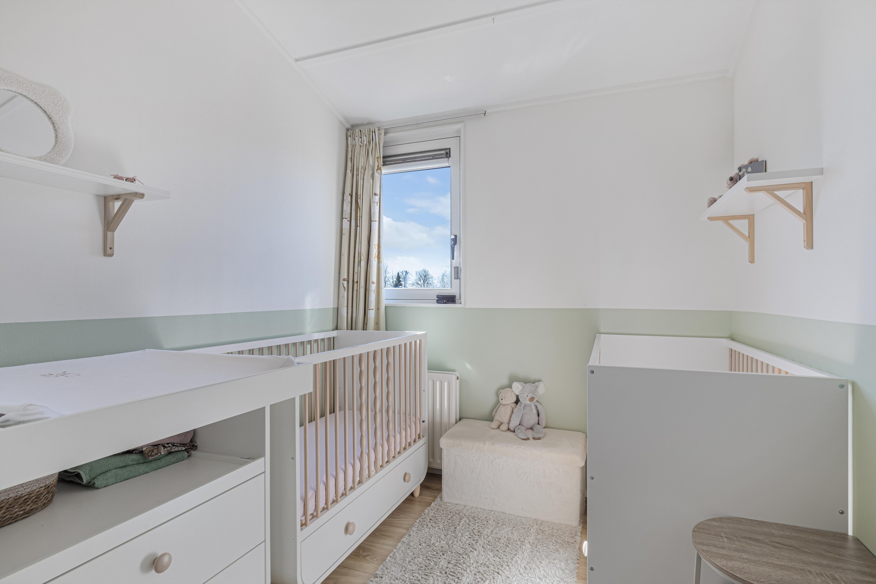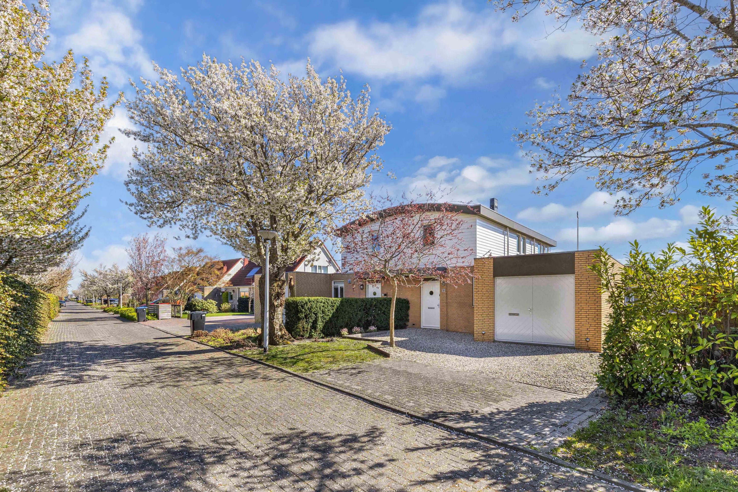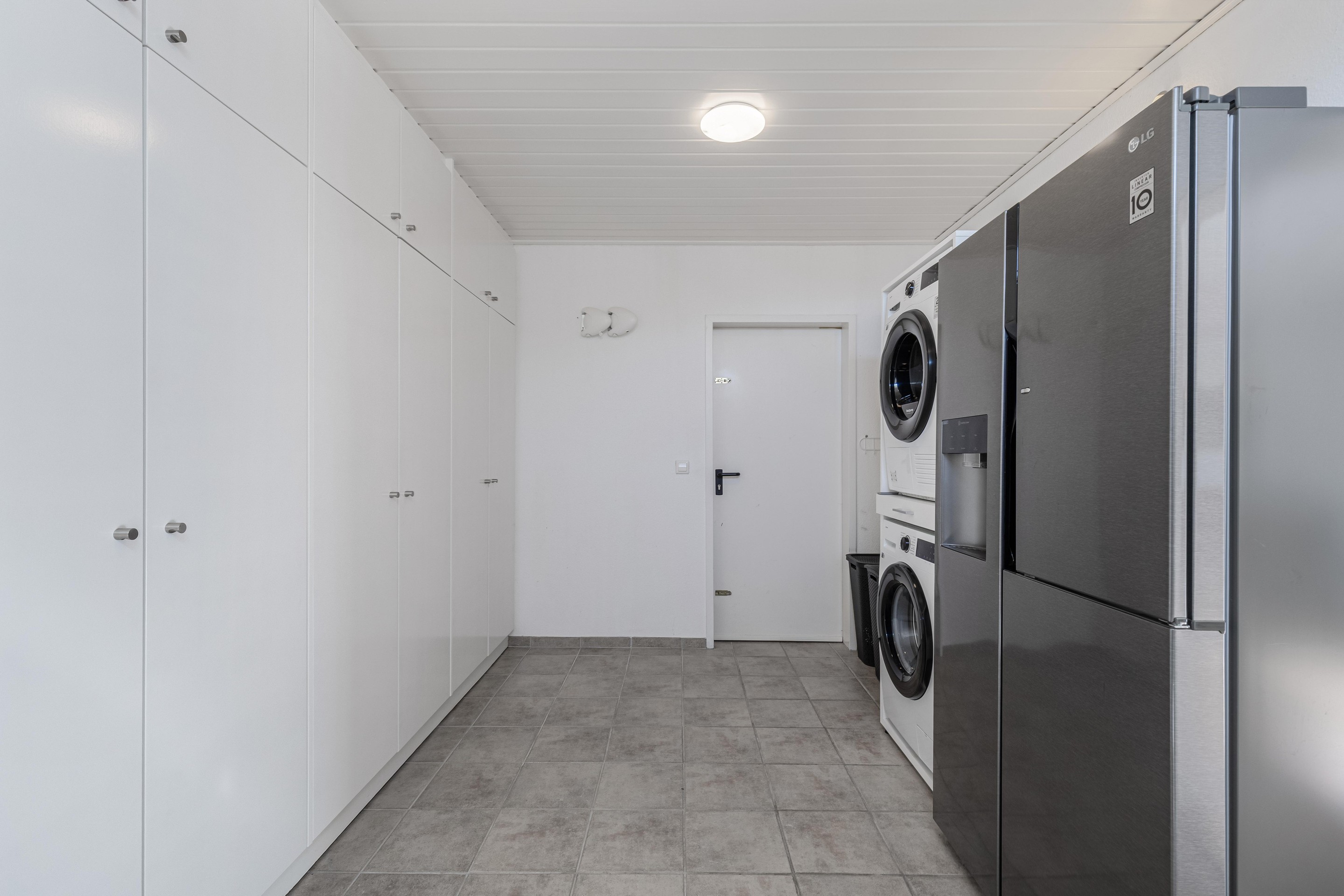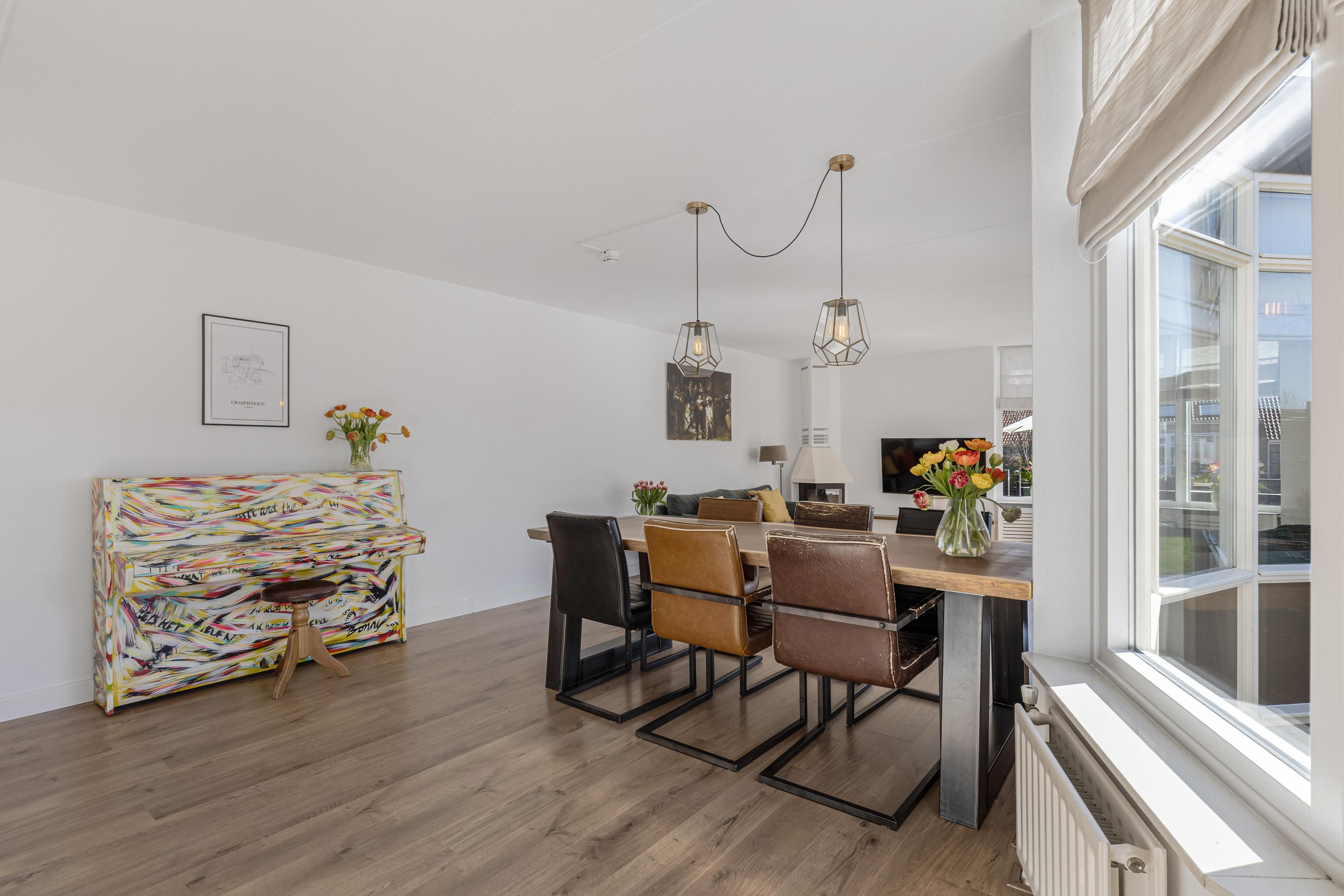 De woning zelf heeft een verrassend lichte en speelse uitstraling. De woonkamer valt direct op door de organisch vormgegeven pui met openslaande deuren naar de tuin, waardoor binnen en buiten op een natuurlijke manier in elkaar overlopen. De moderne keuken is van alle gemakken voorzien en sluit mooi aan op de leefruimte. Daarnaast zijn er een ruime bijkeuken en een berging, wat zorgt voor extra comfort en praktische mogelijkheden.