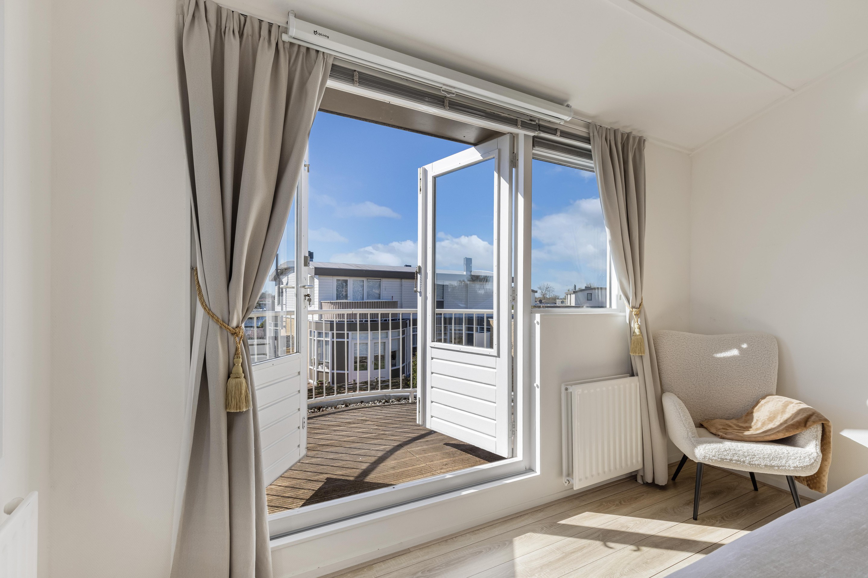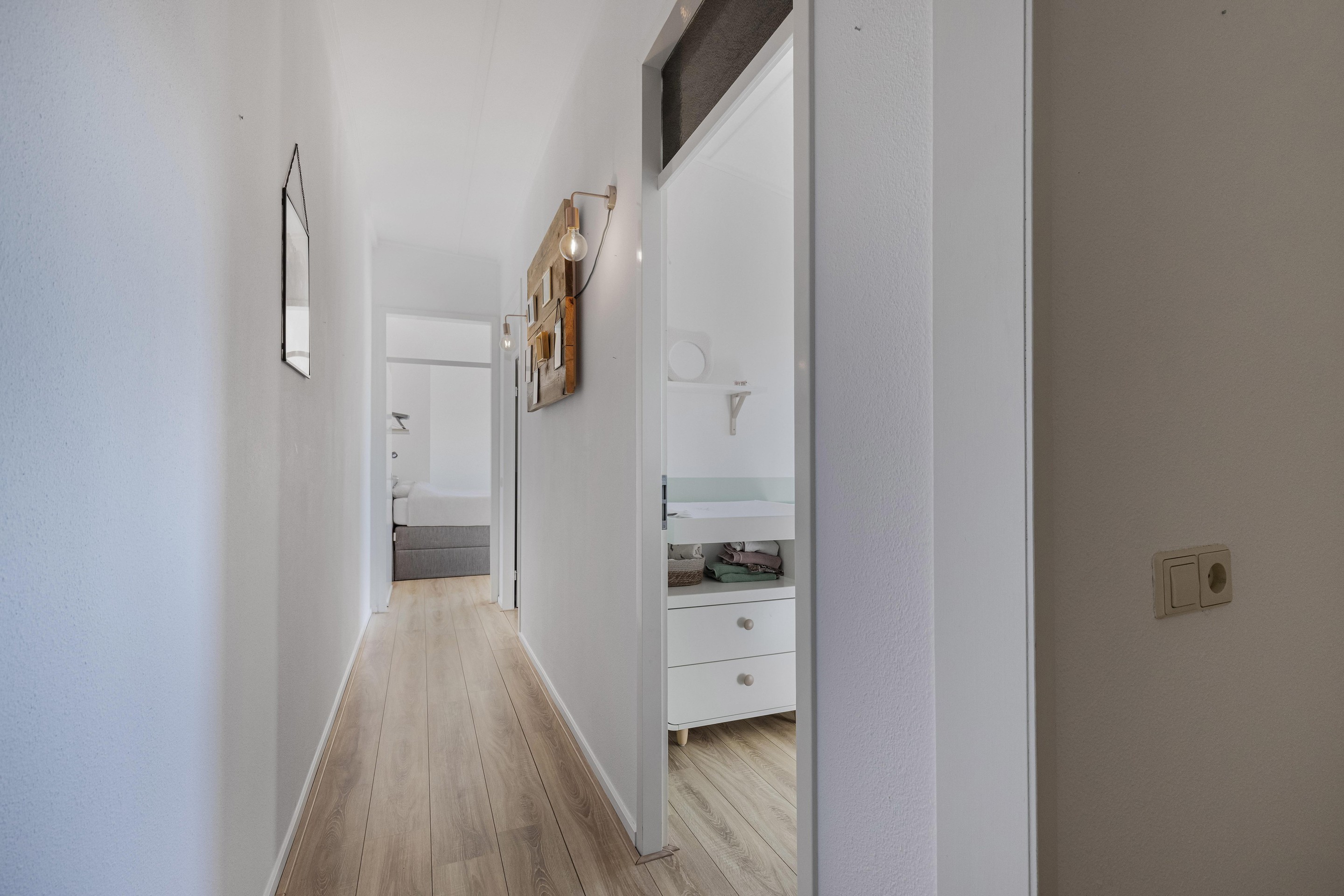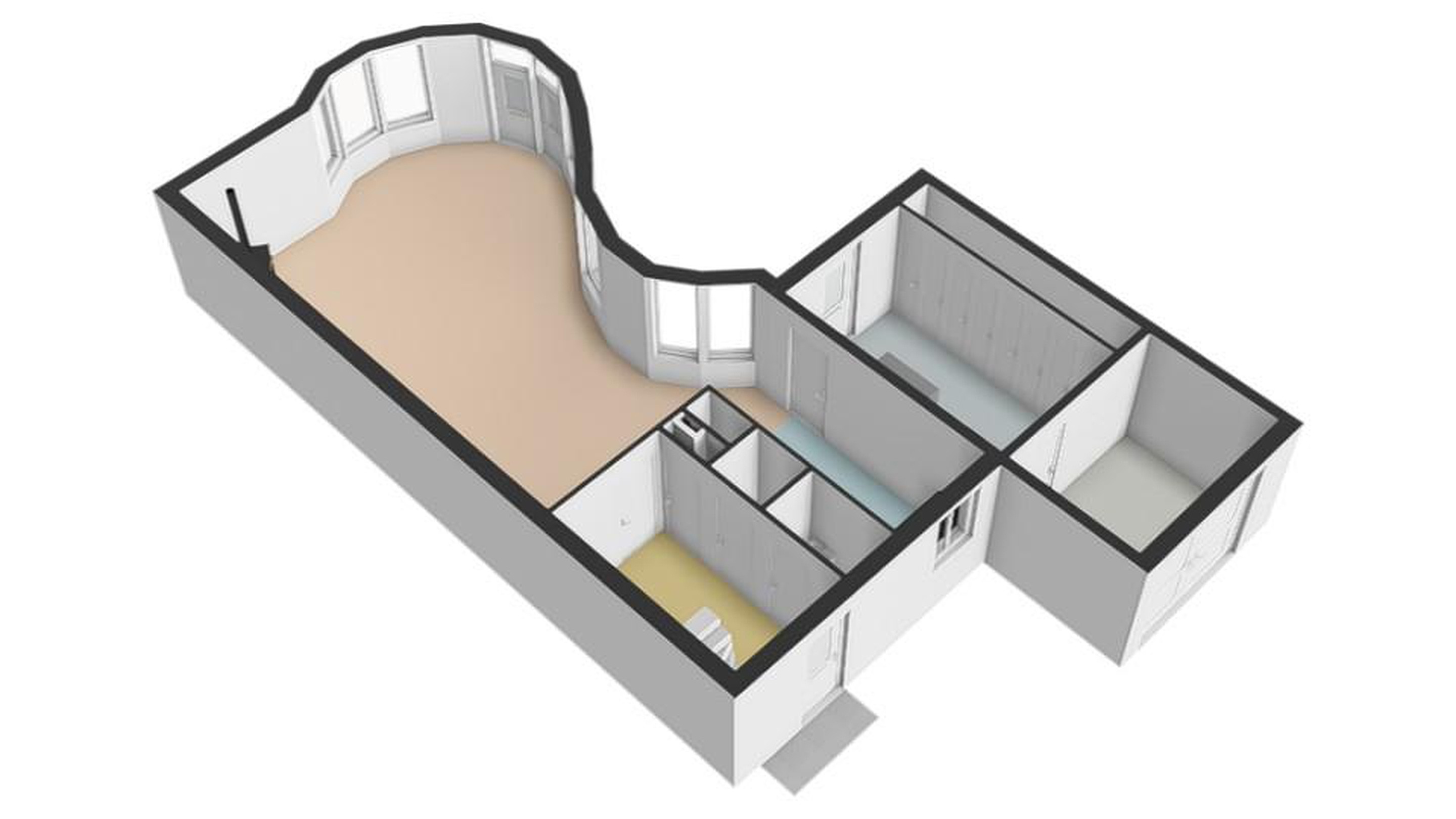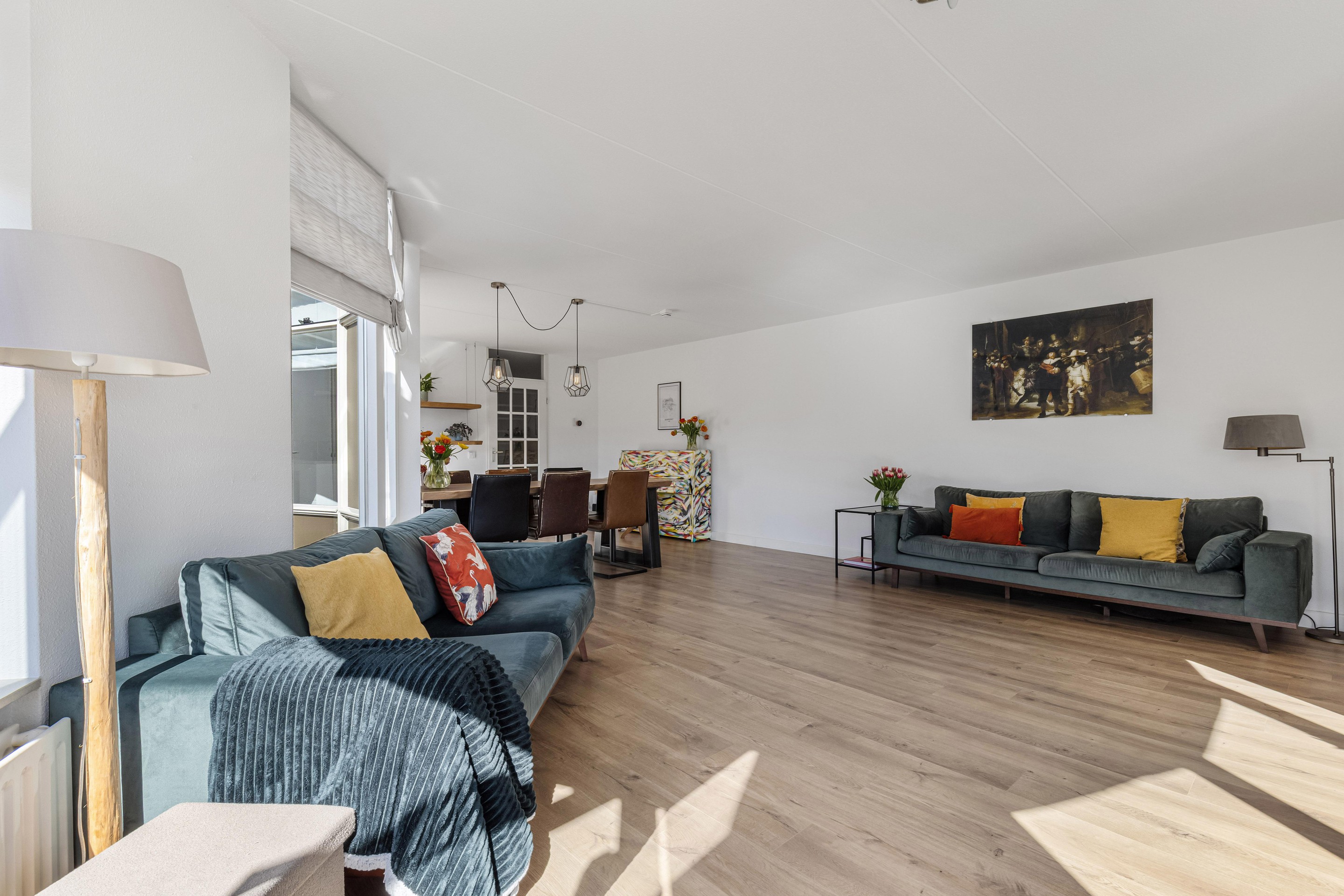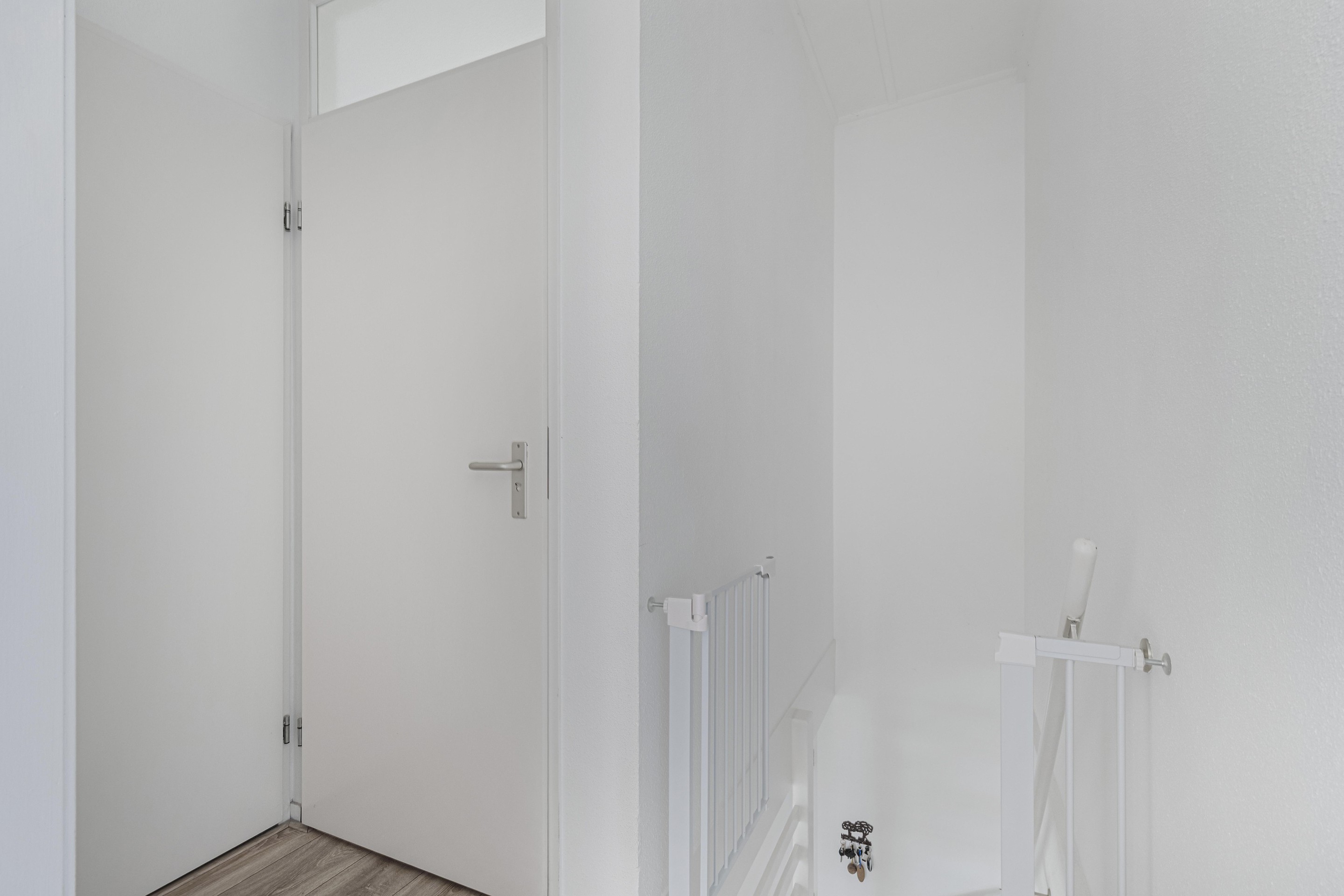 De woning zelf heeft een verrassend lichte en speelse uitstraling. De woonkamer valt direct op door de organisch vormgegeven pui met openslaande deuren naar de tuin, waardoor binnen en buiten op een natuurlijke manier in elkaar overlopen. De moderne keuken is van alle gemakken voorzien en sluit mooi aan op de leefruimte. Daarnaast zijn er een ruime bijkeuken en een berging, wat zorgt voor extra comfort en praktische mogelijkheden.