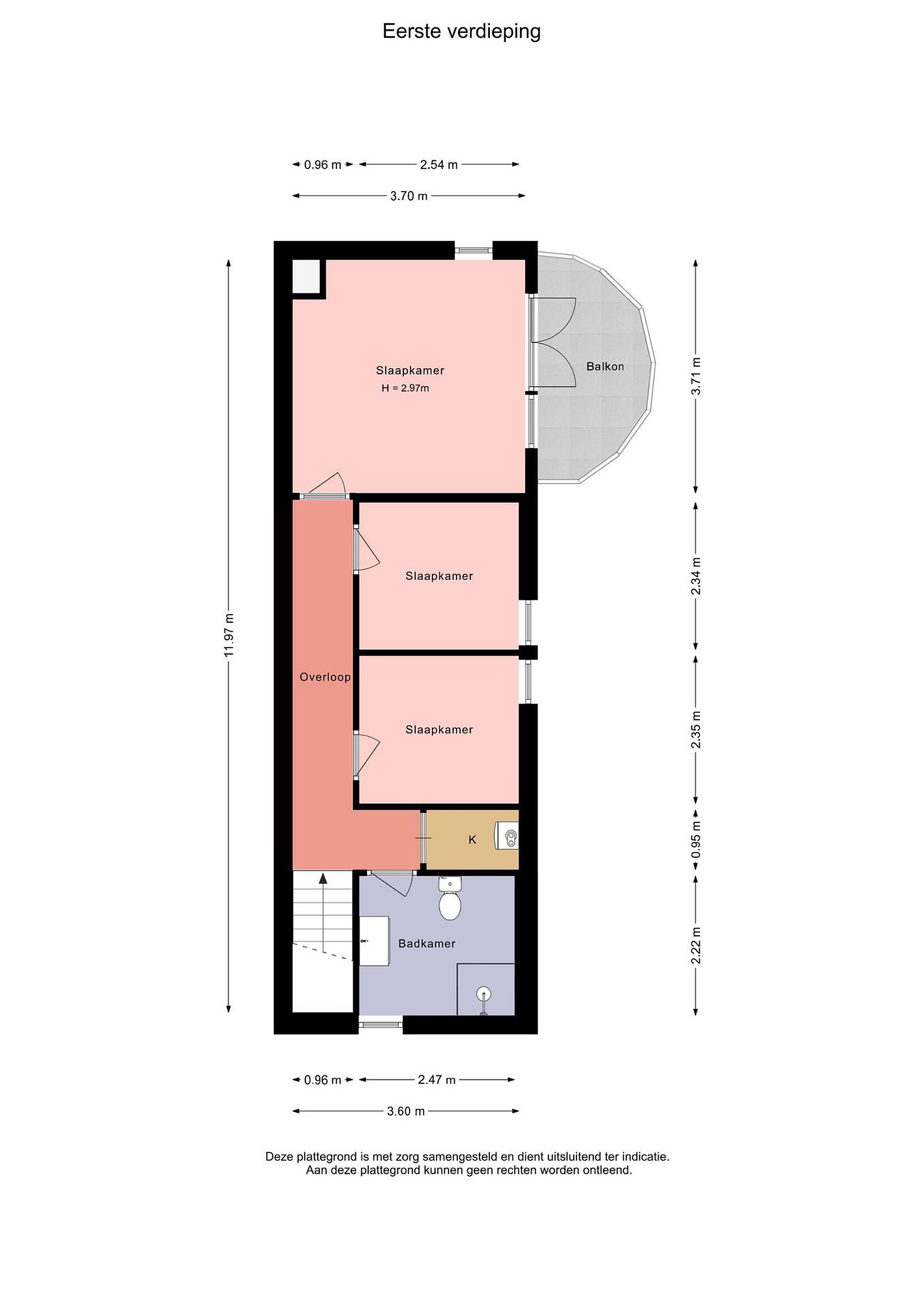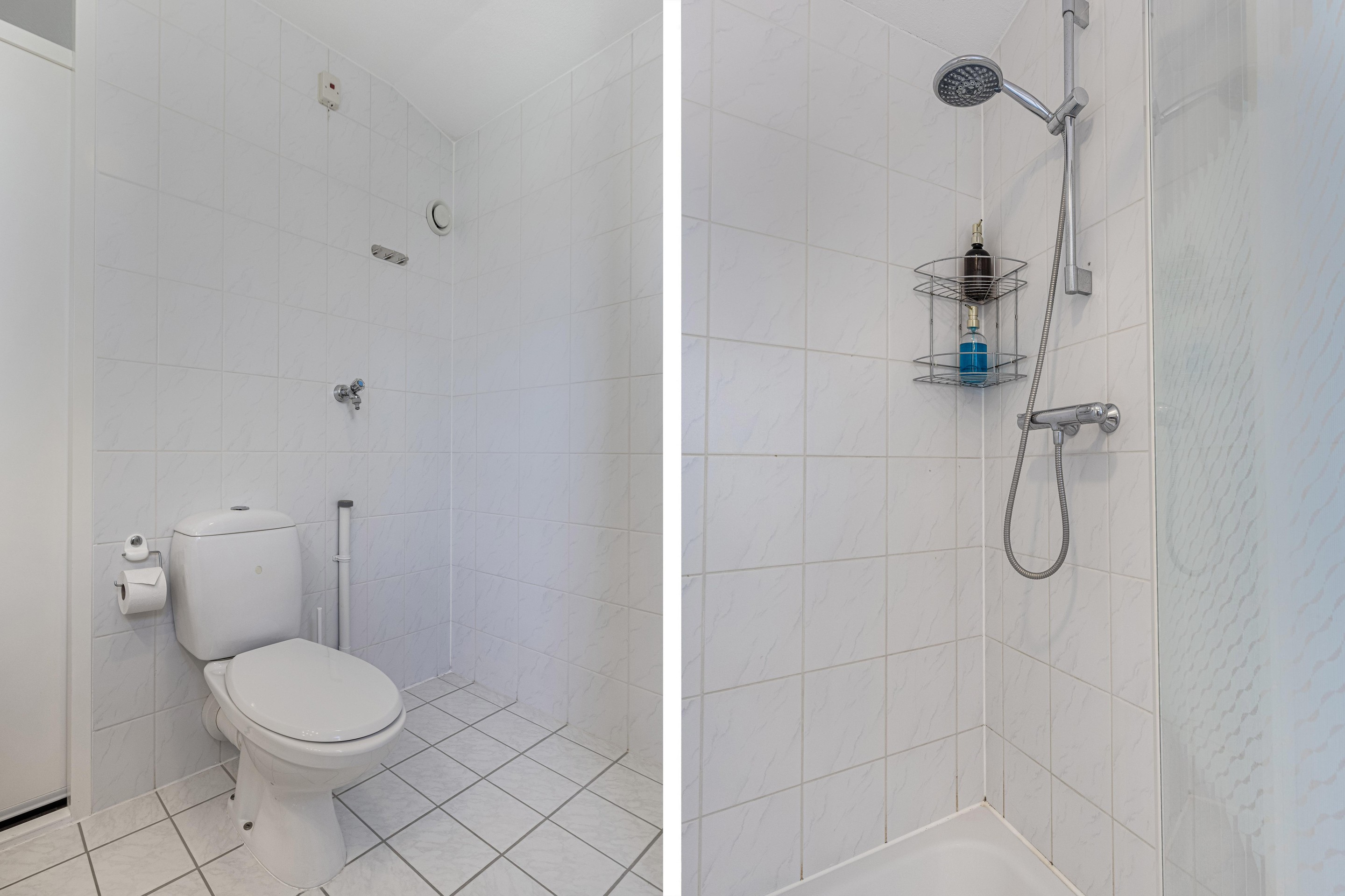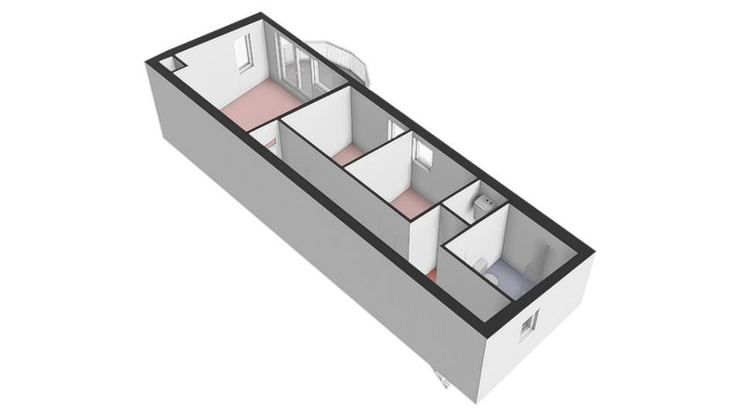 Eerste verdieping overloop, badkamer voorzien van toilet, douche en wastafel, 3 slaapkamers waarvan 1 met openslaande deuren naar balkon.
