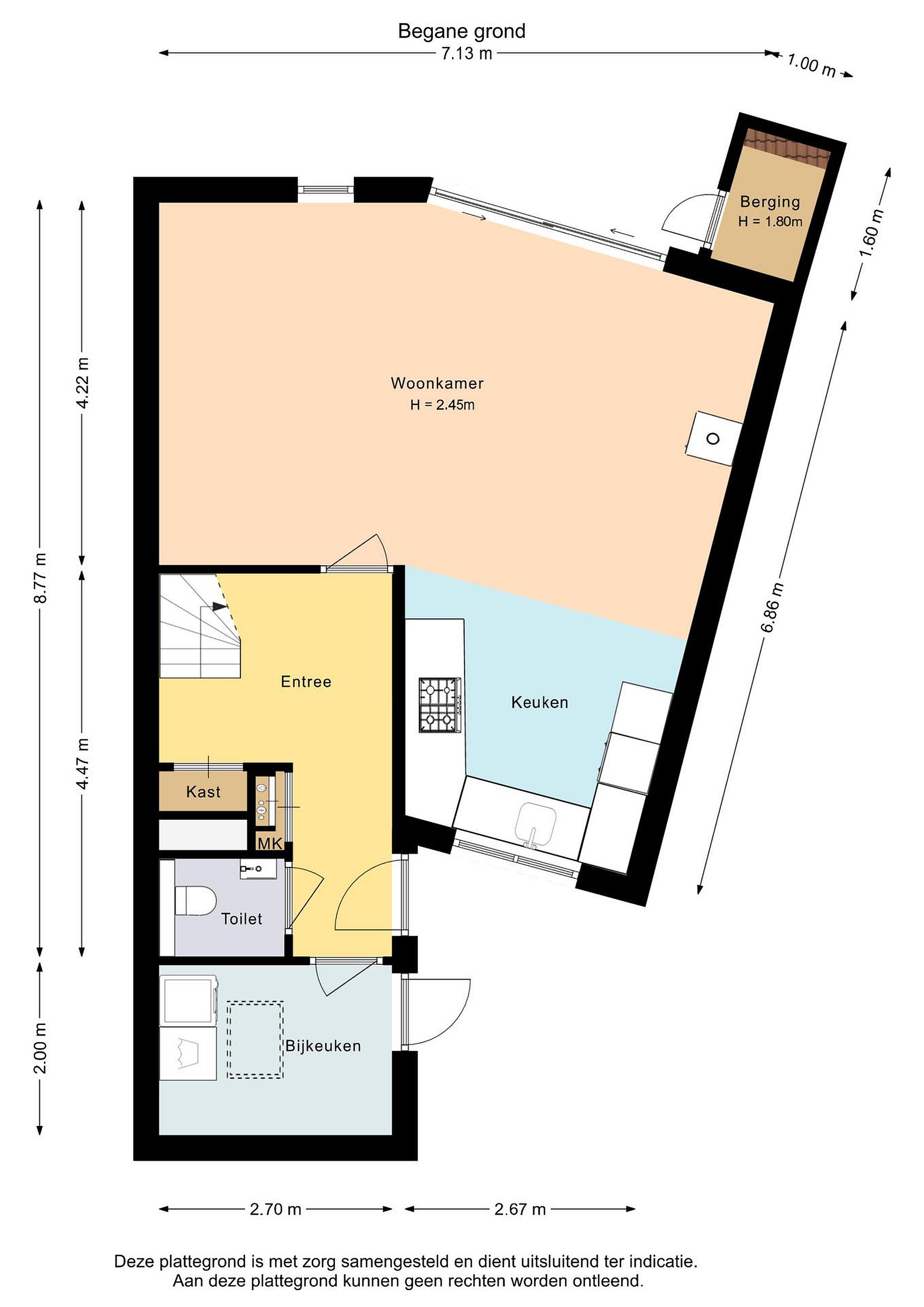 Begane grond entree/hal, bijkeuken met witgoedaansluiting, toilet, meterkast, bergkast, trapopgang, woonkamer met schuifpui naar de tuin en gashaard, moderne keuken in landelijke stijl met diverse inbouwapparatuur zoals: oven, magnetron, koelkast, 5-pits gasfornuis met afzuigkap en een vaatwasser.
