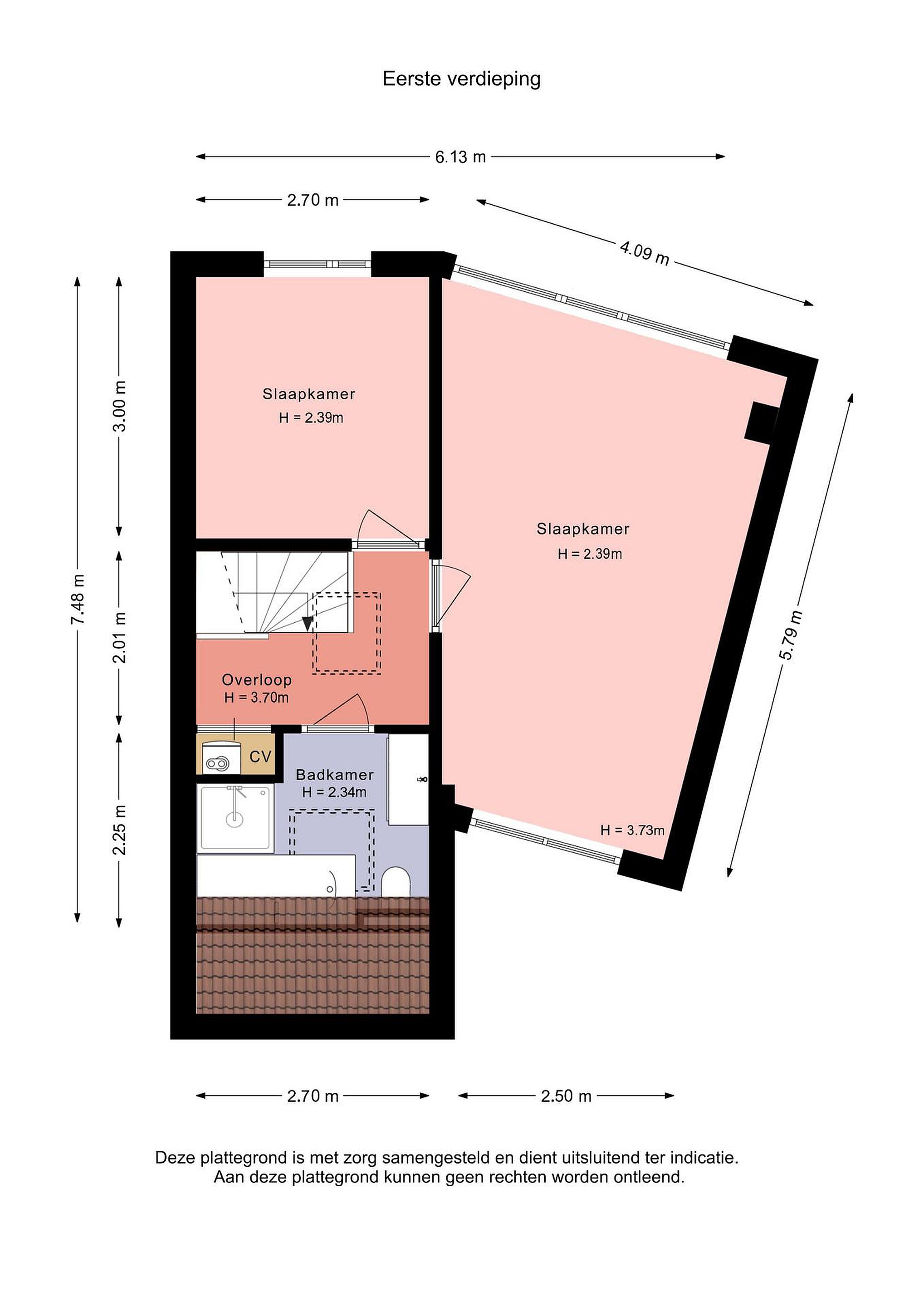Eerste verdieping overloop, 2 ruime slaapkamers met airco, badkamer voorzien van ligbad, wastafelmeubel, douchecabine en toilet.