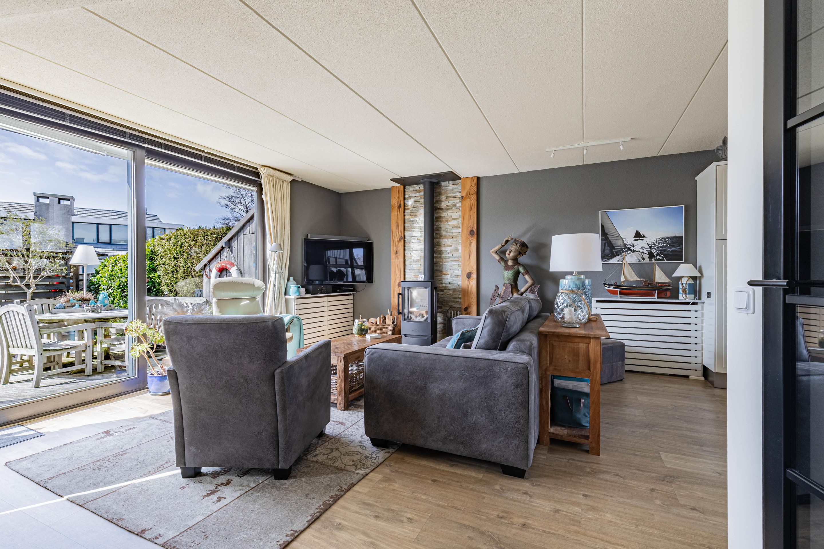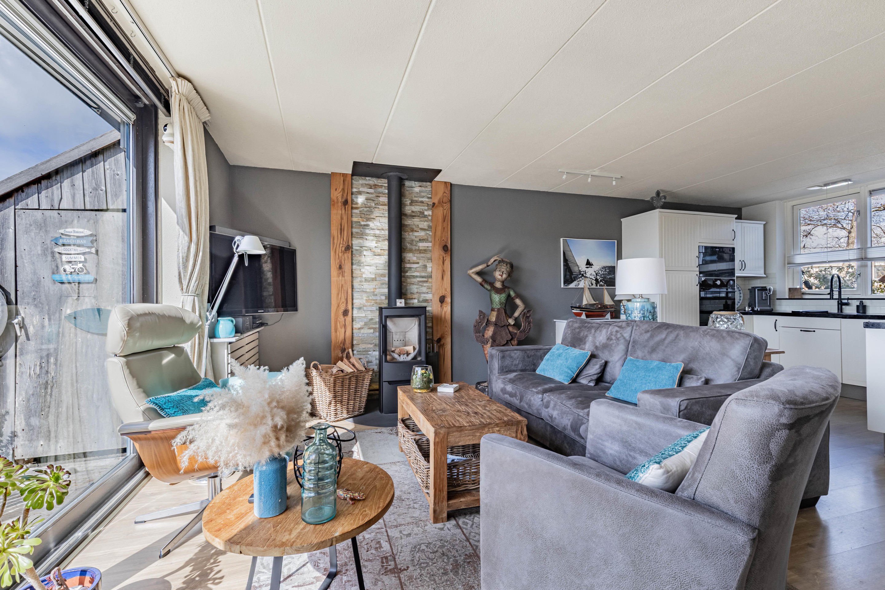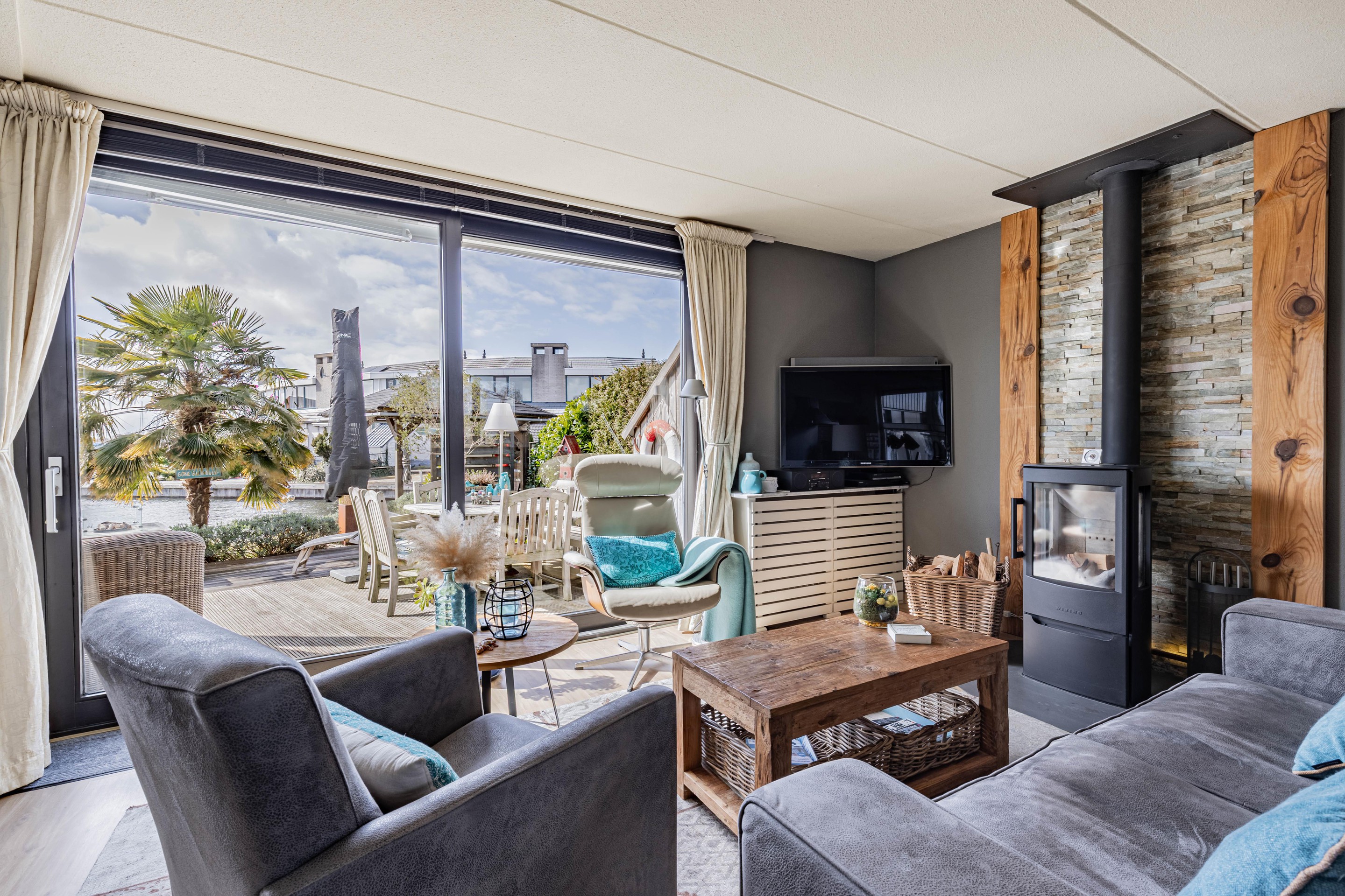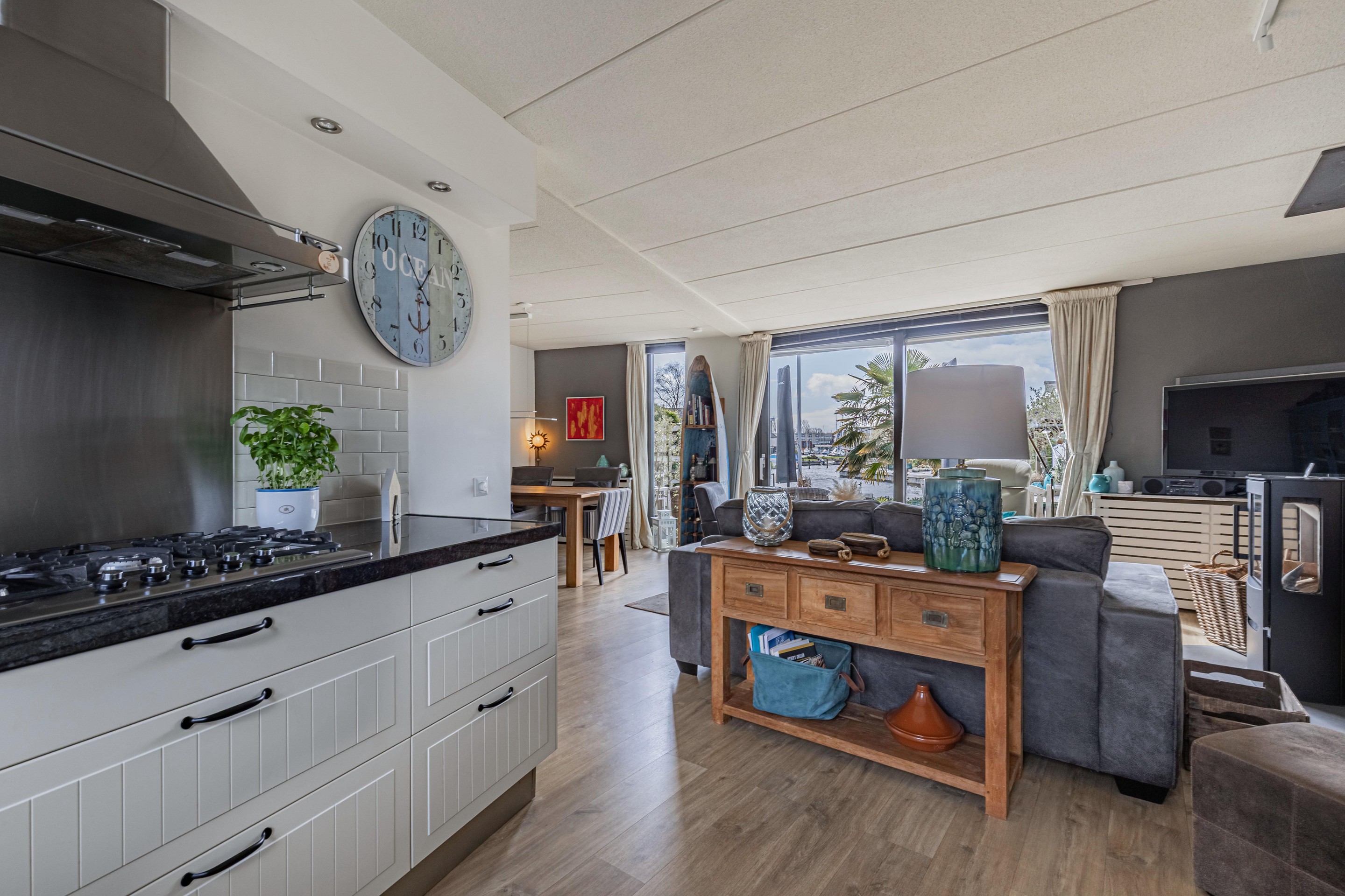 Binnen word je verwelkomd in een sfeervolle woonkamer met een warme houtkachel en een schuifpui die zorgt voor een mooie verbinding met de tuin en het water. De gezellige moderne keuken is voorzien van inbouwapparatuur en biedt alles wat je nodig hebt om hier met plezier te koken.
