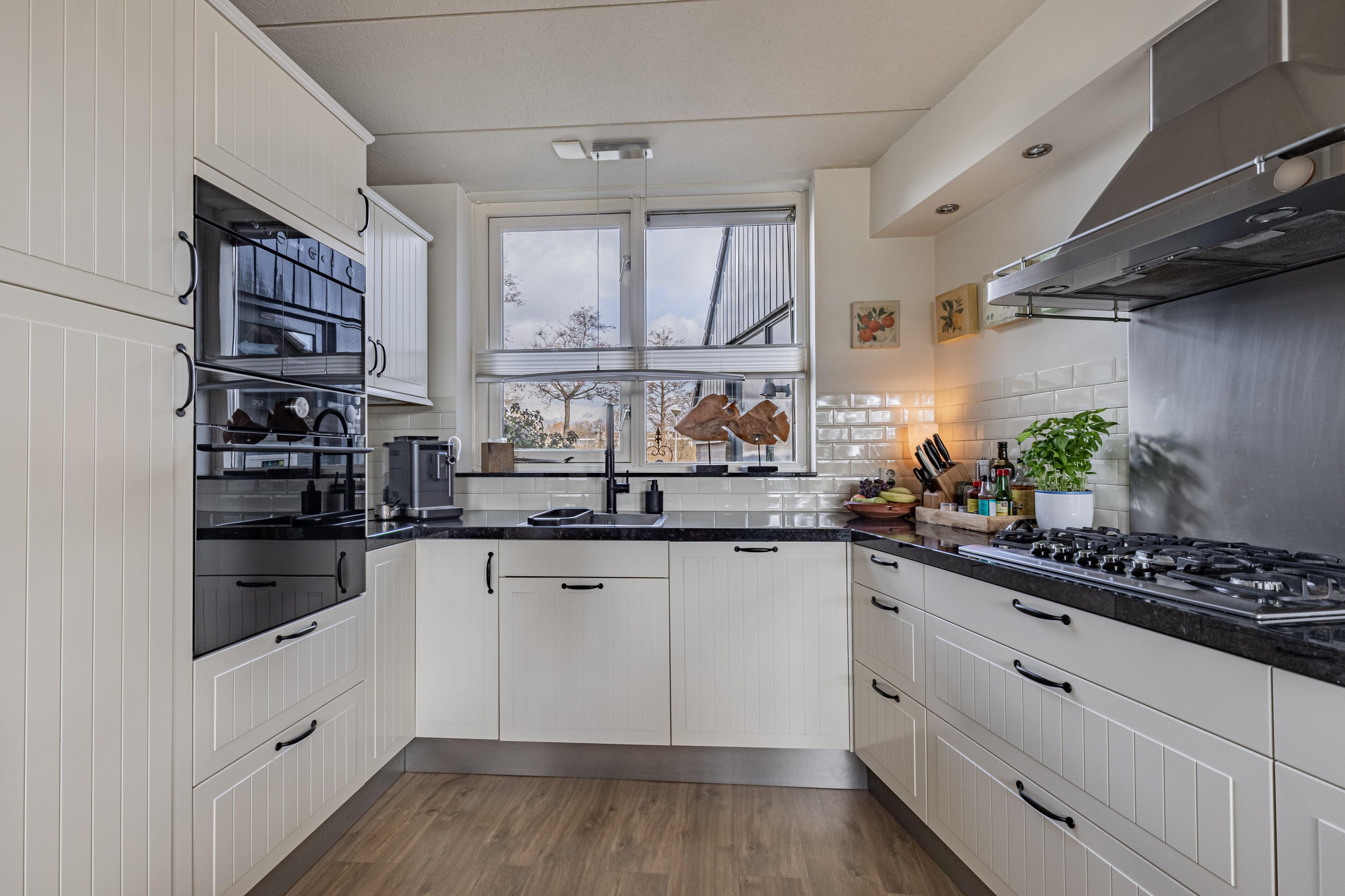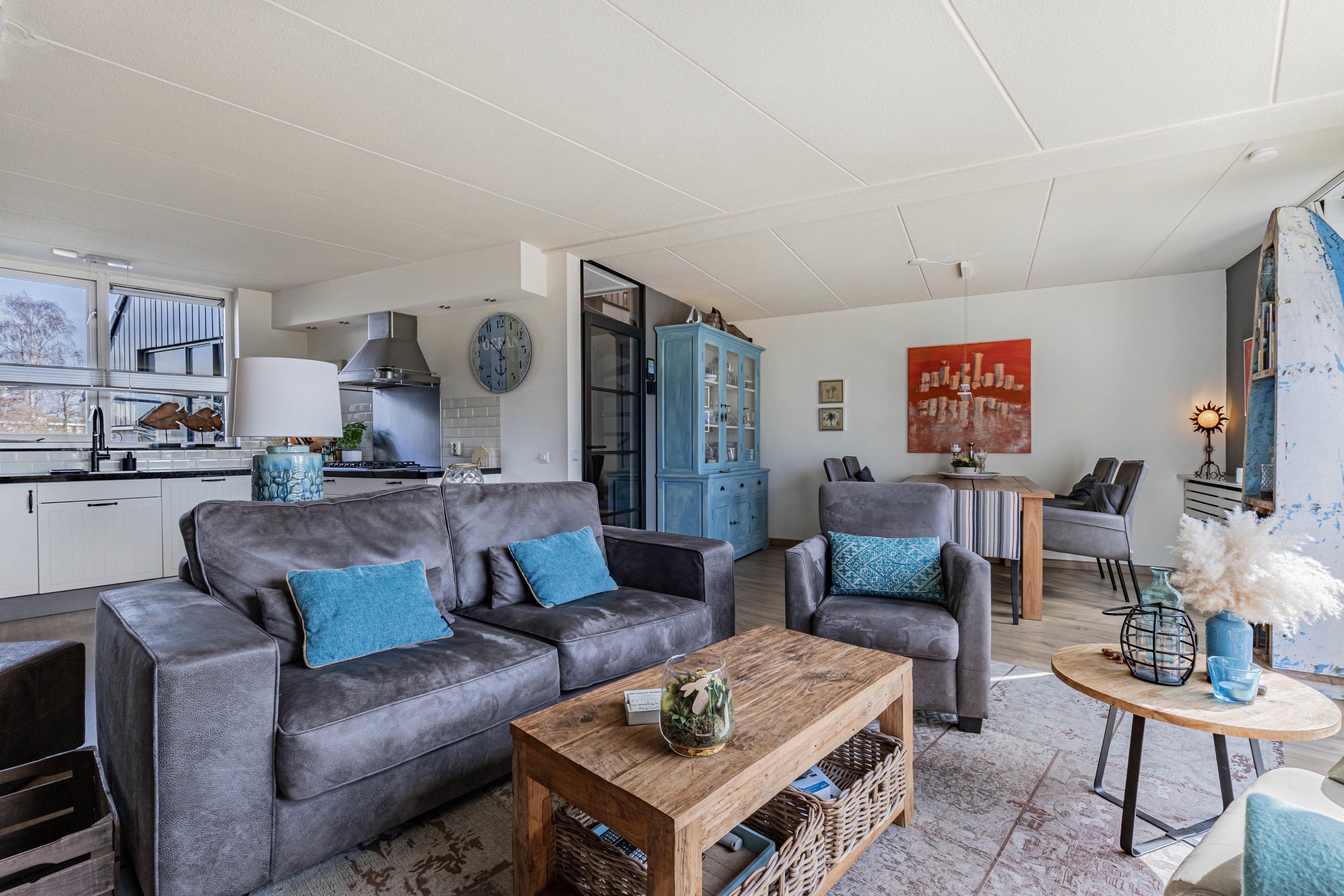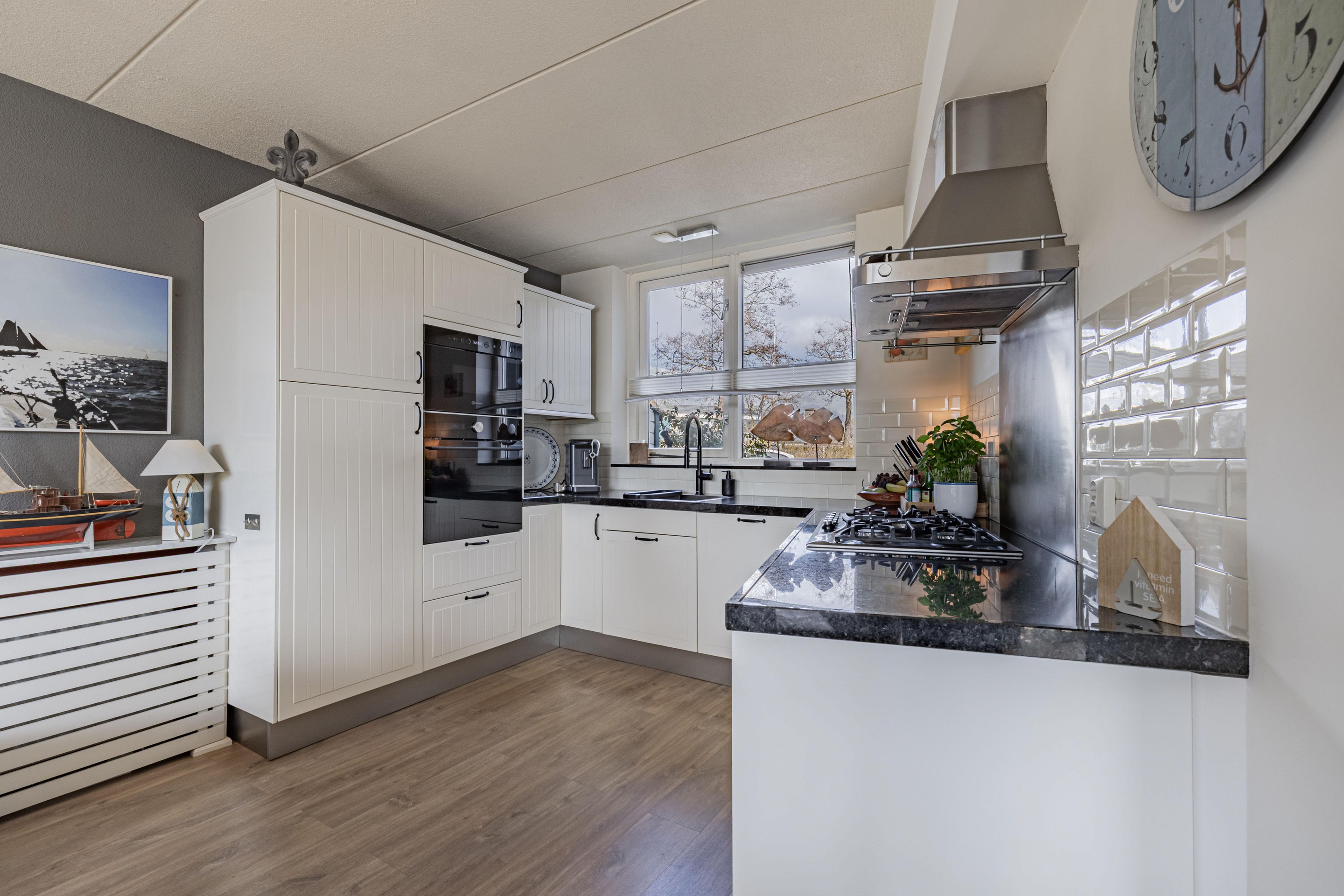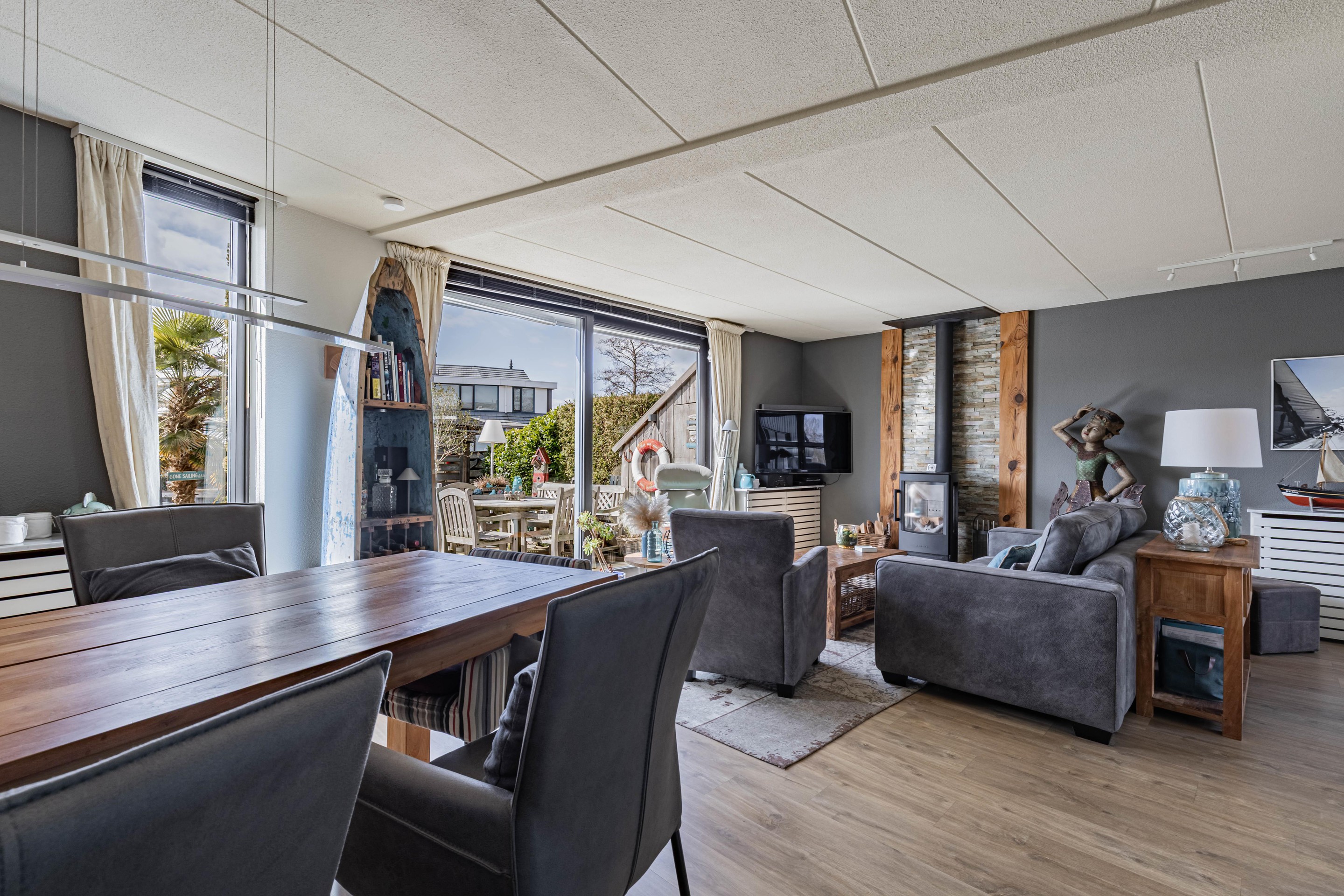 Binnen word je verwelkomd in een sfeervolle woonkamer met een warme houtkachel en een schuifpui die zorgt voor een mooie verbinding met de tuin en het water. De gezellige moderne keuken is voorzien van inbouwapparatuur en biedt alles wat je nodig hebt om hier met plezier te koken.
