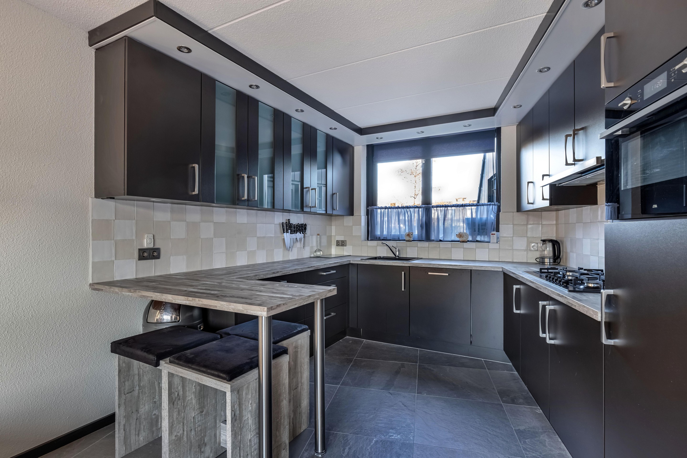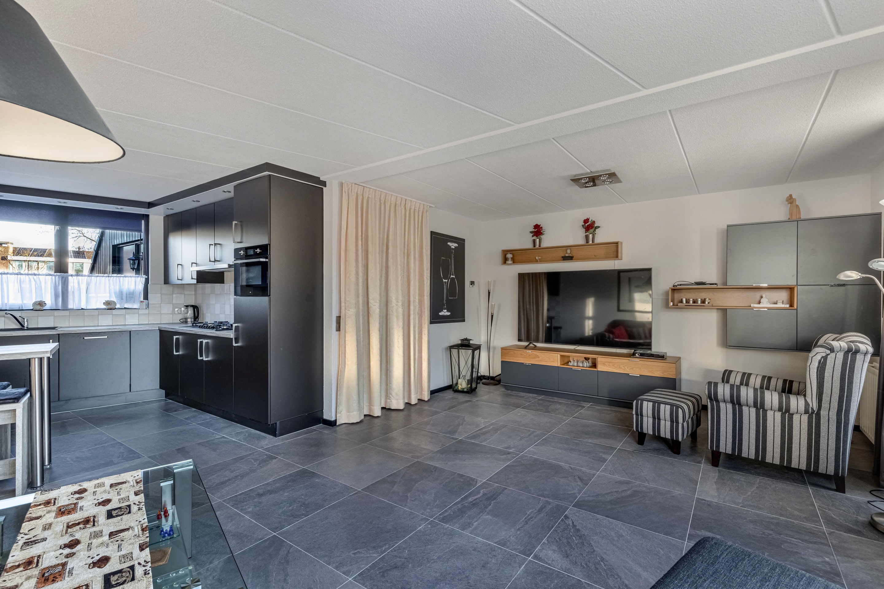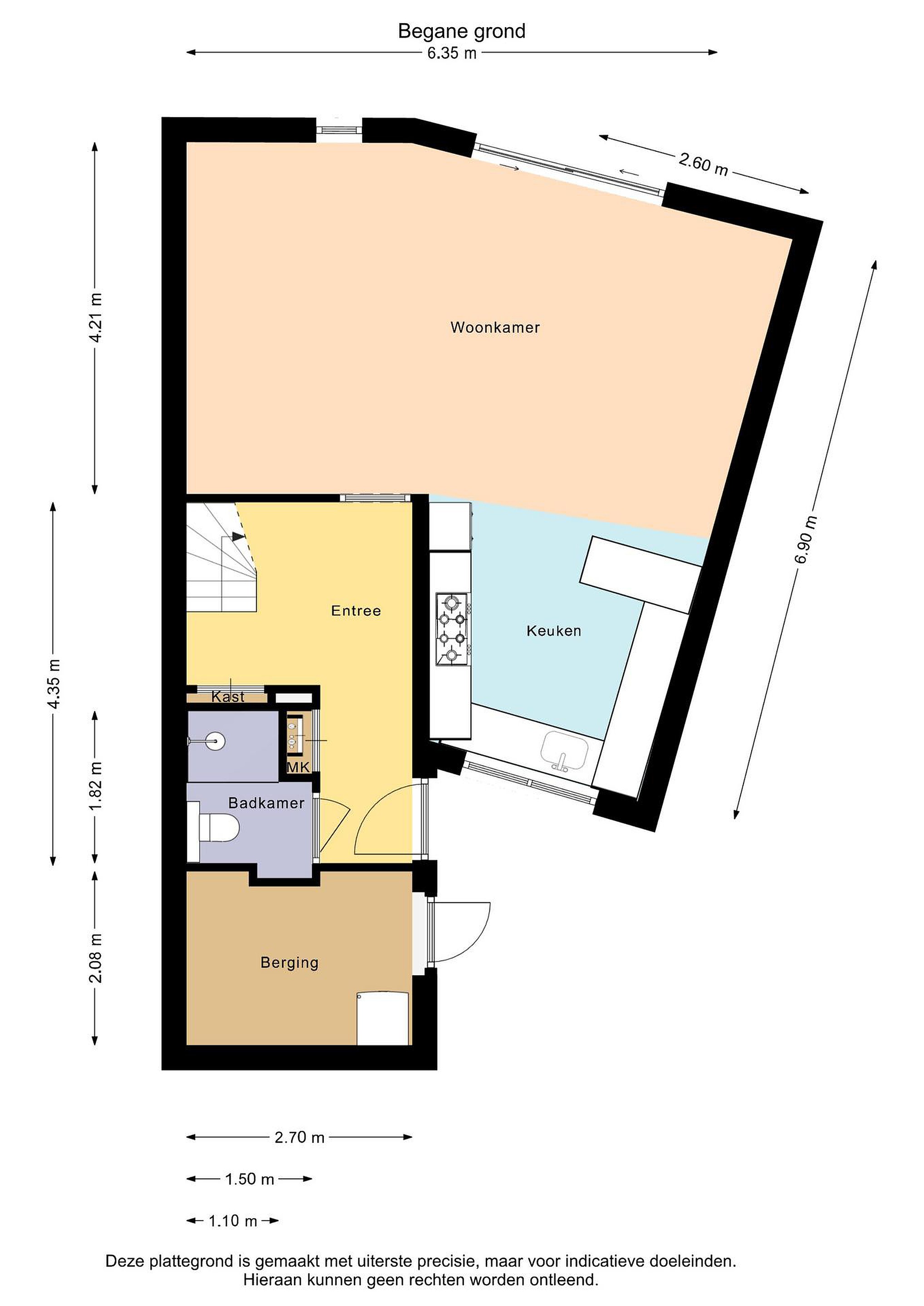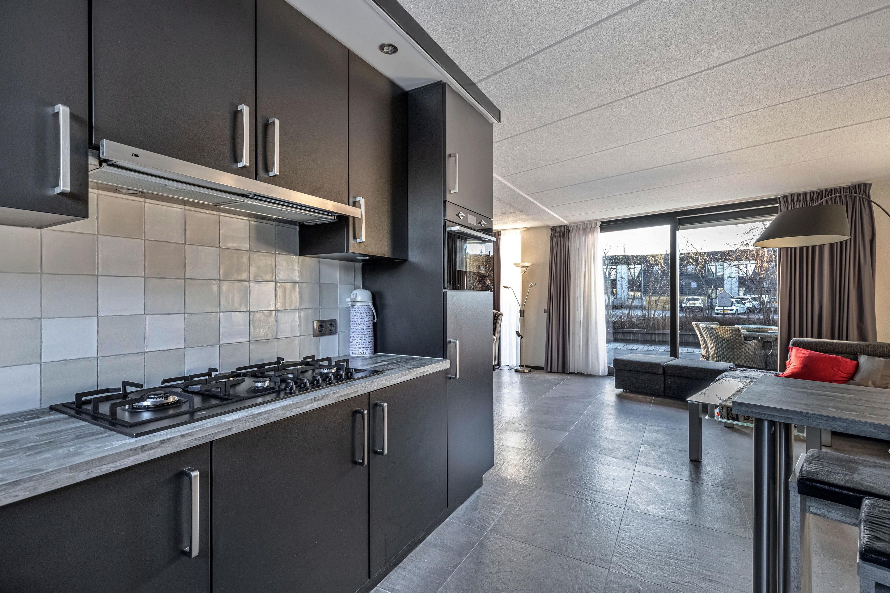 Begane grond entree/hal, modern toilet met douche, meterkast, tuingerichte woonkamer met schuifpui en open keuken met inbouwapparatuur zoals: 6-pits gasfornuis met afzuigkap, oven, koelkast en vaatwasser.