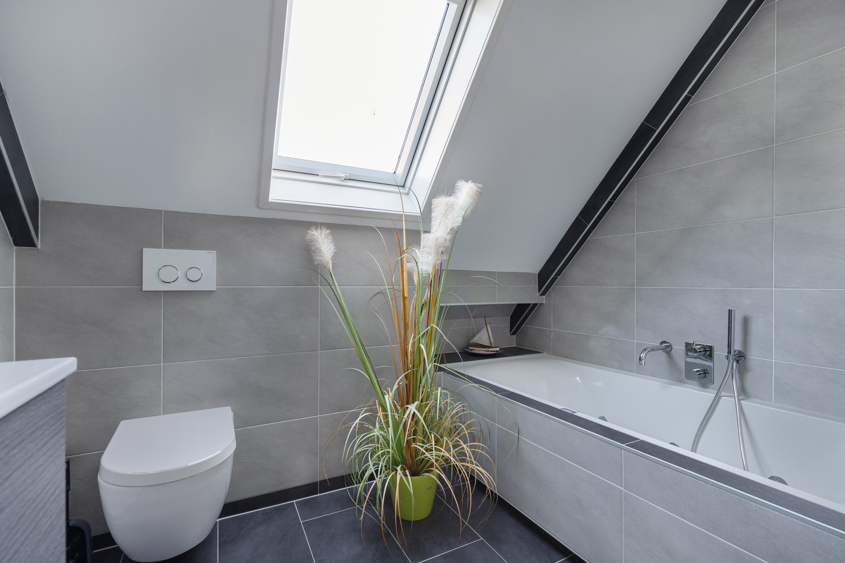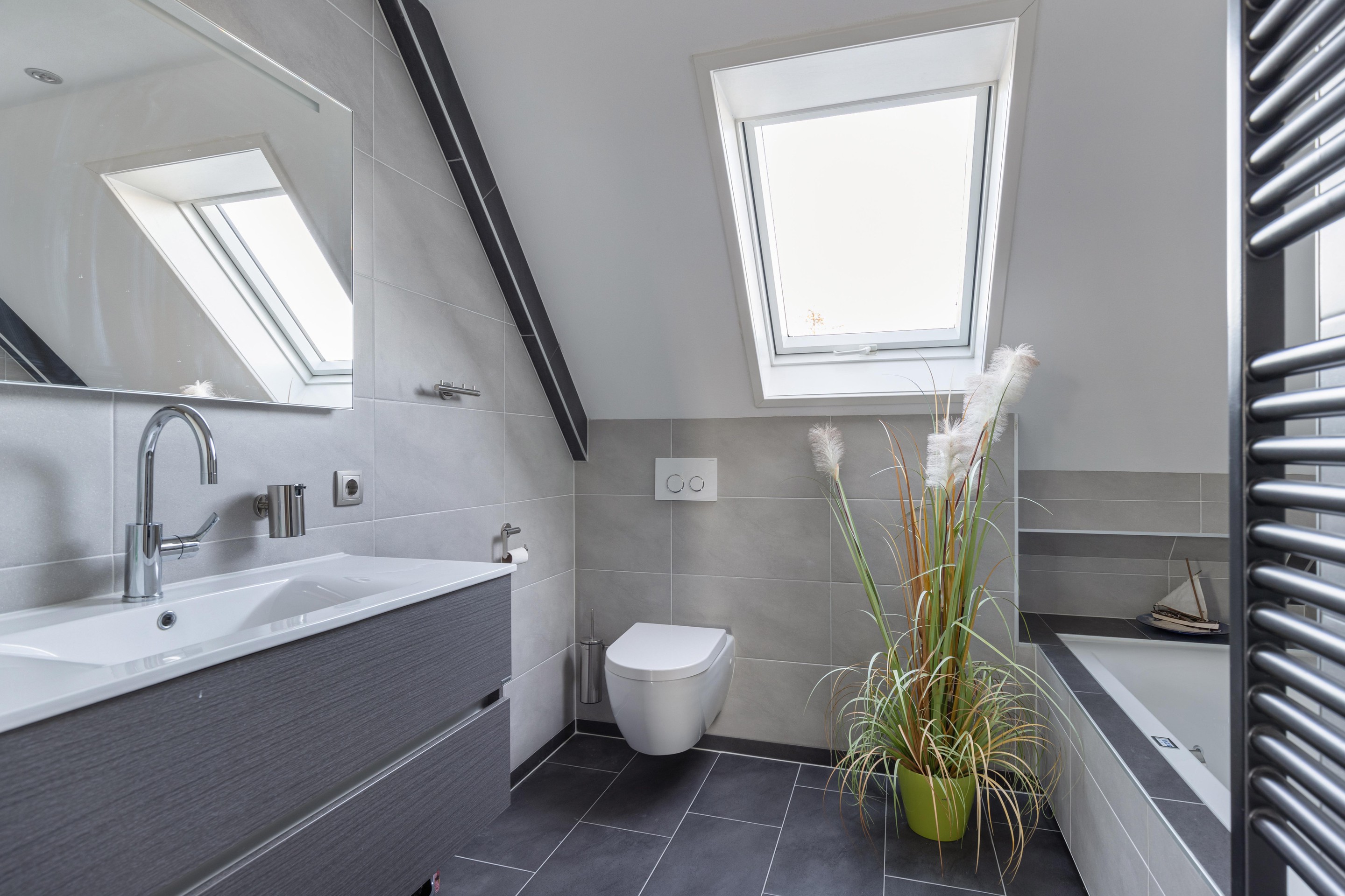 Eerste verdieping overloop, 3 slaapkamers waarvan 1 met sauna, moderne badkamer voorzien van: toilet, ligbad en wastafelmeubel.