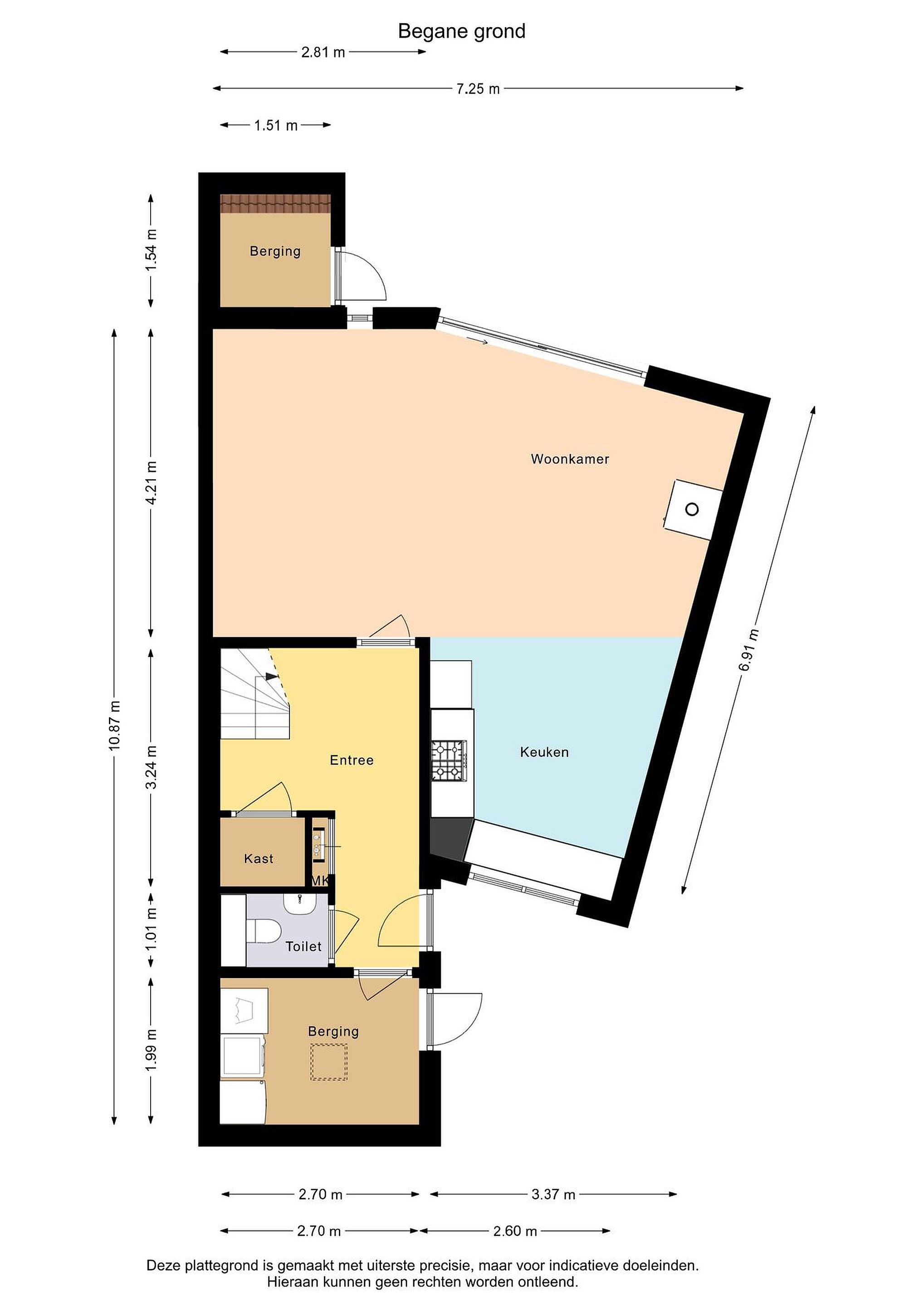 Begane grond entree/hal, berging met witgoedaansluiting, toilet met fontein, meterkast, bergkast, trapopgang, tuingerichte woonkamer met schuifpui en open keuken voorzien van: Gasfornuis met afzuigkap, oven, vaatwasser en koelkast.