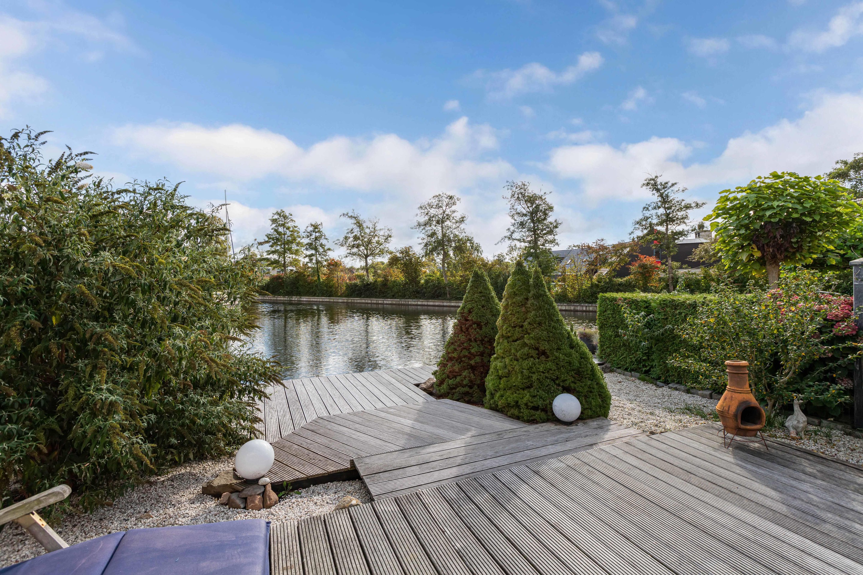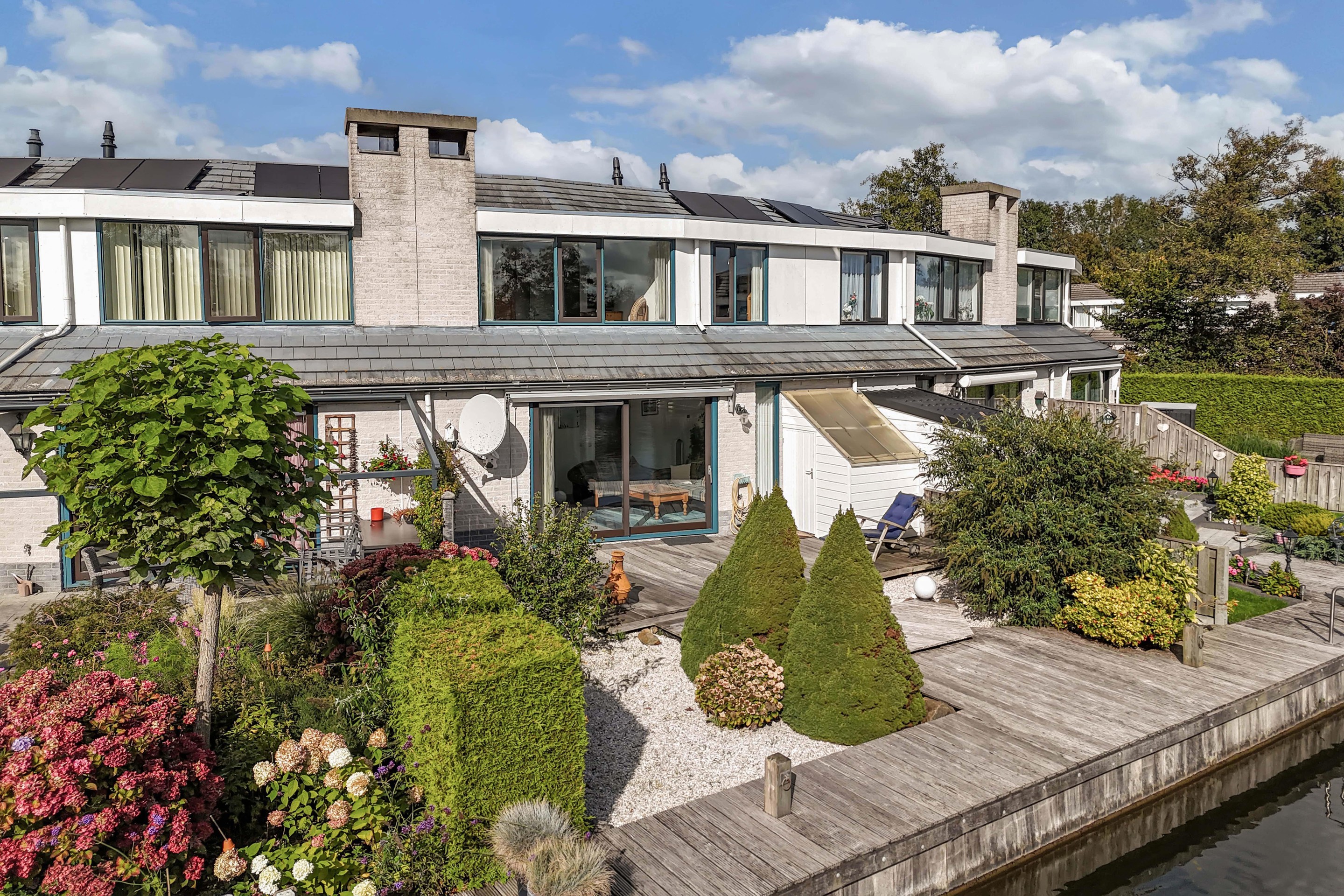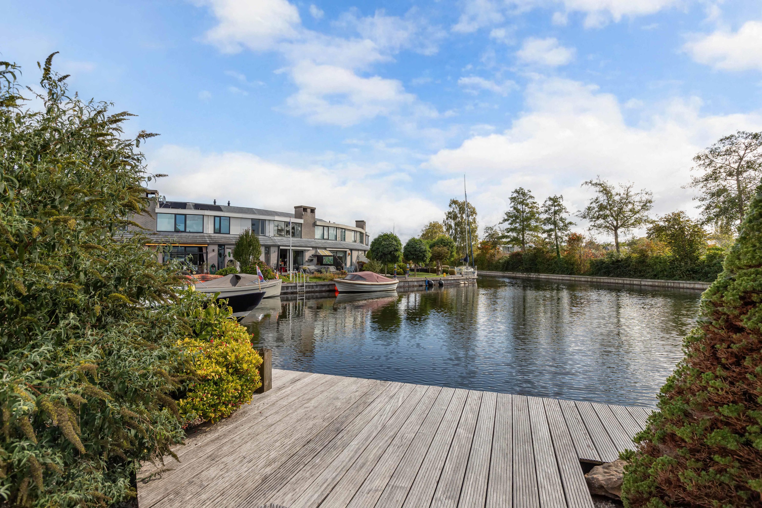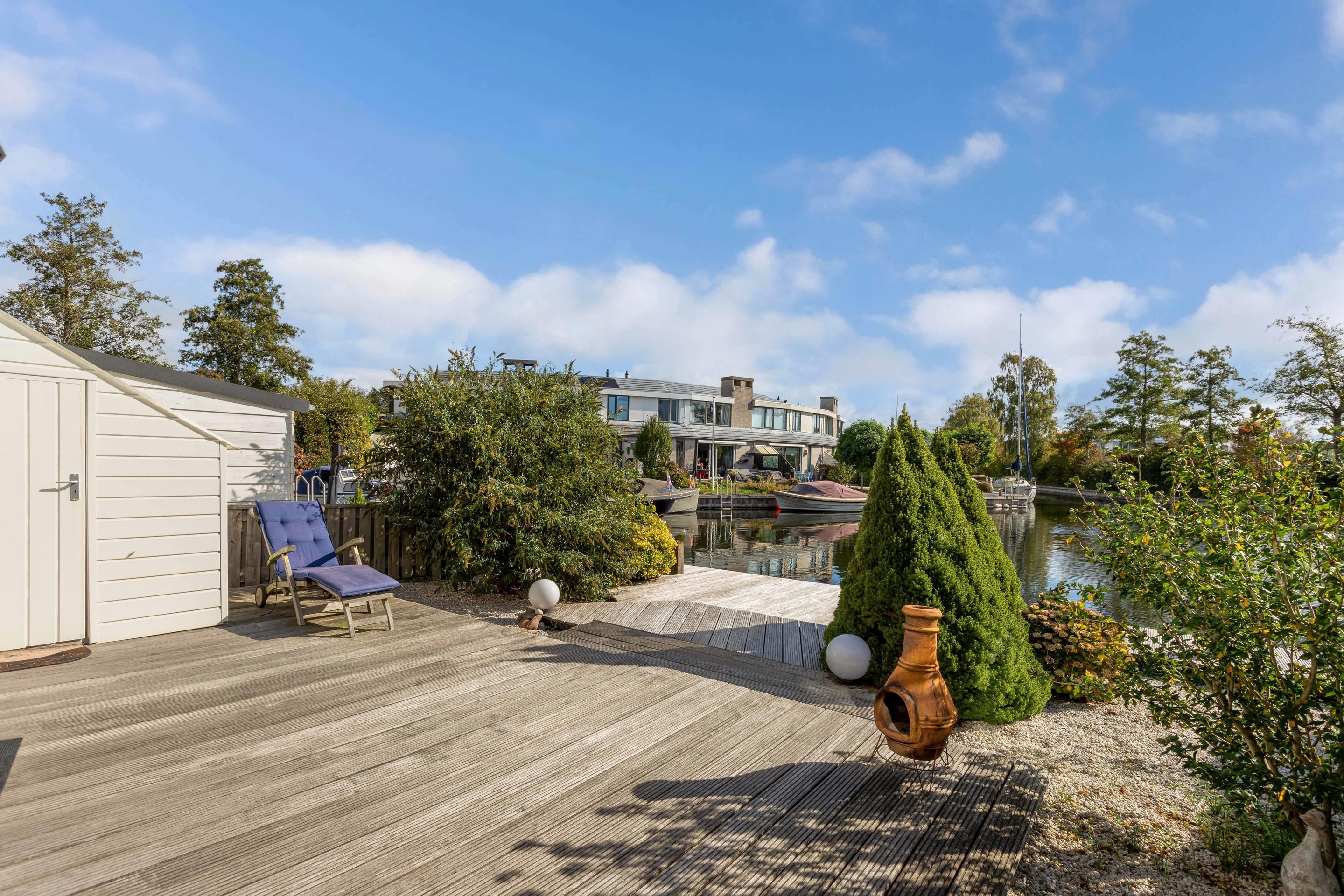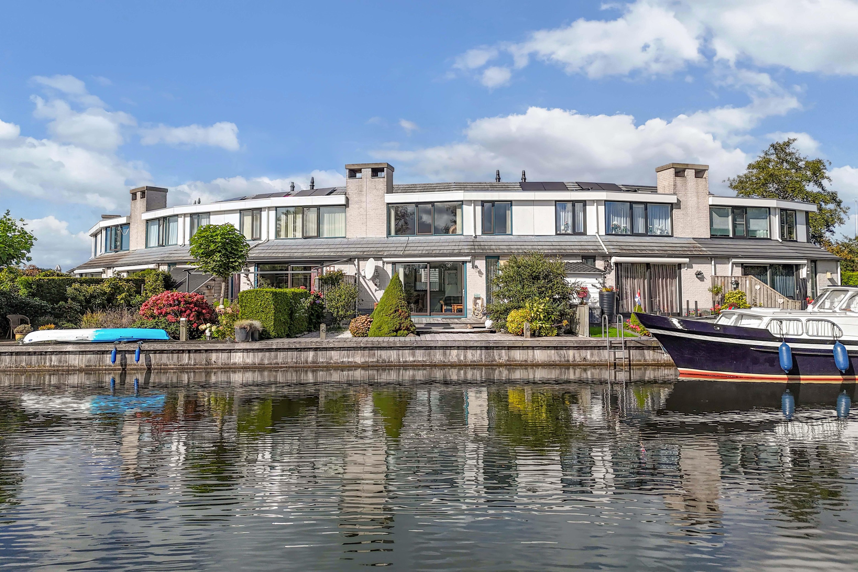 De woonkamer is gericht op de tuin en het water, waardoor binnen en buiten moeiteloos in elkaar overlopen. De achtertuin is fraai aangelegd met vlonders aan de waterkant: een ideale plek voor een kop koffie in de ochtendzon of een gezellige borrel met vrienden.