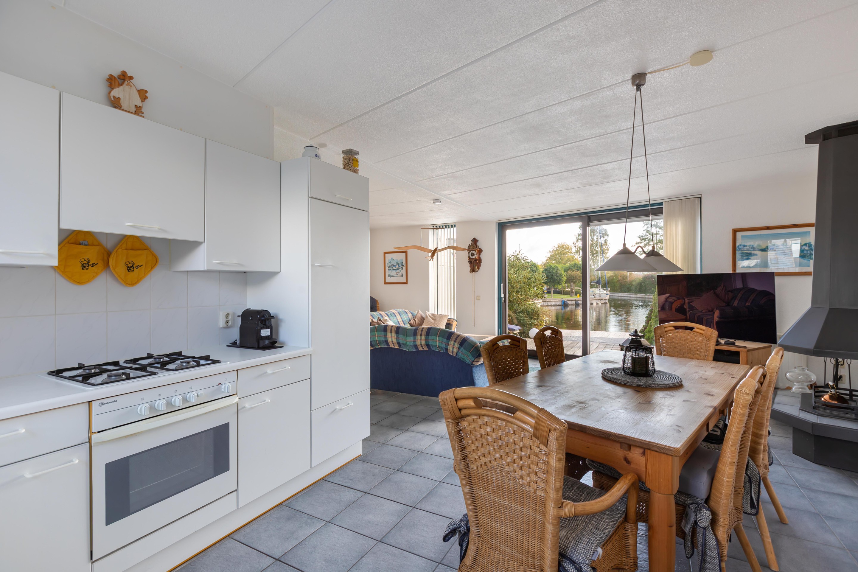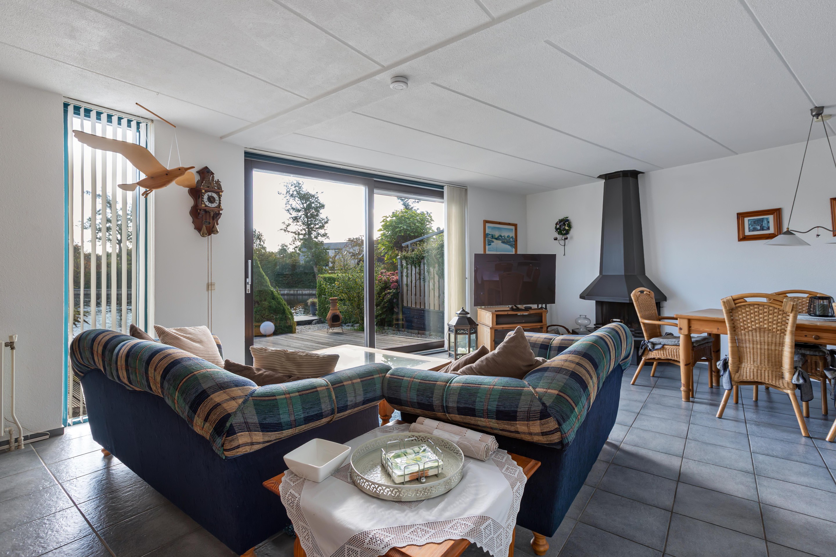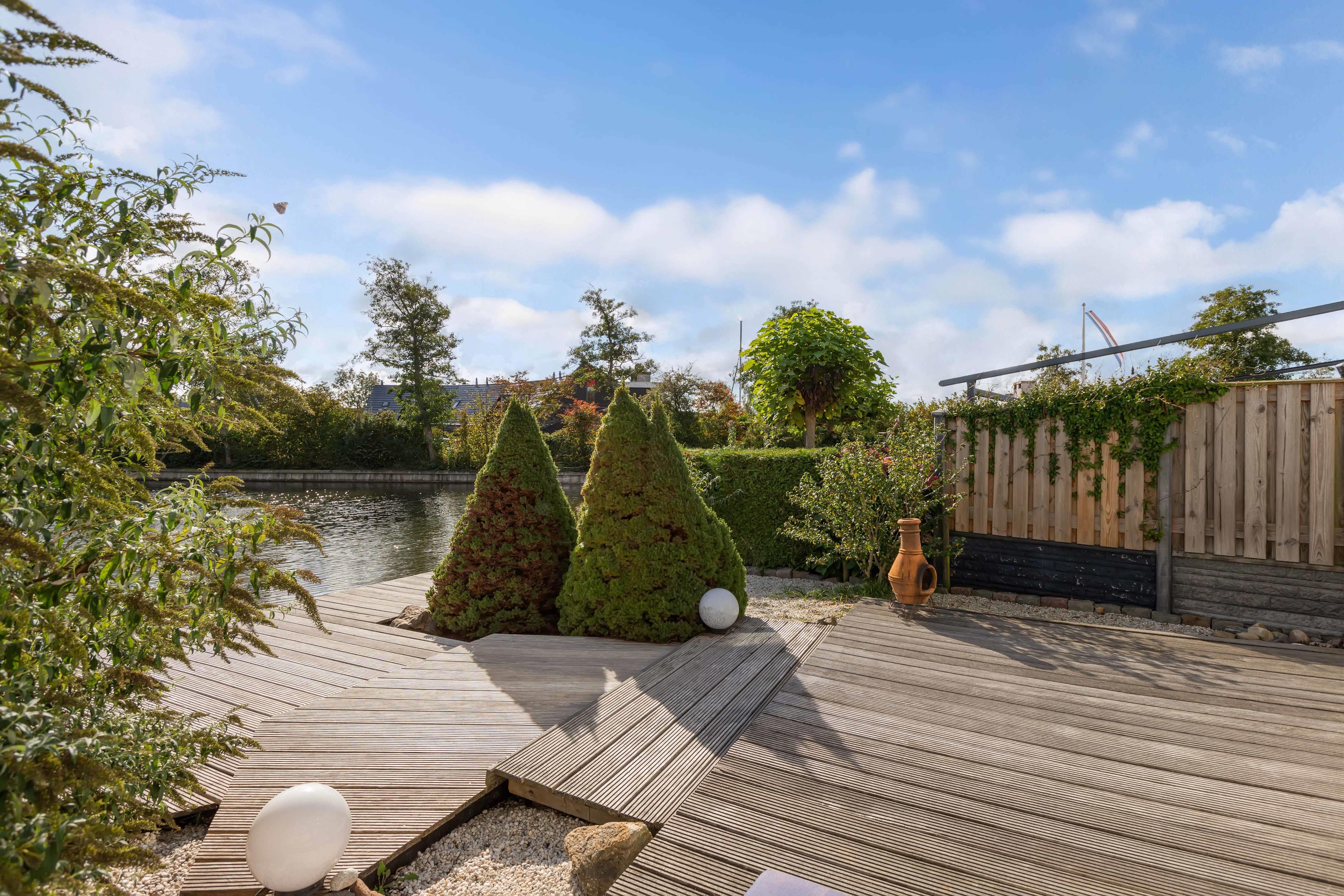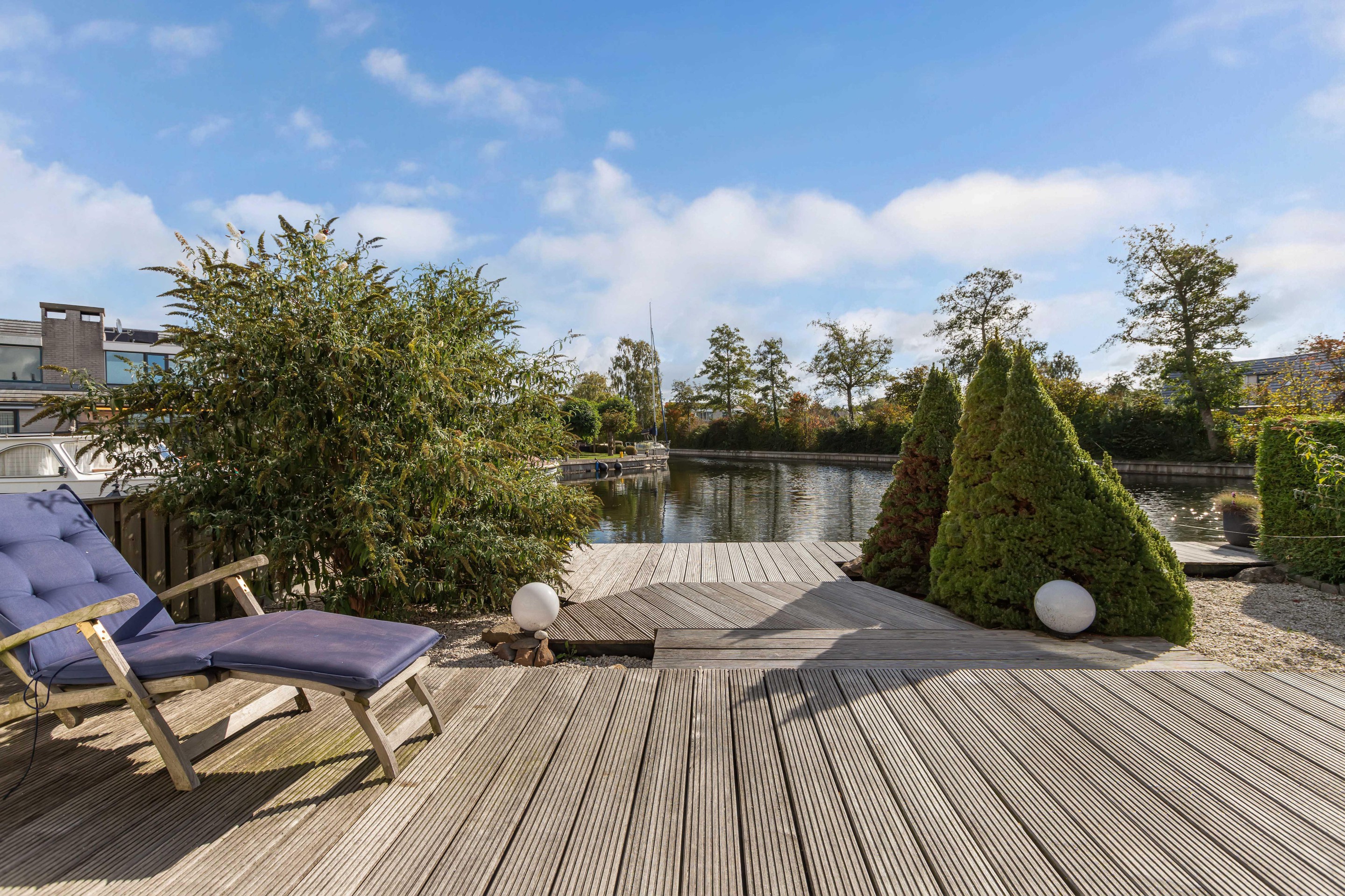 De woonkamer is gericht op de tuin en het water, waardoor binnen en buiten moeiteloos in elkaar overlopen. De achtertuin is fraai aangelegd met vlonders aan de waterkant: een ideale plek voor een kop koffie in de ochtendzon of een gezellige borrel met vrienden.