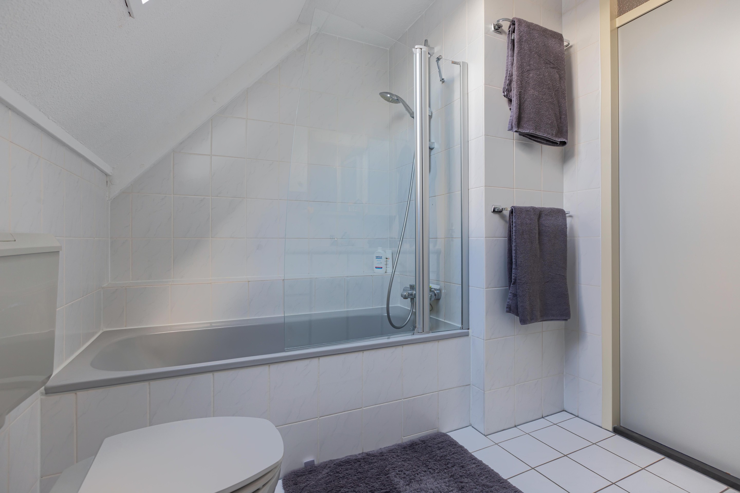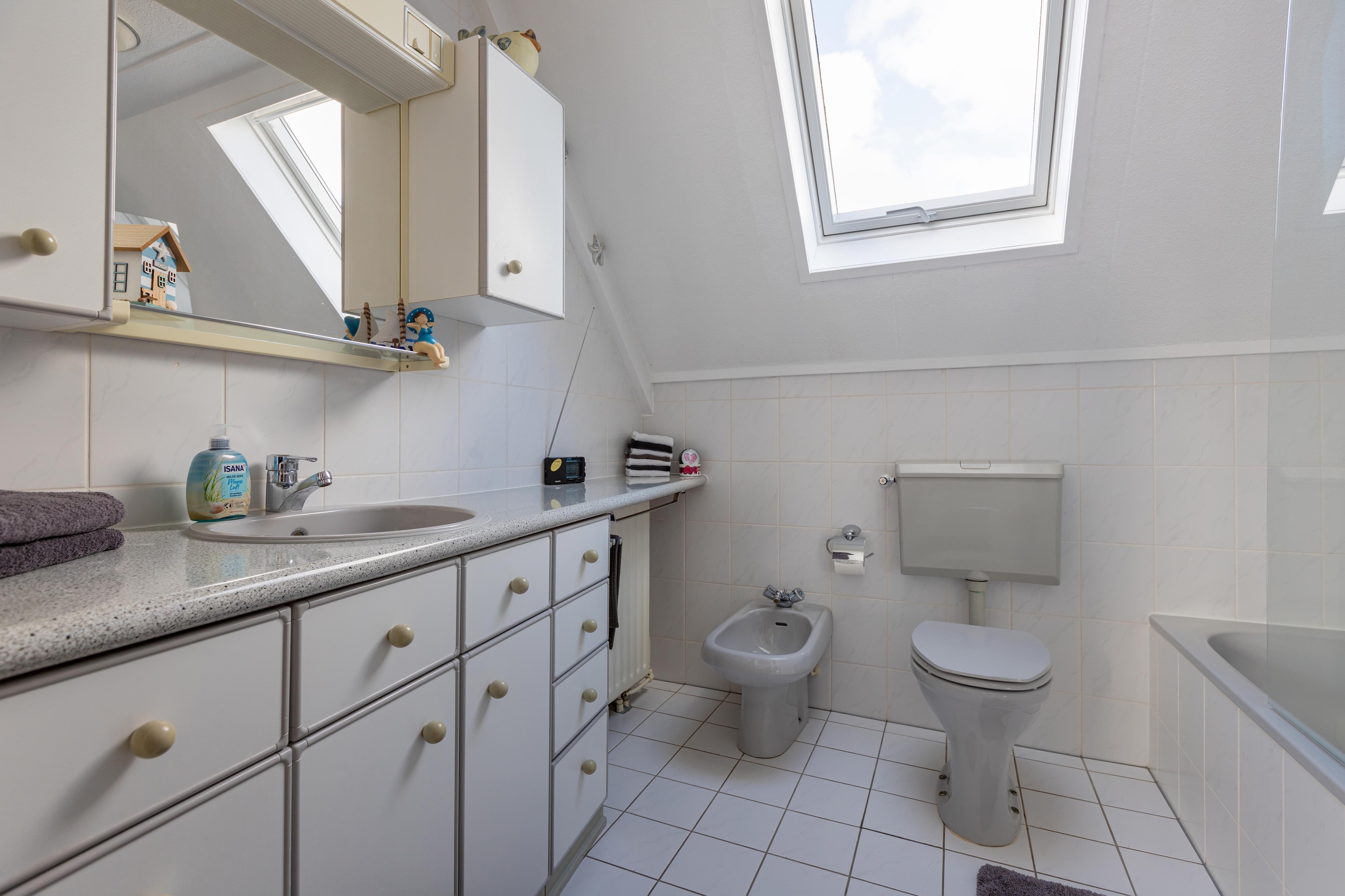 Eerste verdieping overloop, 3 slaapkamers, badkamer met ligbad, douche, wastafelmeubel, toilet en bidet.