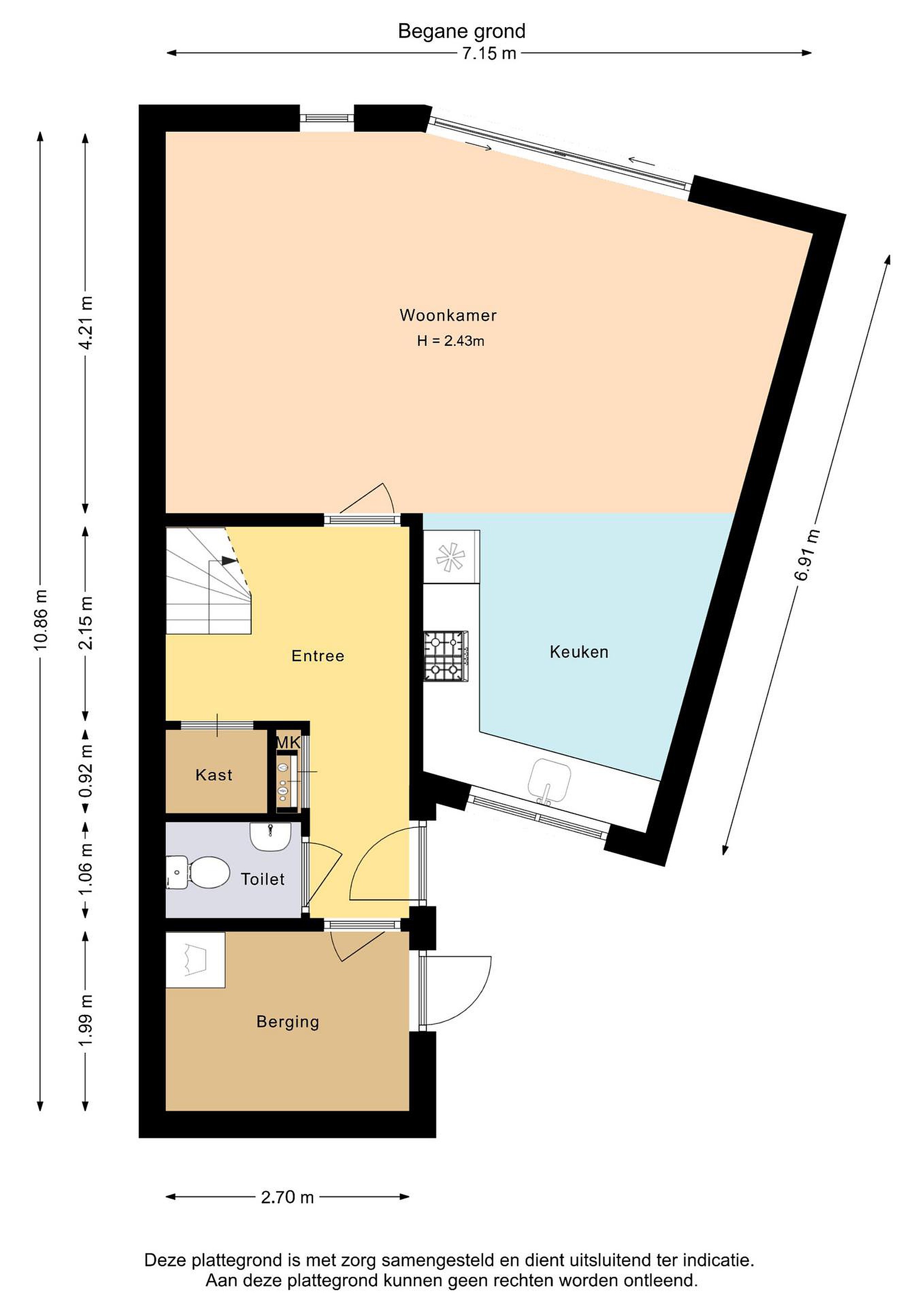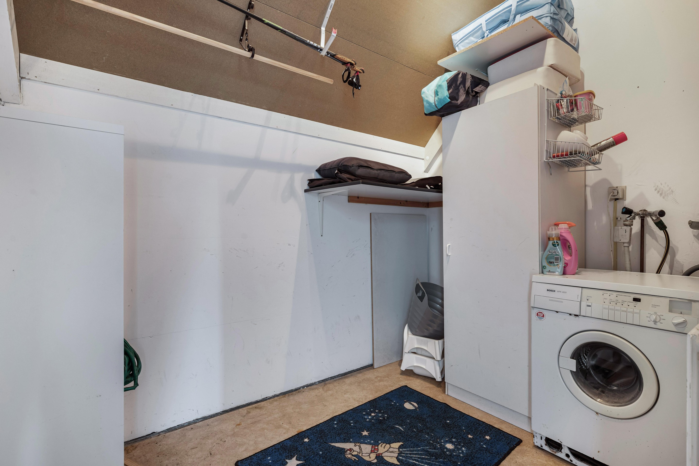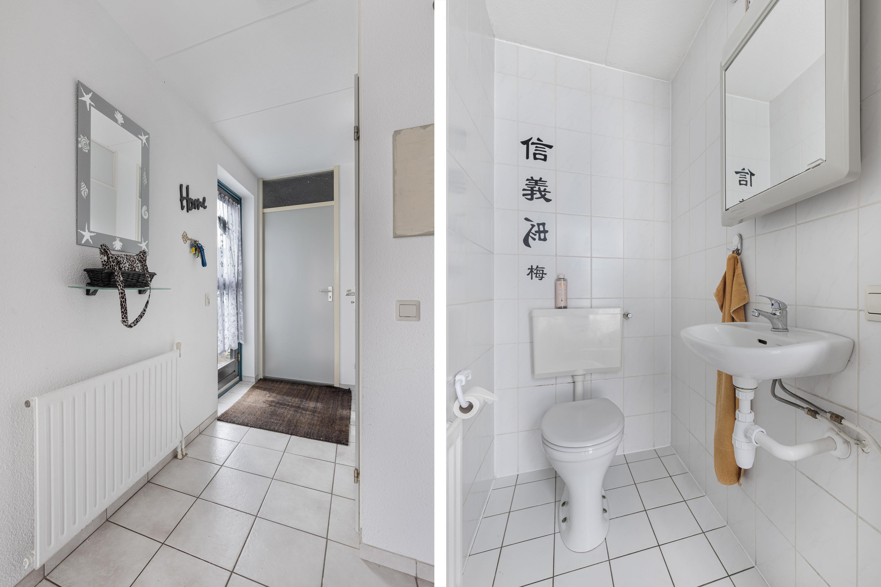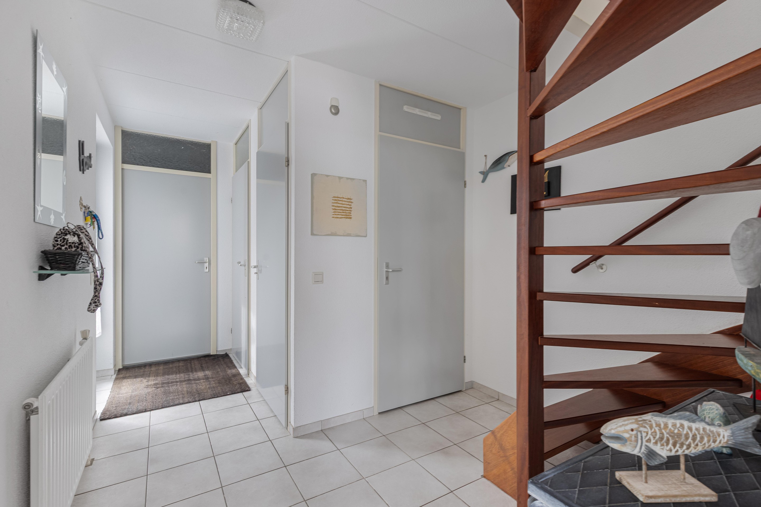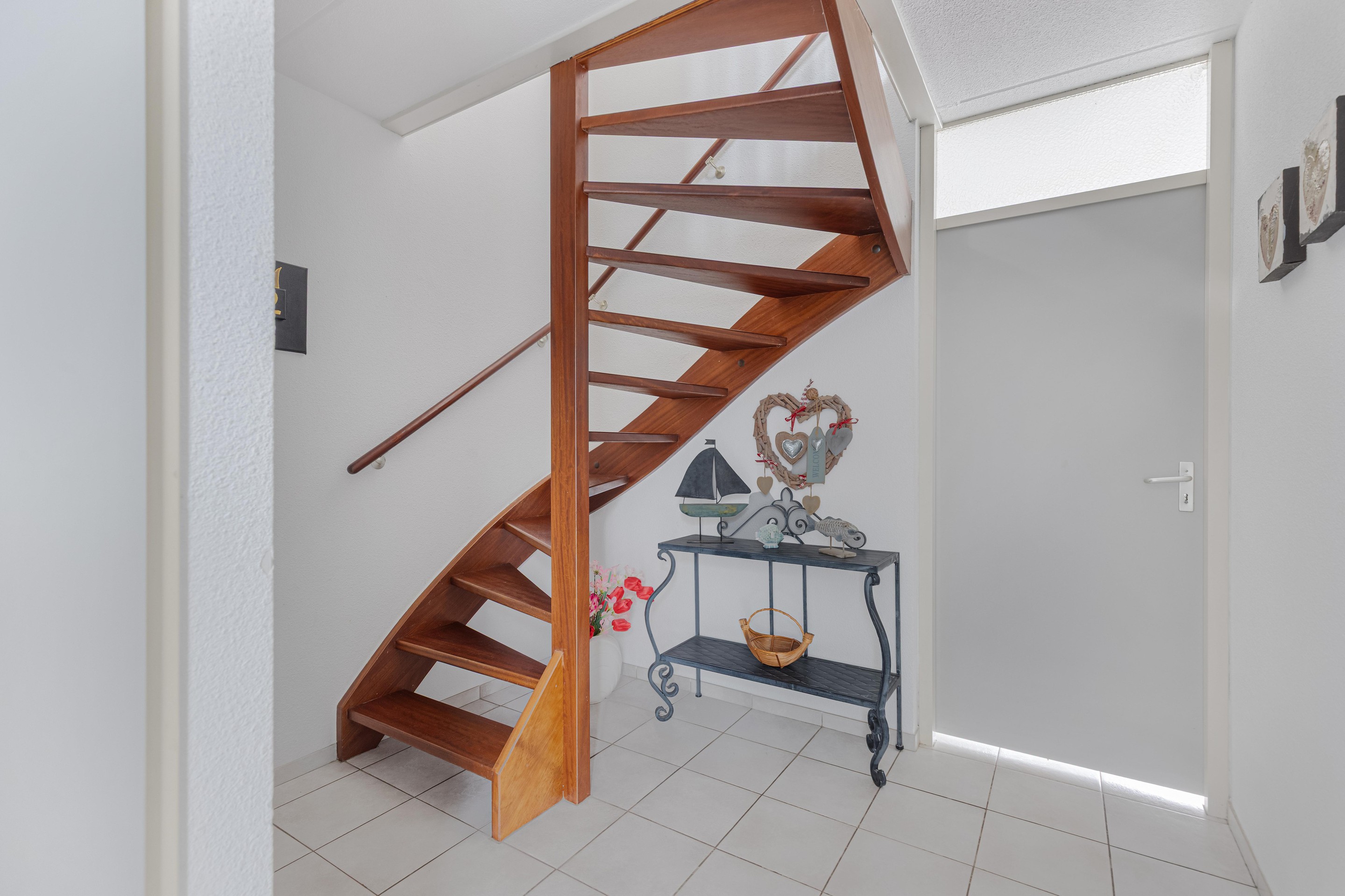 Begane grond entree/hal, berging met witgoedaansluiting, toilet met fontein, meterkast, bergkast, trapopgang, tuingerichte woonkamer met schuifpui en zicht op het water, open hoekkeuken met gasfornuis en oven.