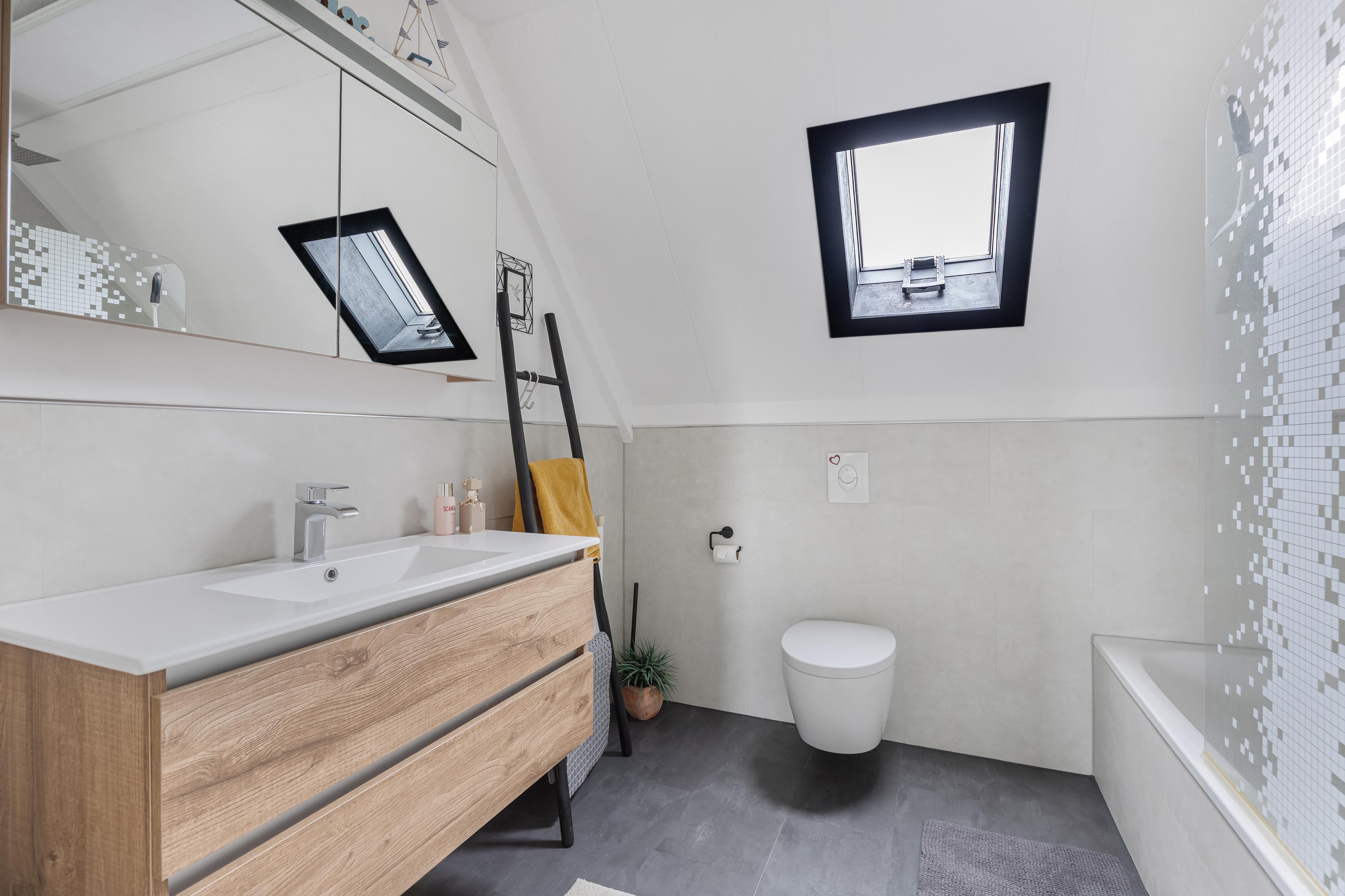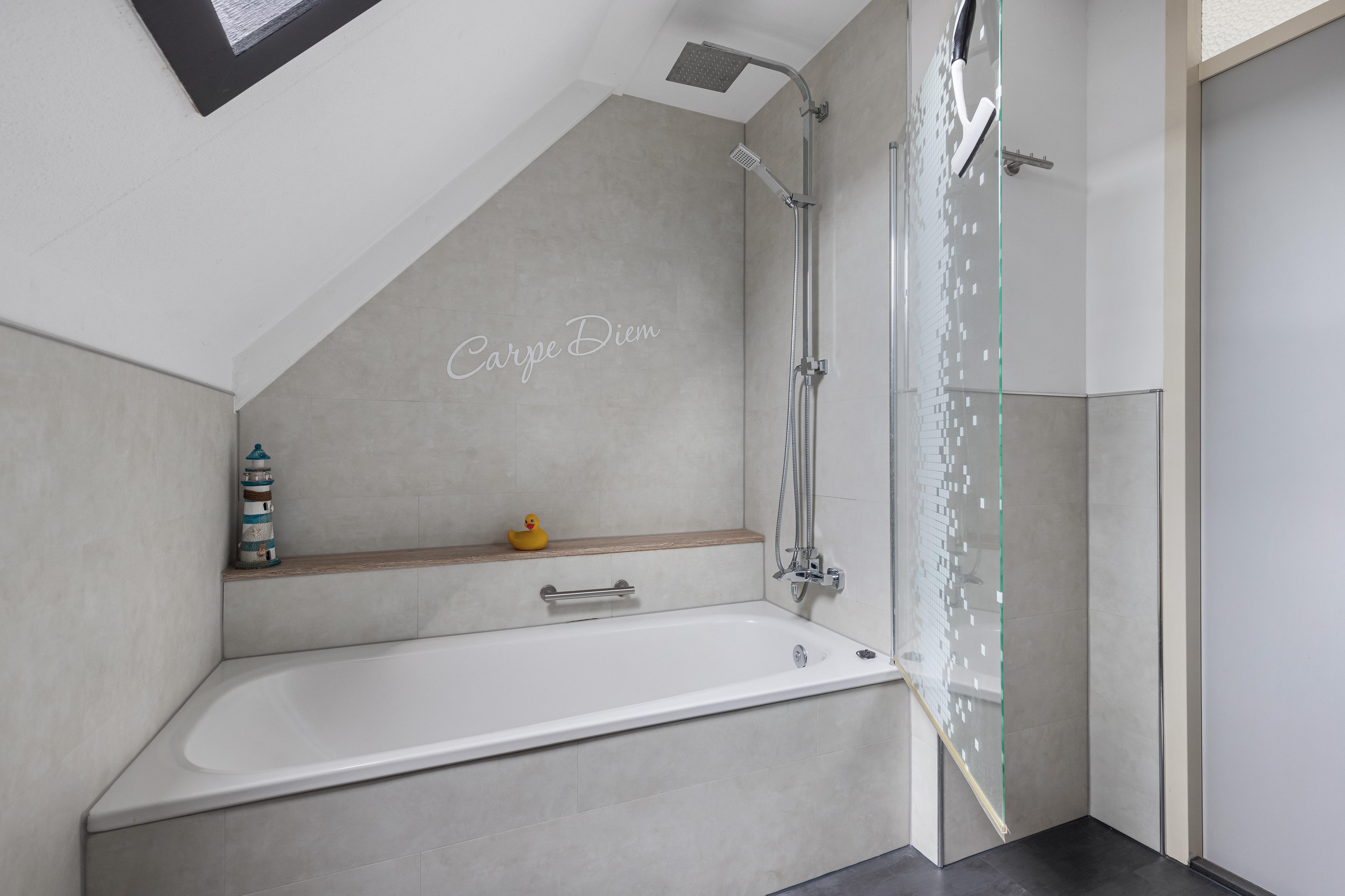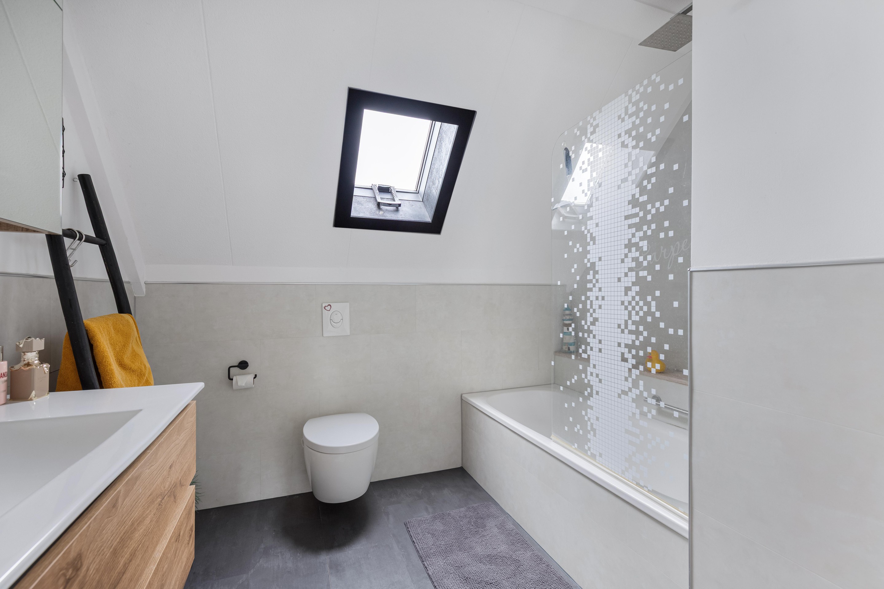 Eerste verdieping overloop, kast met cv-opstelling, 3 slaapkamers en moderne badkamer voorzien van ligbad met douche, toilet en wastafelmeubel.