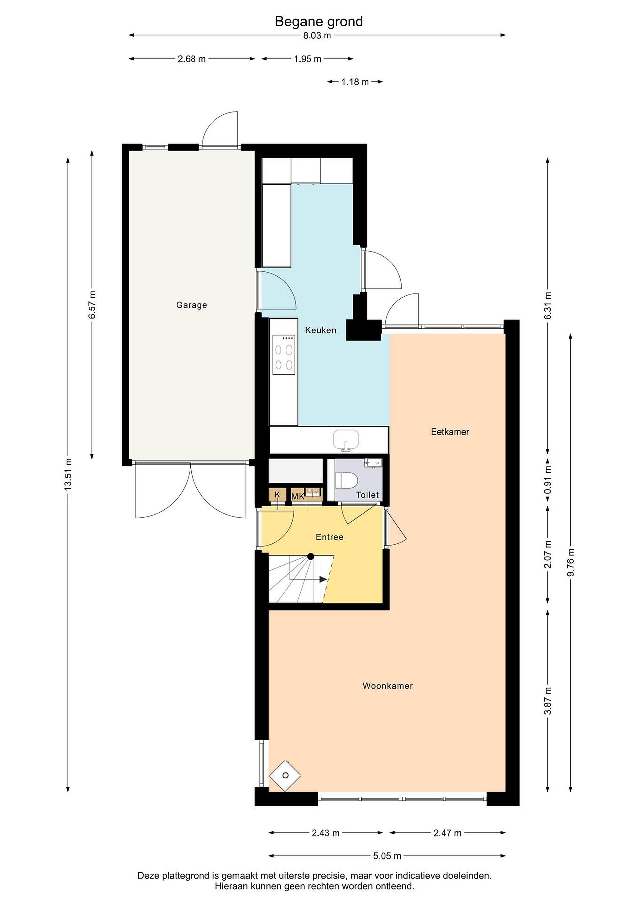 Begane grond entree/hal, meterkast, toilet met fontein, trapopgang, woonkamer voorzien van vloerverwarming, visgraatvloer en paletkachel, moderne open keuken voorzien van inbouwapparatuur zoals: inductiekookplaat met afzuiging, quooker, vaatwasser, ovens, koelkast en vriezer. Via de keuken kom je in de achtertuin en in de garage.
