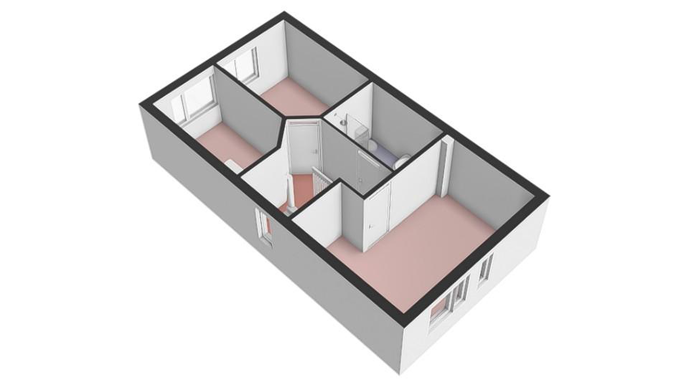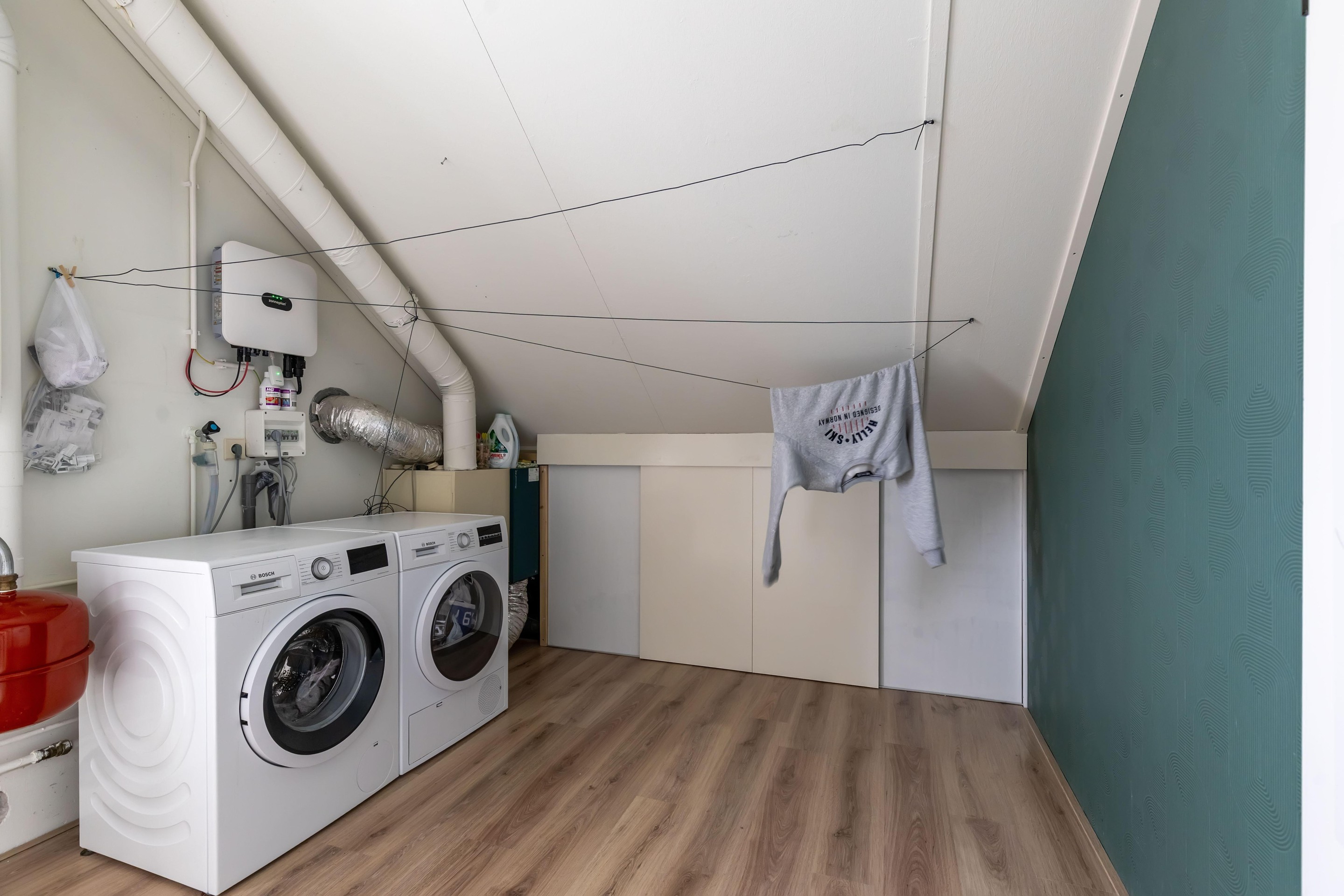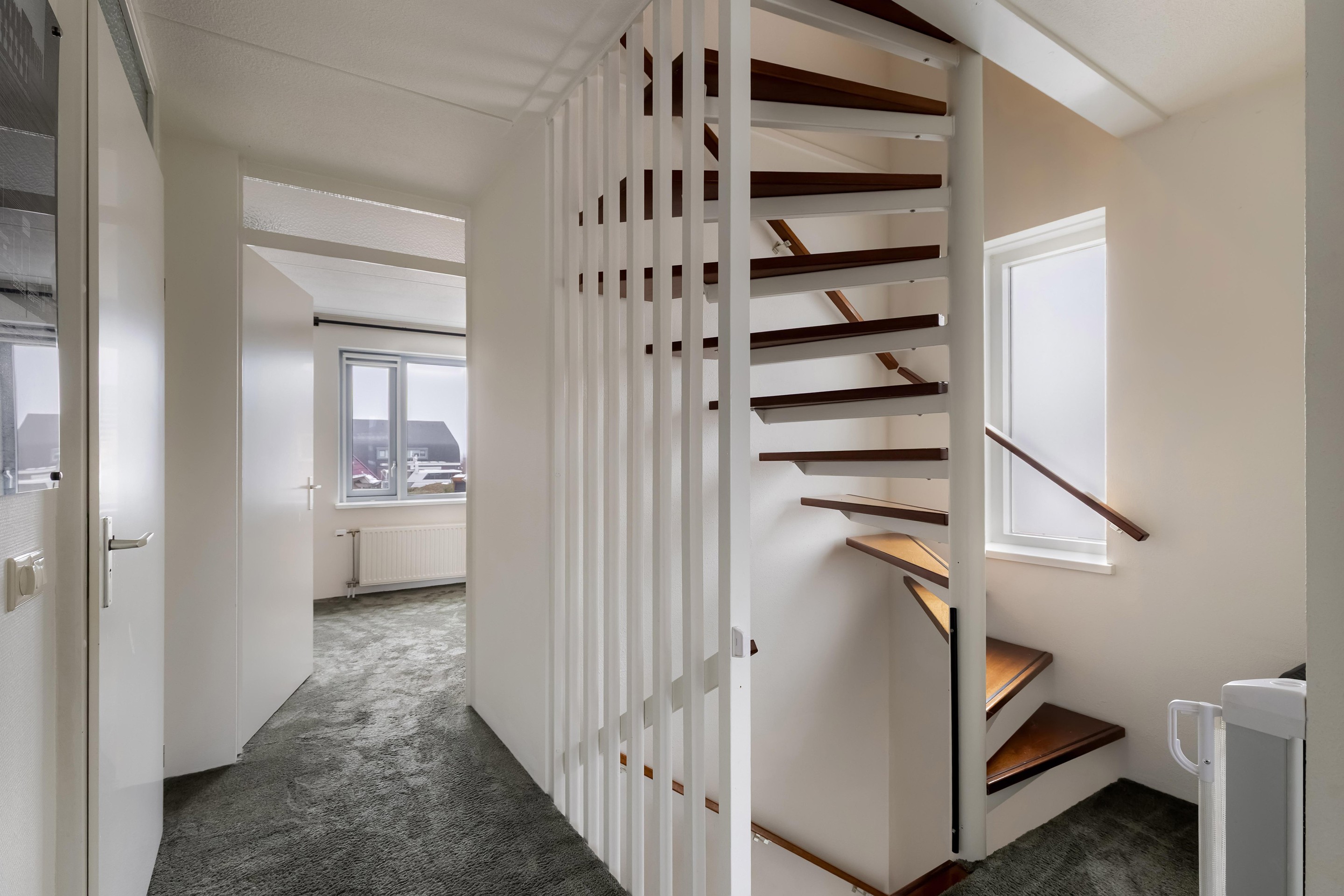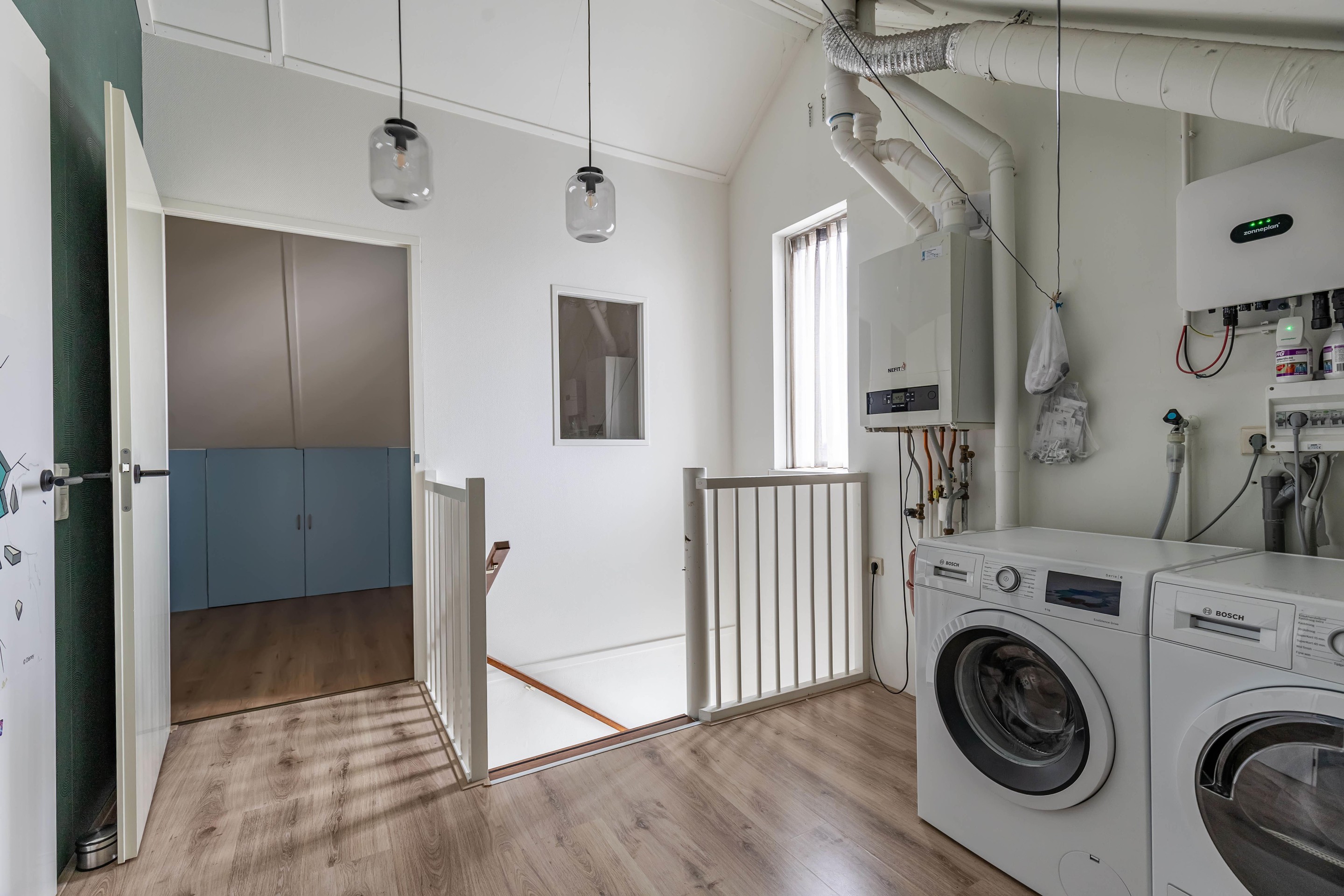 Tweede verdieping overloop met cv-opstelling en witgoedaansluiting, 2 (slaap)kamers.