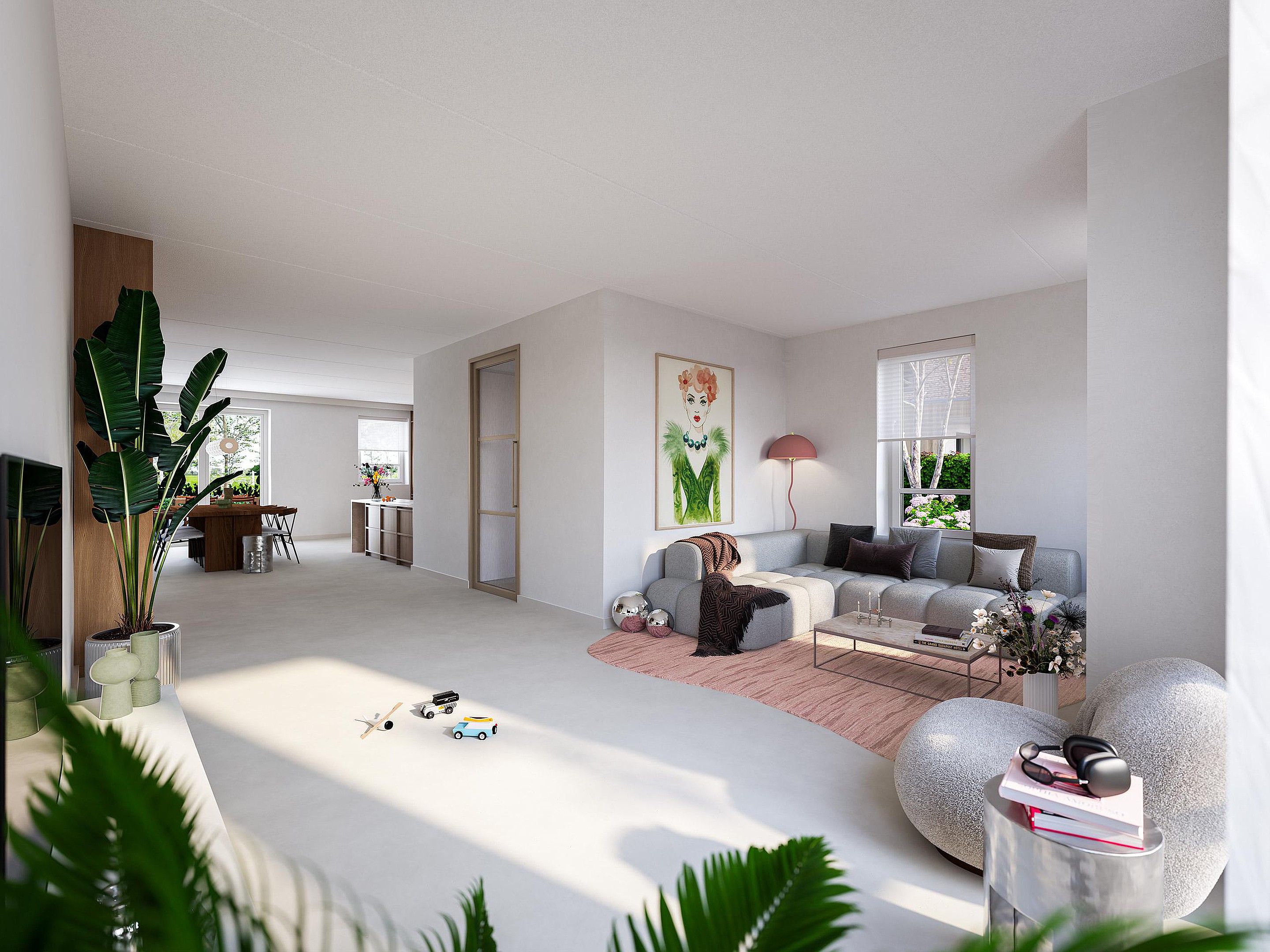 De woning heeft een ruime, u vormige woonkamer met open keuken, openslaande deuren naar de tuin en een berging van 5 meter lang. In de berging vind je de aardwarmtepomp, waarmee de woning duurzaam en energiezuinig wordt verwarmd.