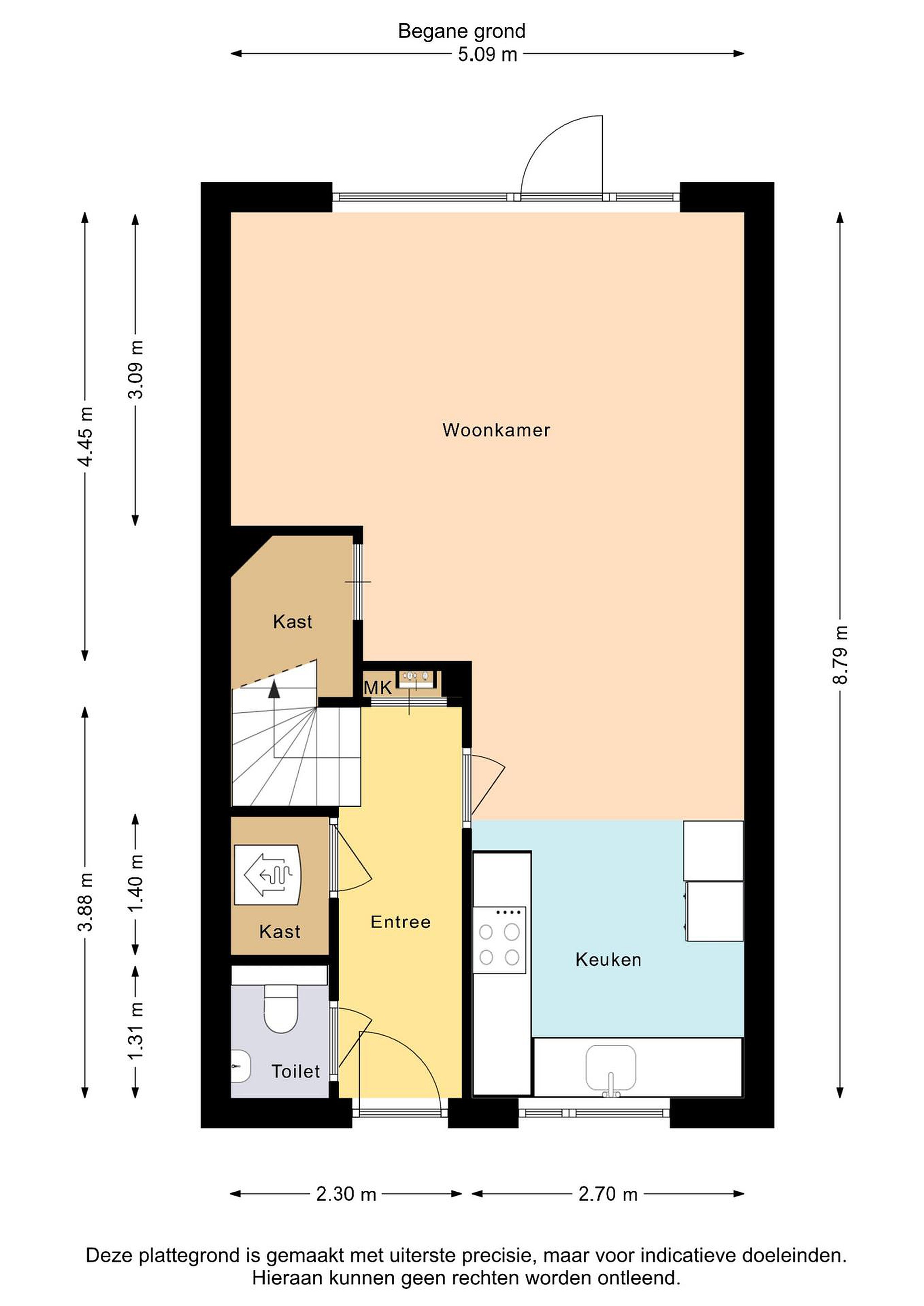 Begane grond entree/hal, kast met installatie, toilet, trapopgang, meterkast, tuingerichte woonkamer met groot raam en deur naar de tuin, ruime trapkast, moderne keuken voorzien van diverse inbouwapparatuur zoals: inductie kookplaat, combimagnetron en koelkast.