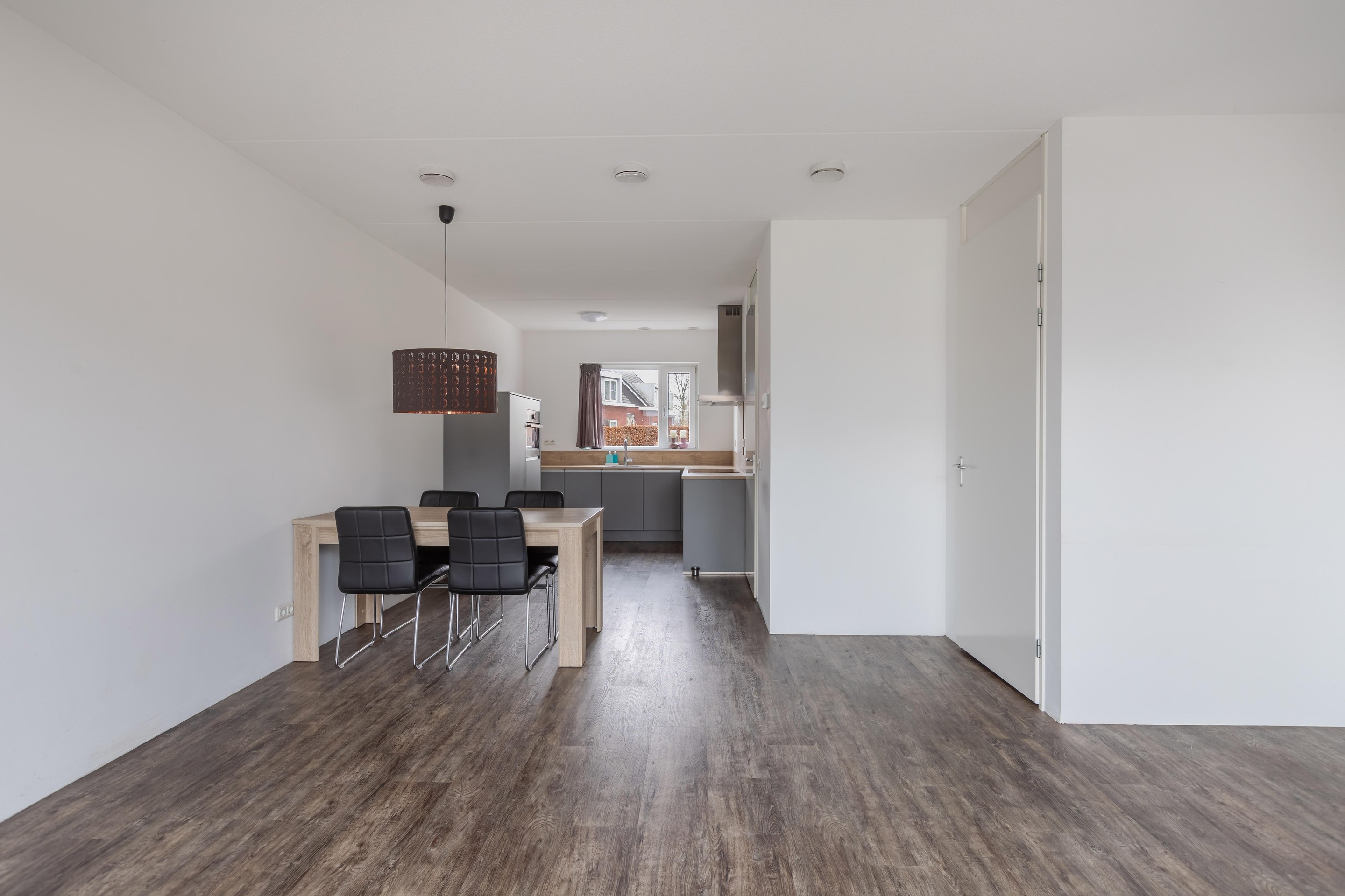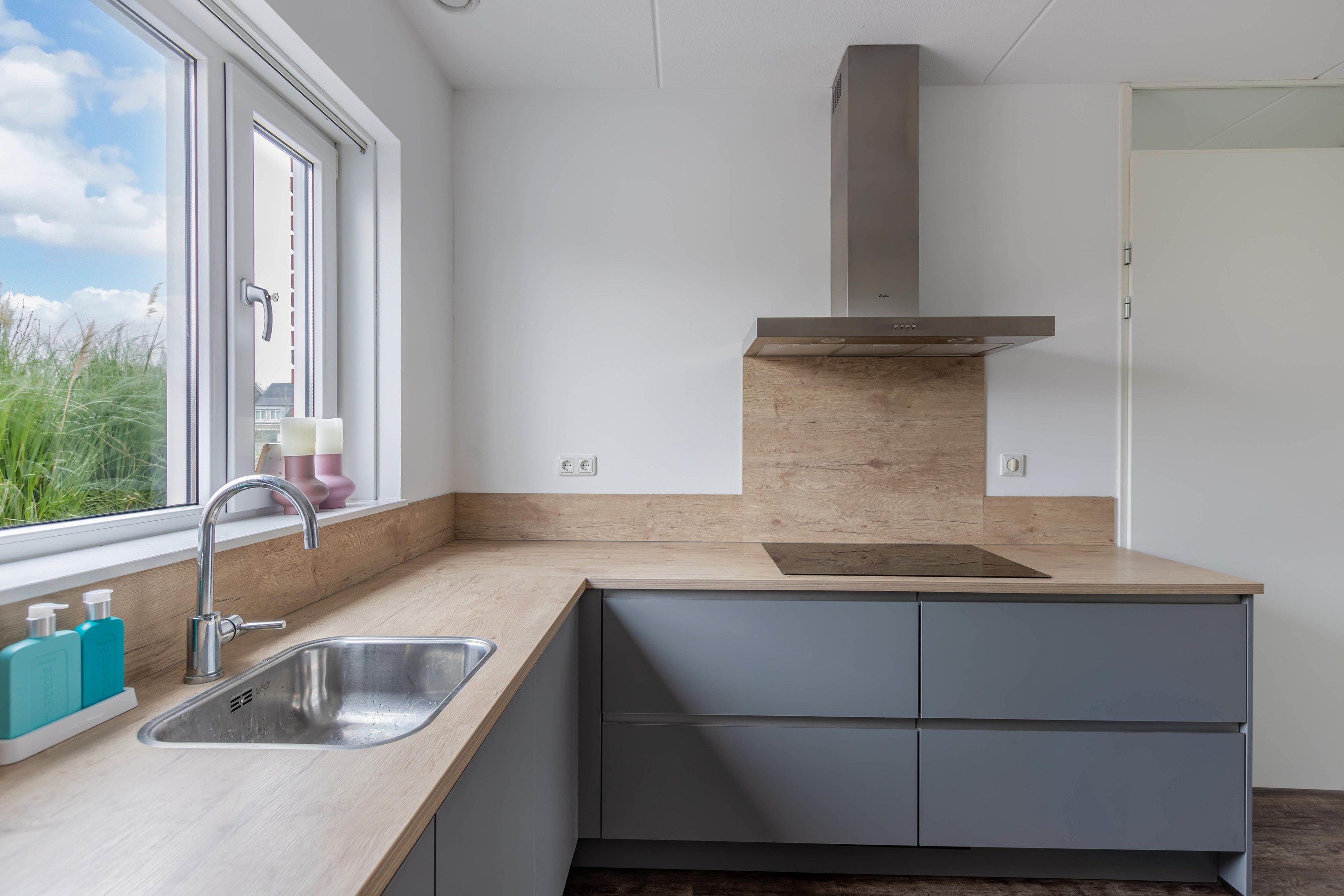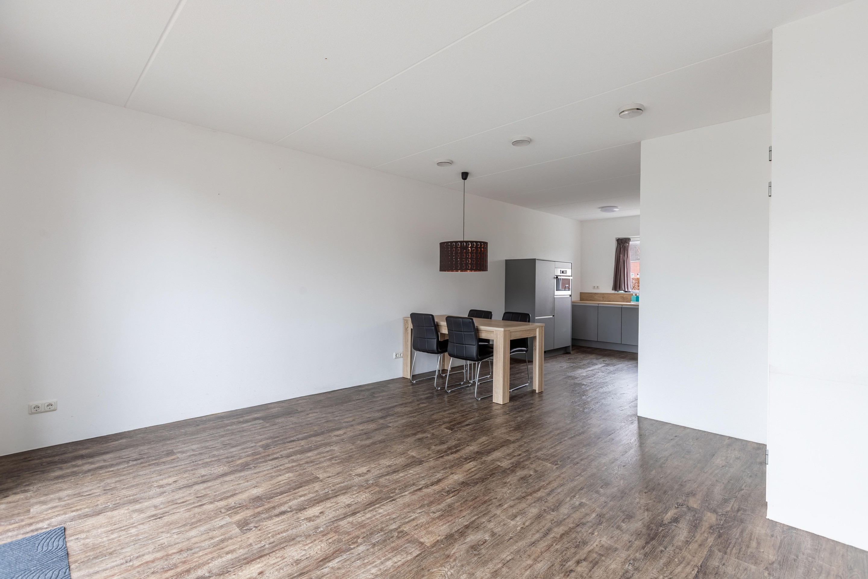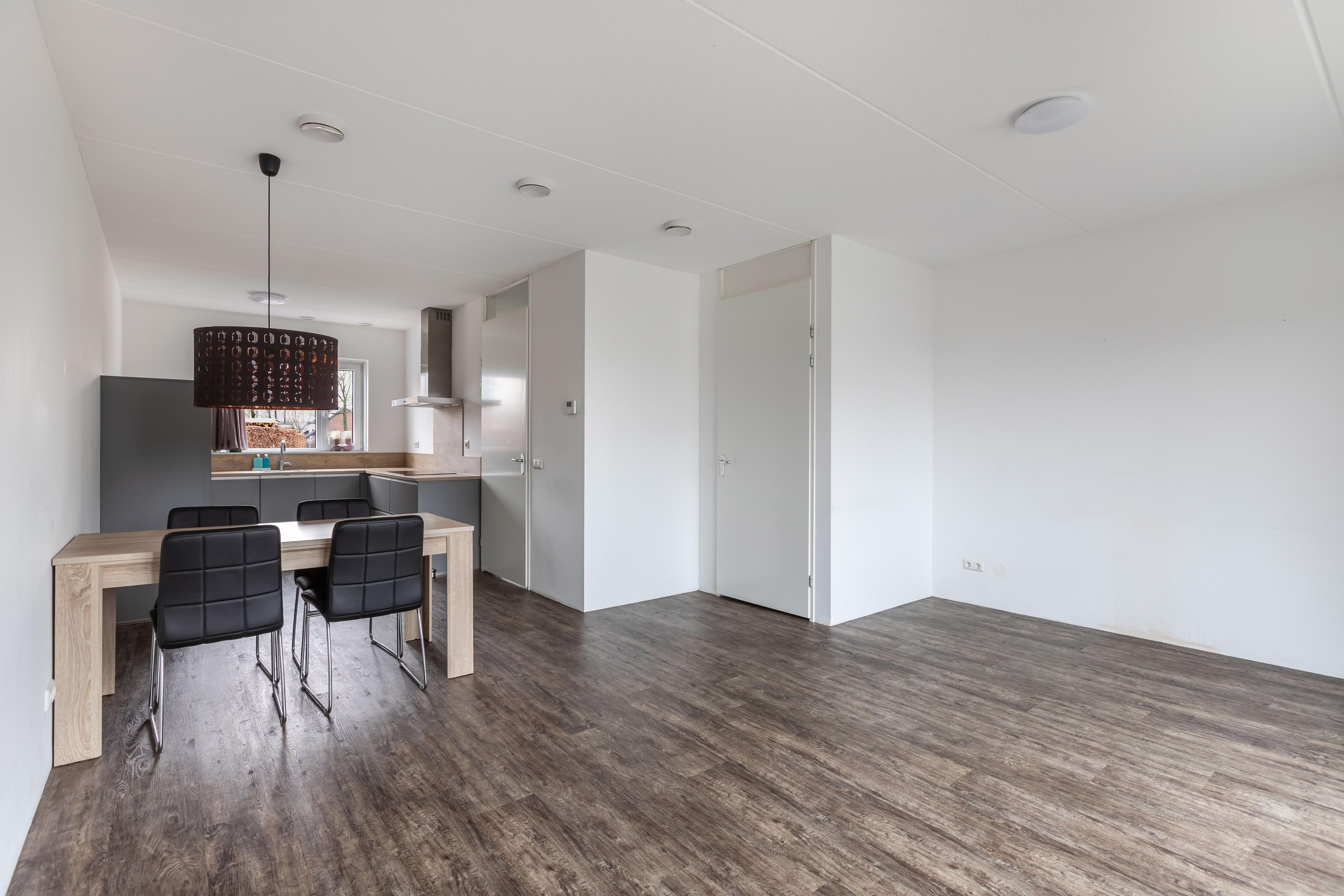 De tuingerichte woonkamer beschikt over een groot raam en een deur naar de royale tuin, waardoor er veel daglicht binnenvalt en je een prettige verbinding hebt met buiten. Aan de voorzijde bevindt zich de moderne keuken, een fijne plek om te koken met uitzicht op het vrije straatbeeld.