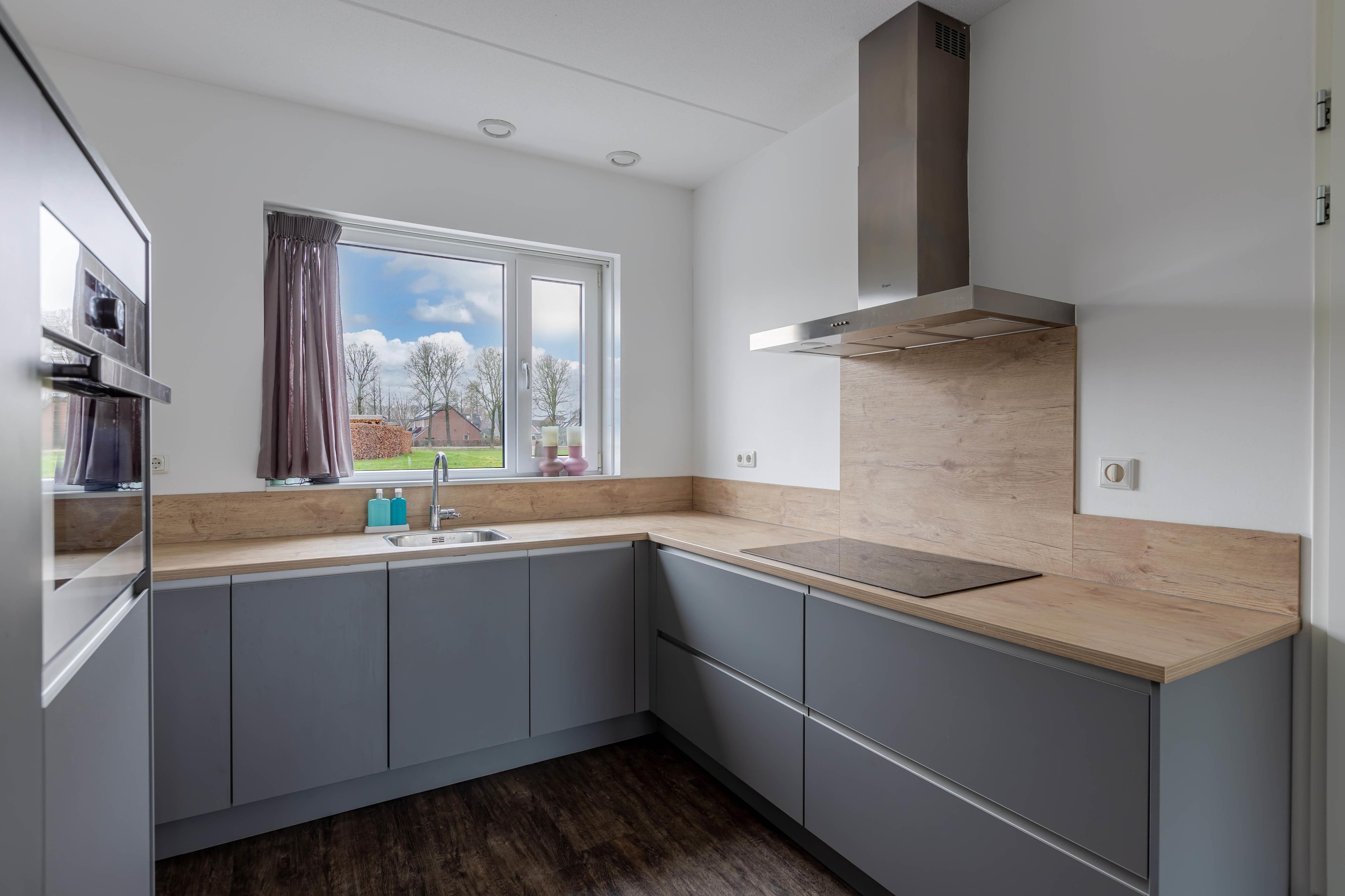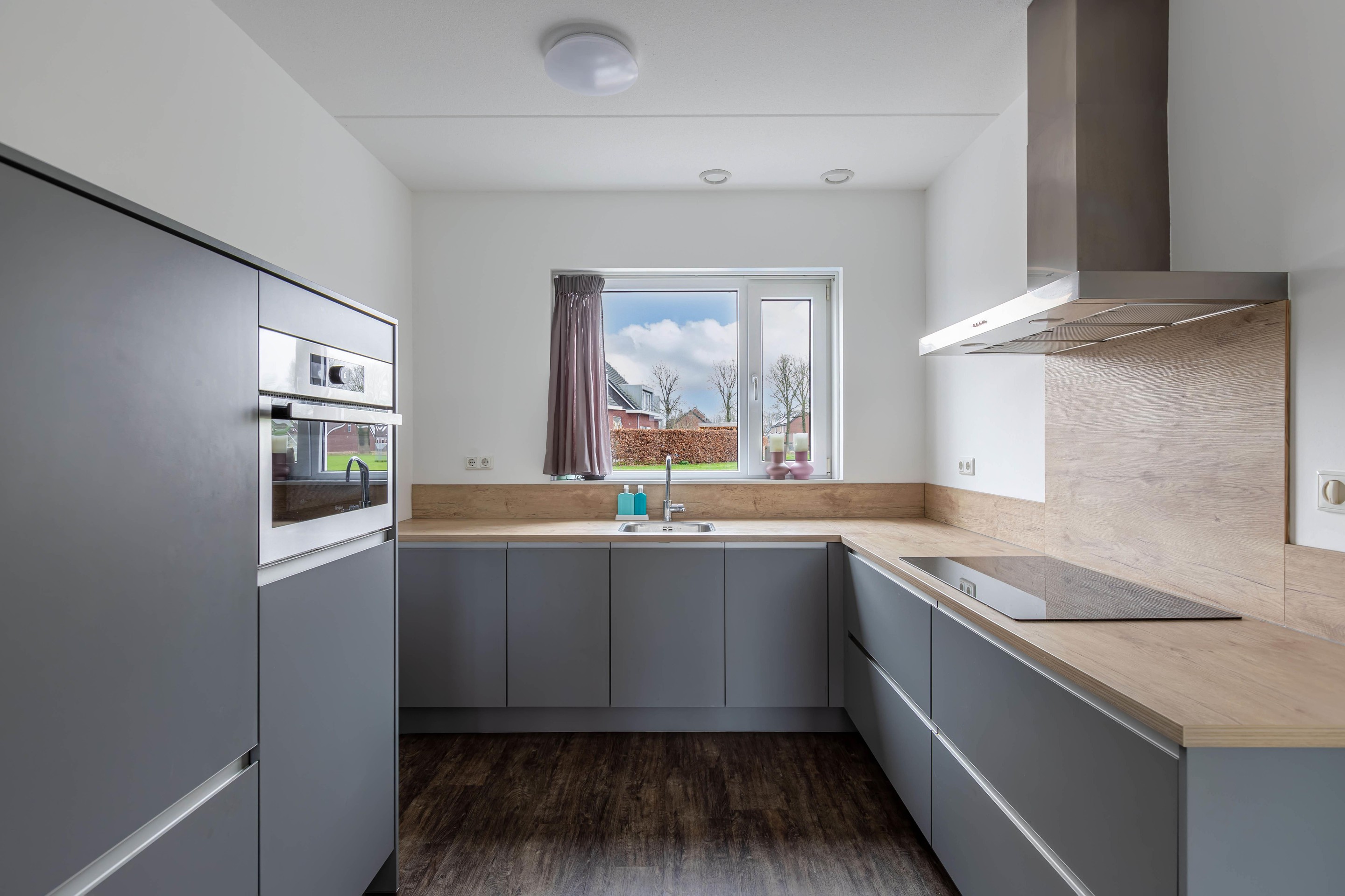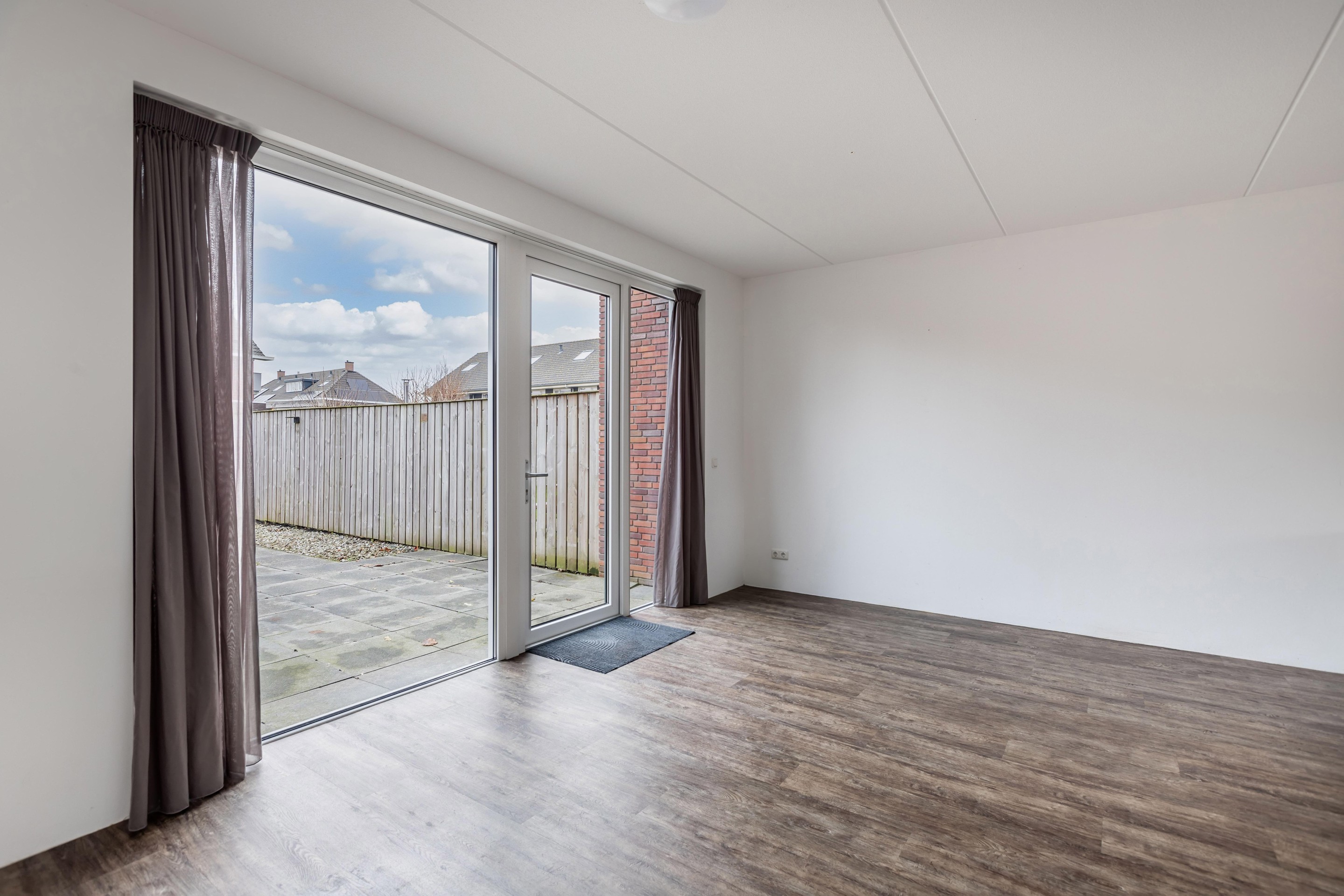 De tuingerichte woonkamer beschikt over een groot raam en een deur naar de royale tuin, waardoor er veel daglicht binnenvalt en je een prettige verbinding hebt met buiten. Aan de voorzijde bevindt zich de moderne keuken, een fijne plek om te koken met uitzicht op het vrije straatbeeld.