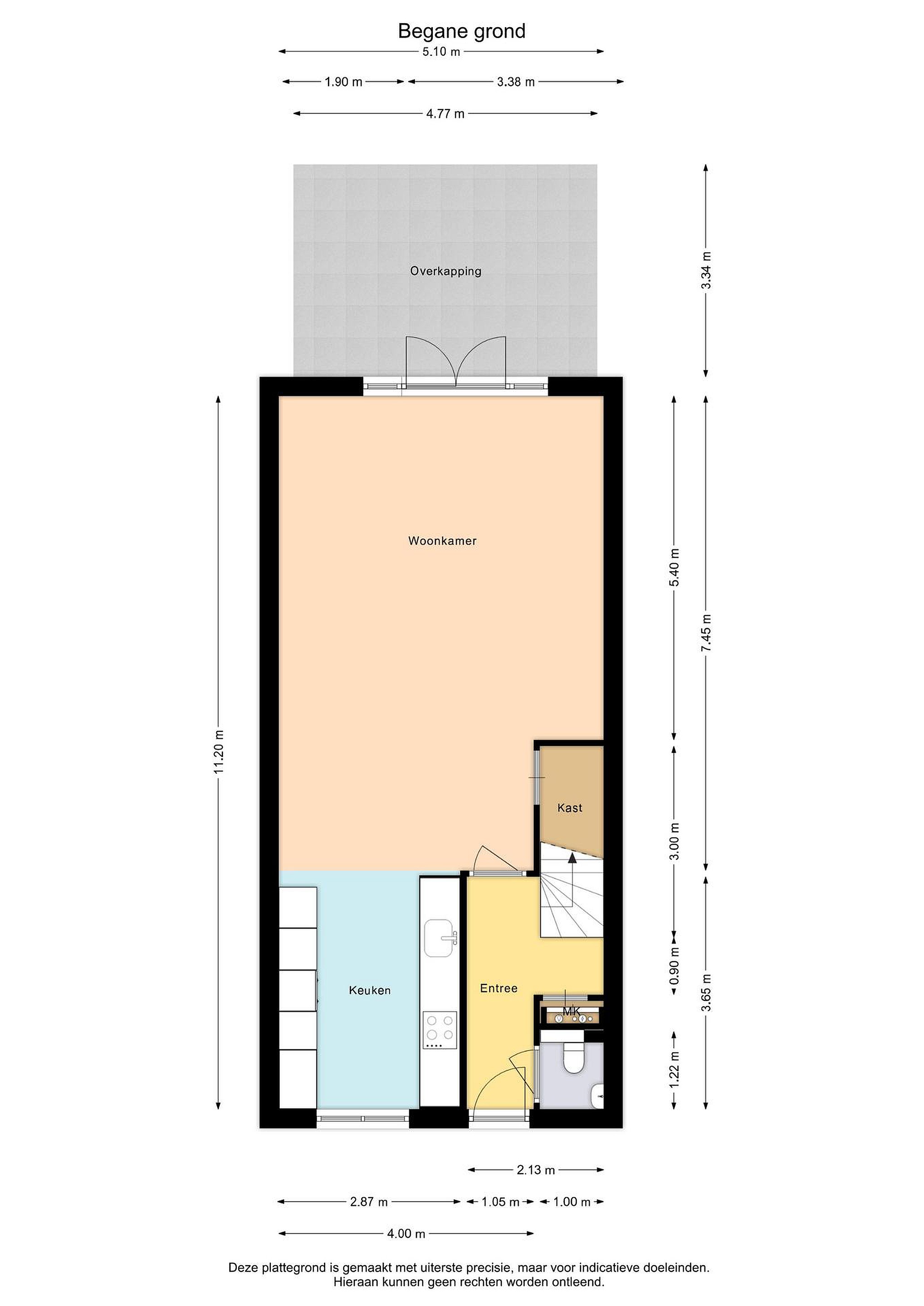 Begane grond entree/hal, toilet met fontein, meterkast, trapopgang, tuingerichte woonkamer met openslaande deuren naar de overkapping en tuin op het zuiden, moderne keuken met diverse inbouwapparatuur zoals: quoocker, vaatwasser, inductie kookplaat met afzuigkap, combi-oven en koelkast.