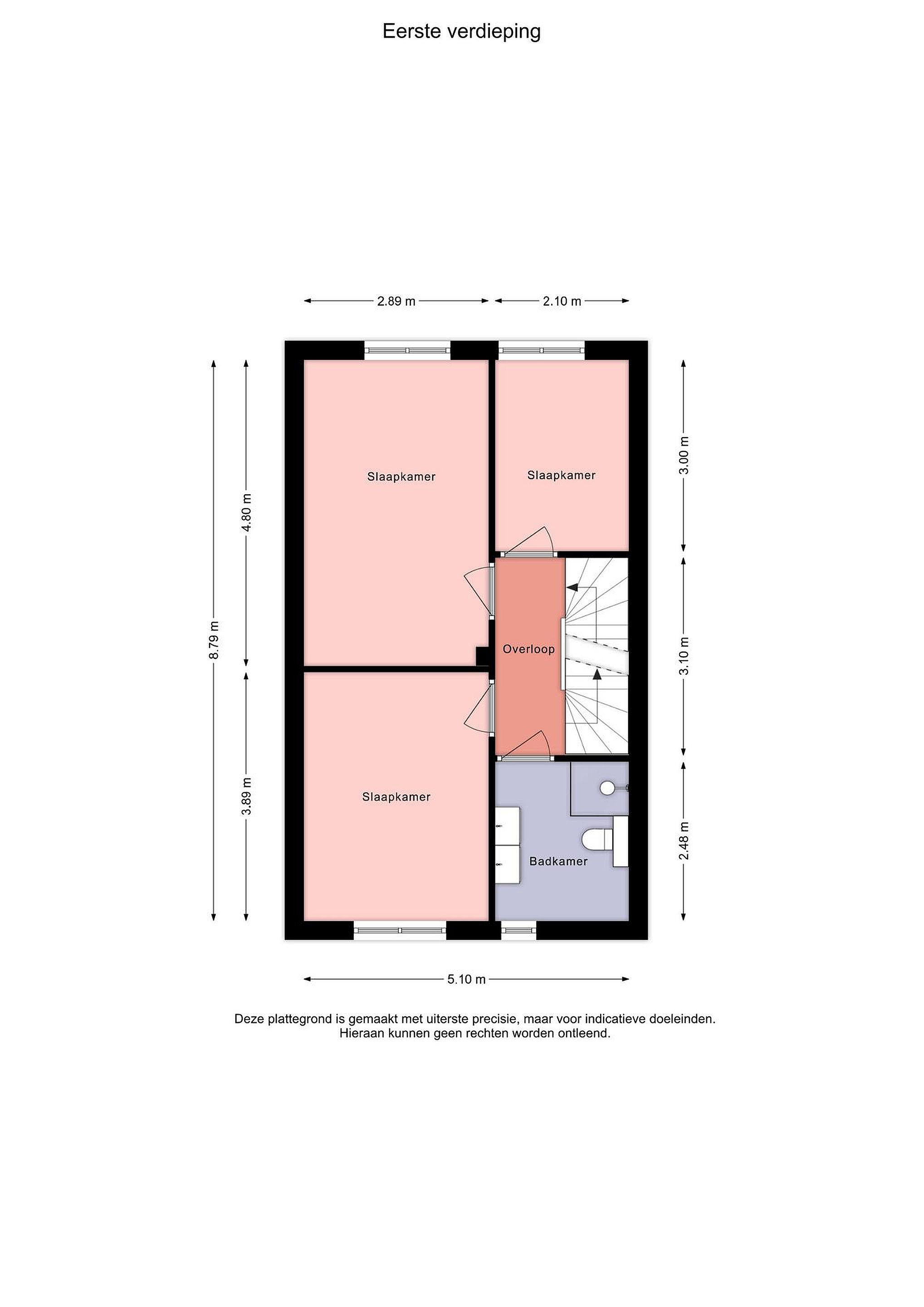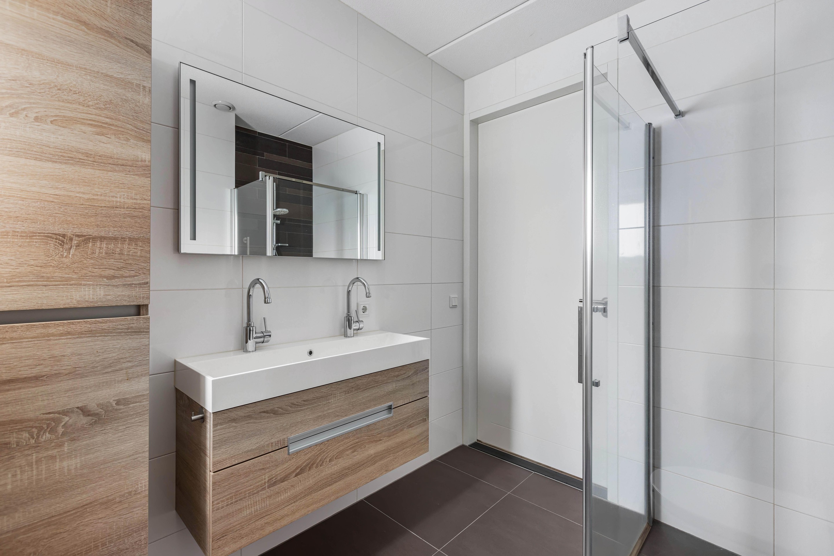 Eerste verdieping overloop, 3 slaapkamers en badkamer met toilet, dubbele wastafel en douche.