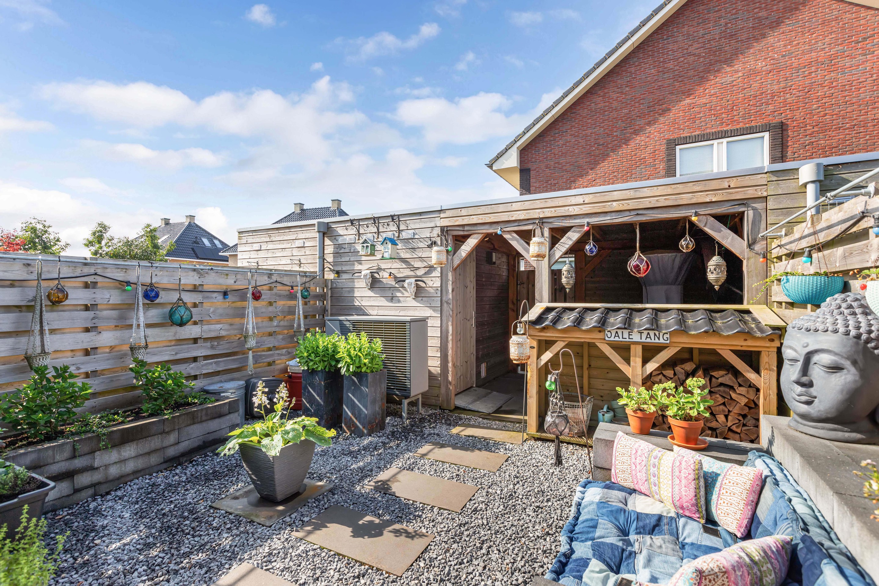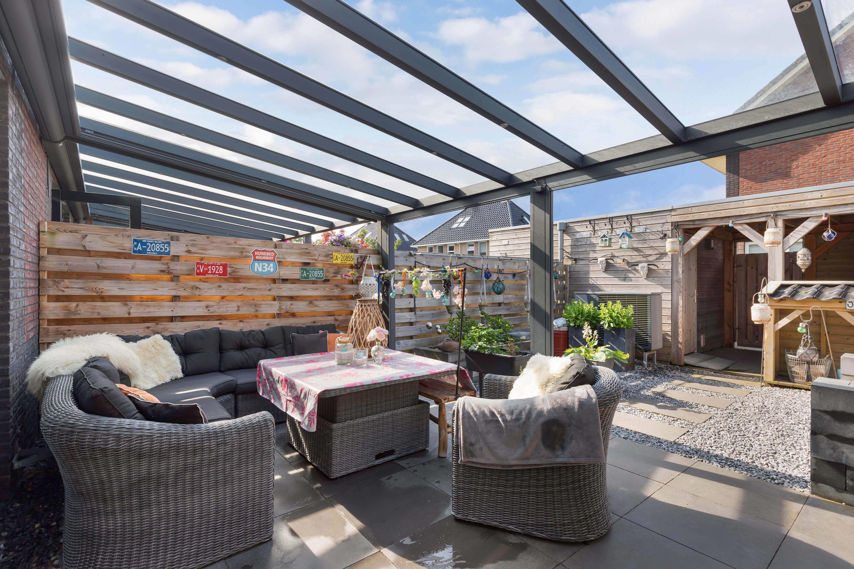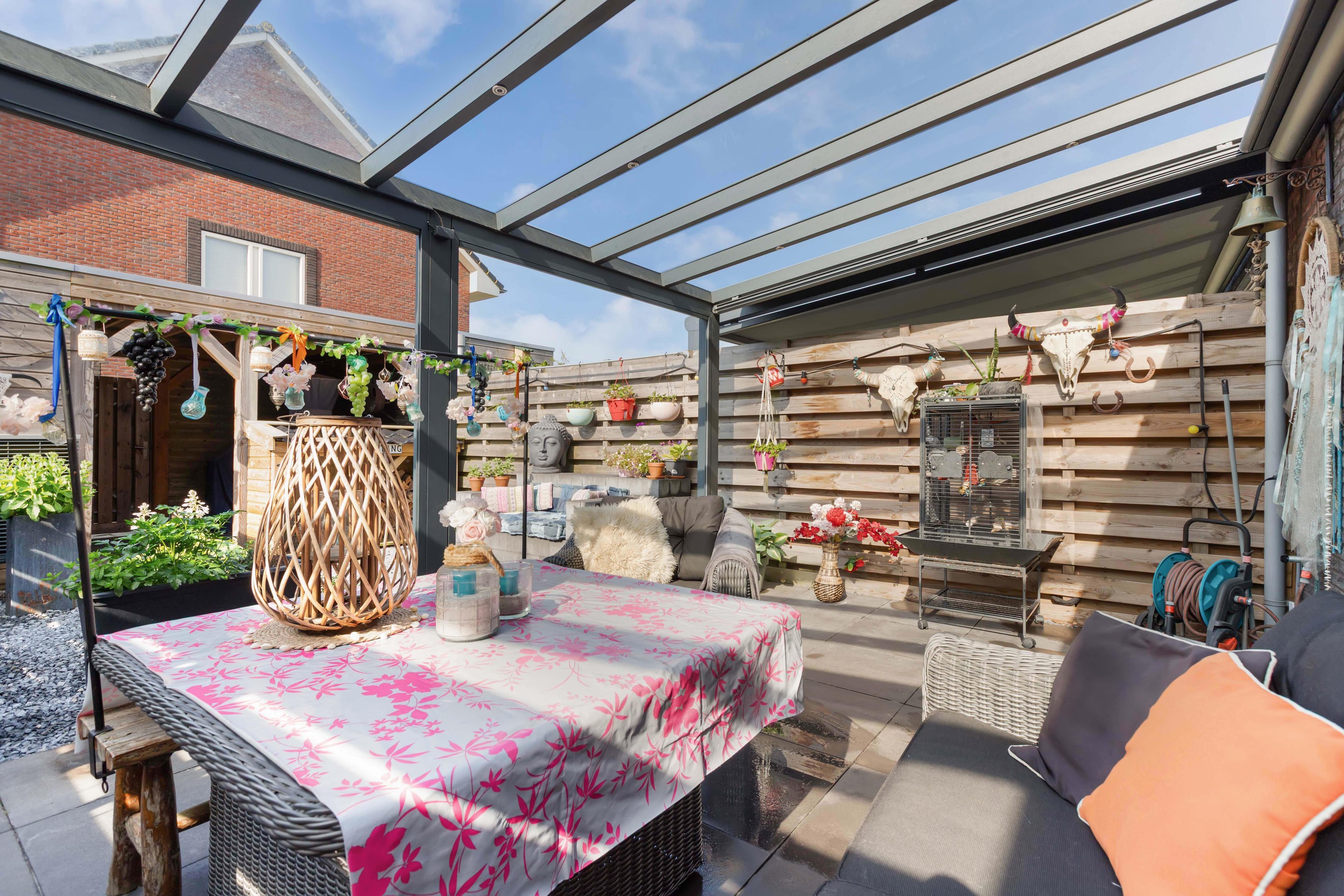 De achtertuin op het zuiden is een heerlijke plek om tot rust te komen. De overkapping direct aan de woning maakt het mogelijk om elk seizoen buiten te zitten, terwijl de vrijstaande berging met extra overkapping zorgt voor praktische opbergruimte.