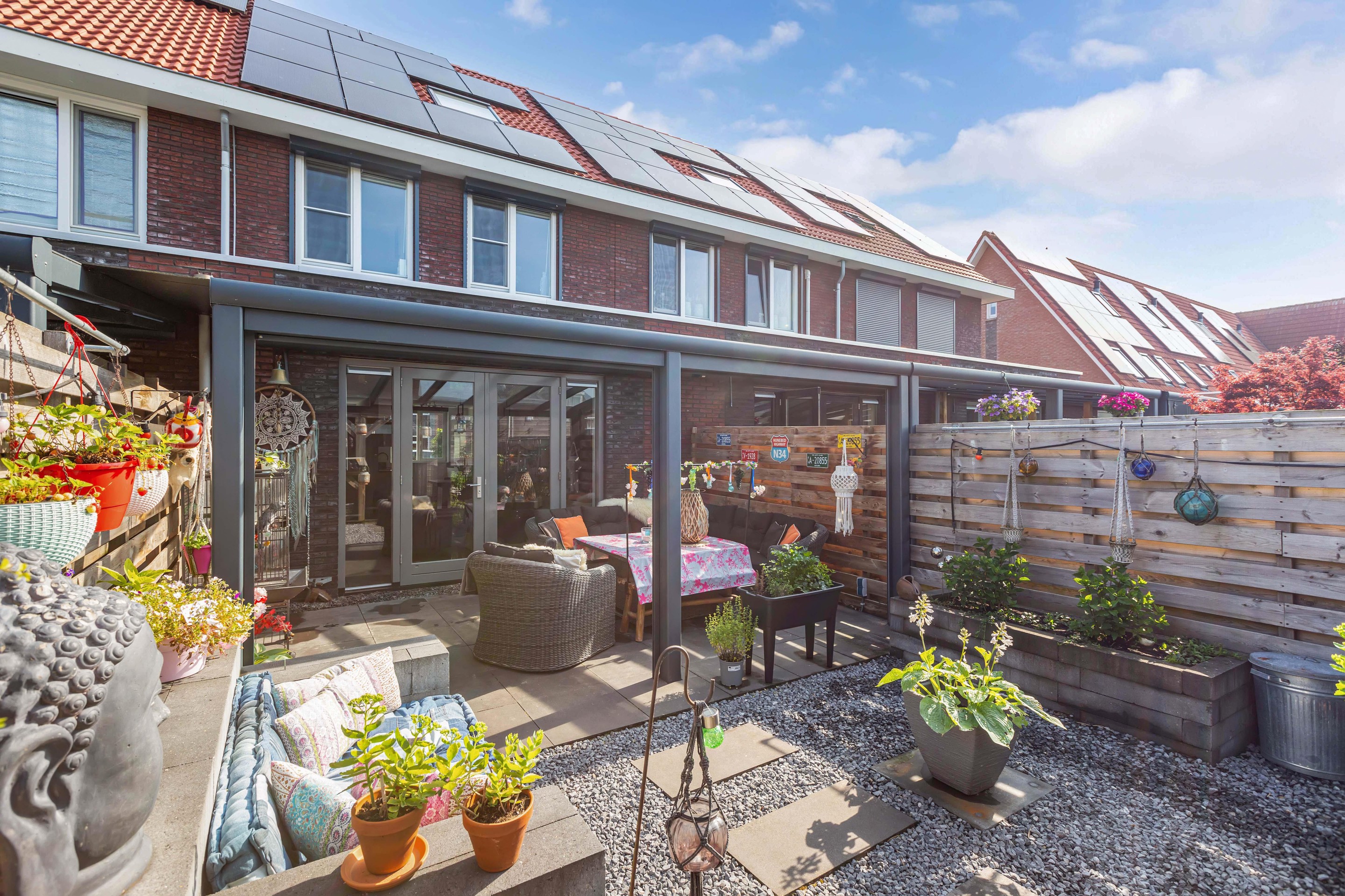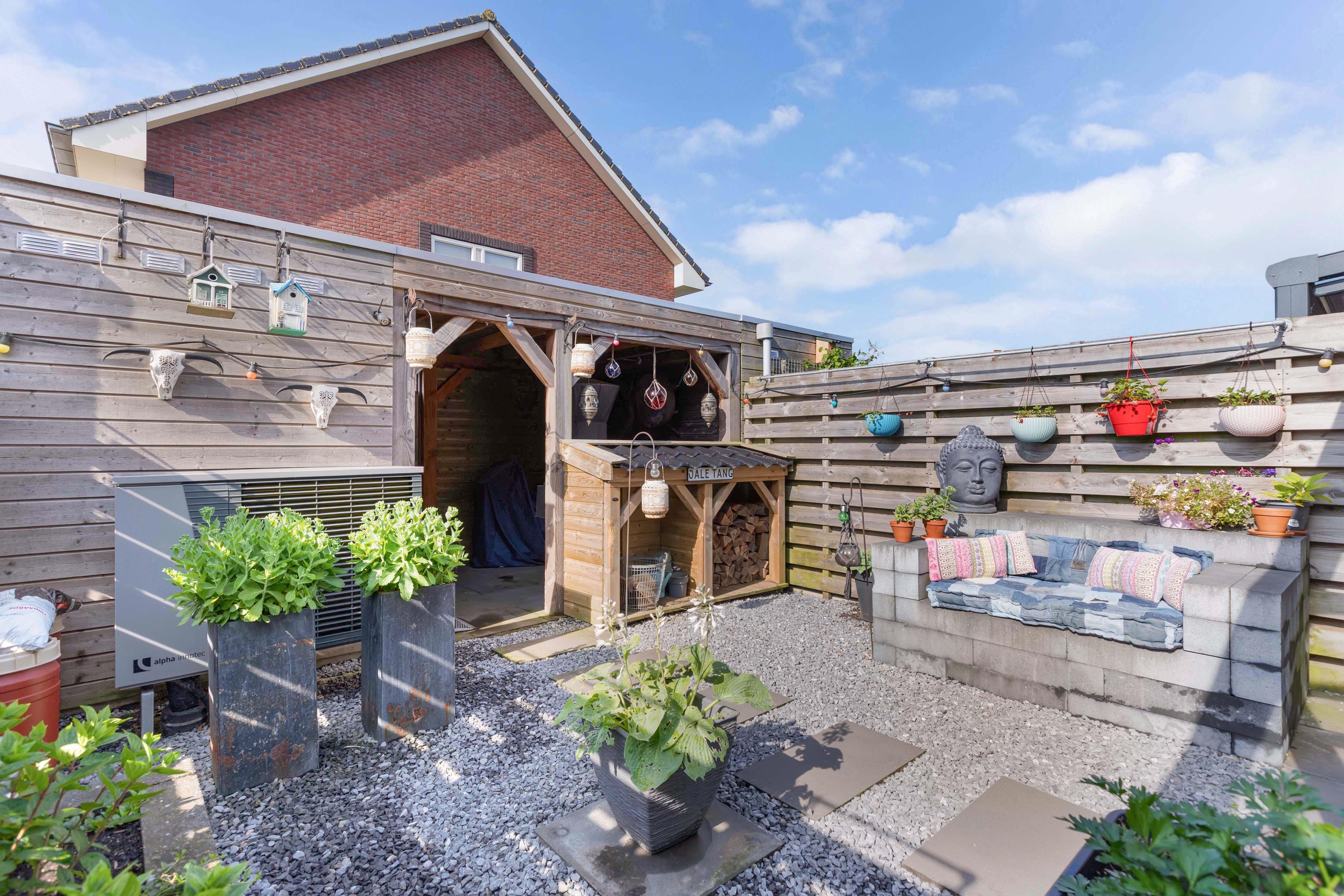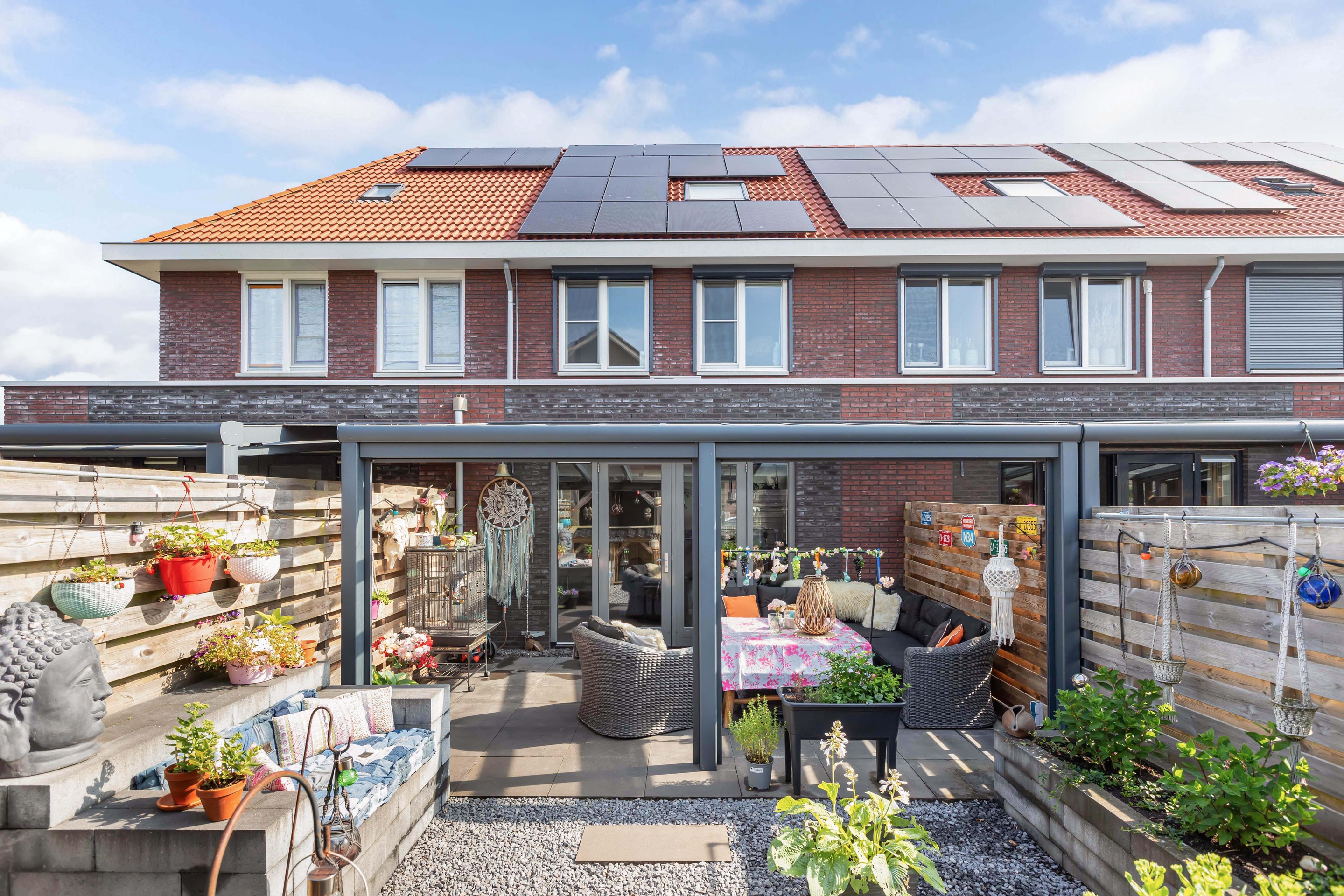 De achtertuin op het zuiden is een heerlijke plek om tot rust te komen. De overkapping direct aan de woning maakt het mogelijk om elk seizoen buiten te zitten, terwijl de vrijstaande berging met extra overkapping zorgt voor praktische opbergruimte.