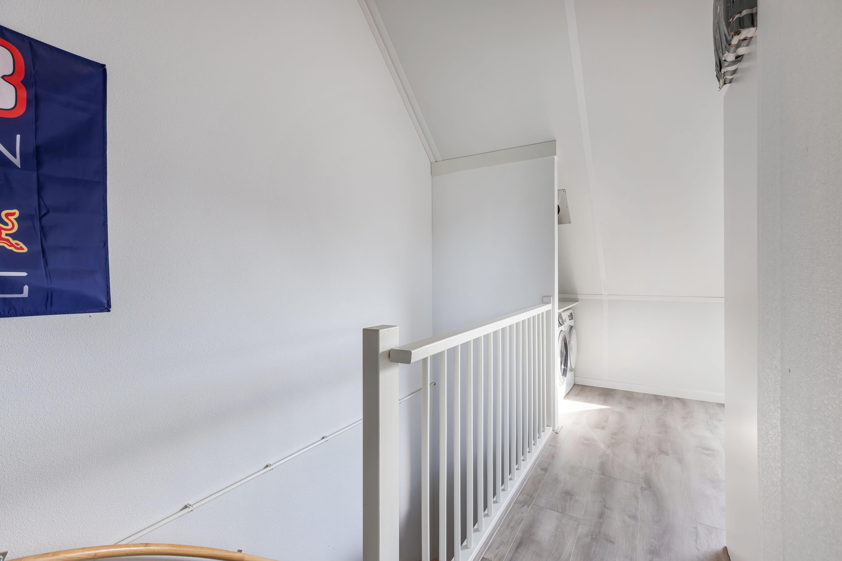 Tweede verdieping ruime overloop, slaapkamer en bergkasten.