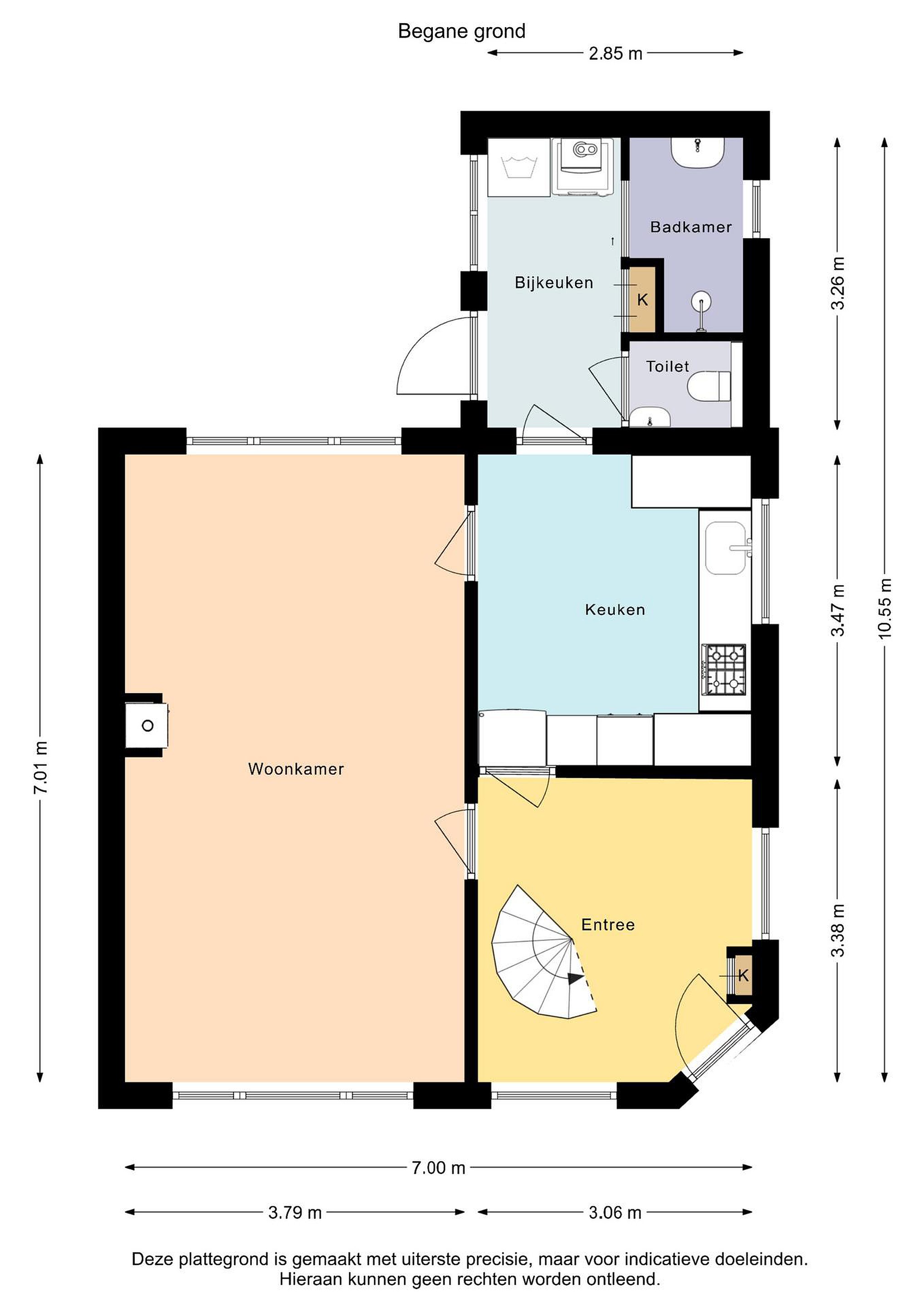 Begane grond entree/hal met trapopgang, lichte woonkamer met balkenplafond en houtkachel, gesloten keuken voorzien van inbouwapparatuur zoals; gasfornuis met afzuigkap, combi-oven en vaatwasser. Bijkeuken met witgoedaansluiting, cv-opstelling, toilet met fontein en badkamer met wastafel en douche.