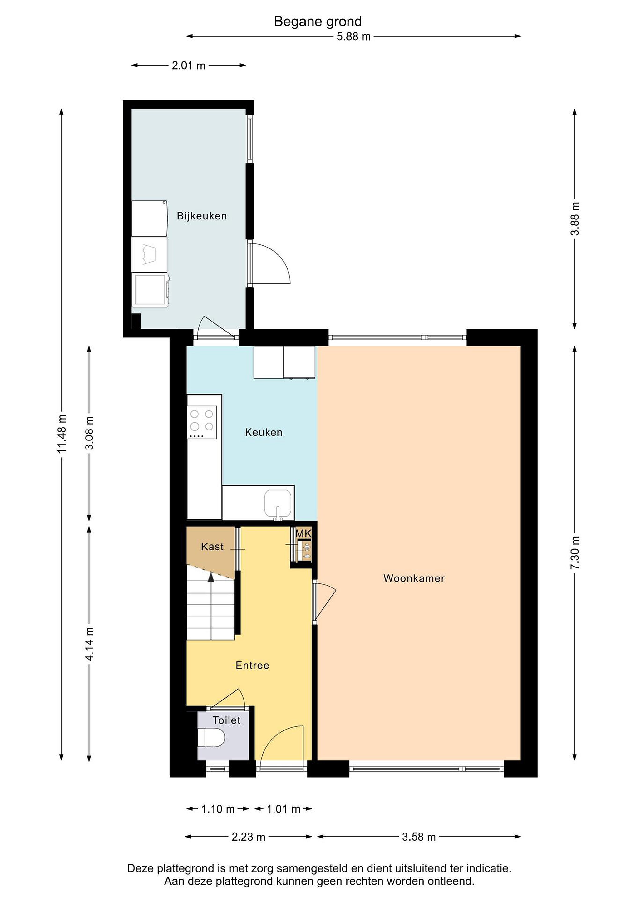 Begane grond Entree/hal, modern toilet, trapopgang, trapkast, meterkast, lichte doorzon woonkamer, moderne hoekkeuken met diverse inbouwapparatuur zoals: inductie kookplaat met afzuigkap, oven, vaatwasser en koelkast. Via de keuken kom je in de bijkeuken met deur naar de achtertuin.